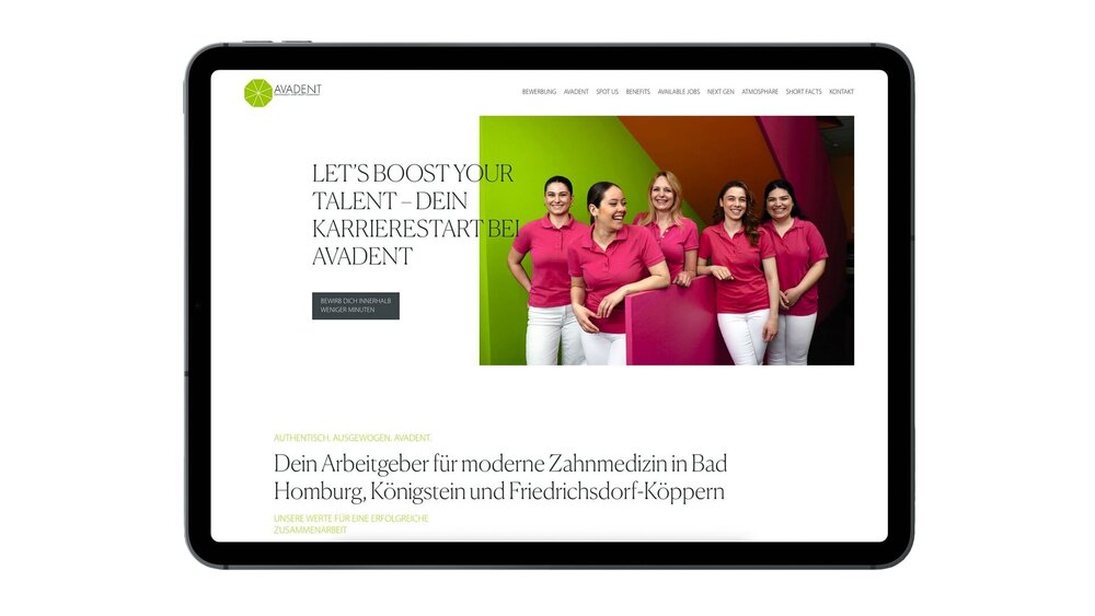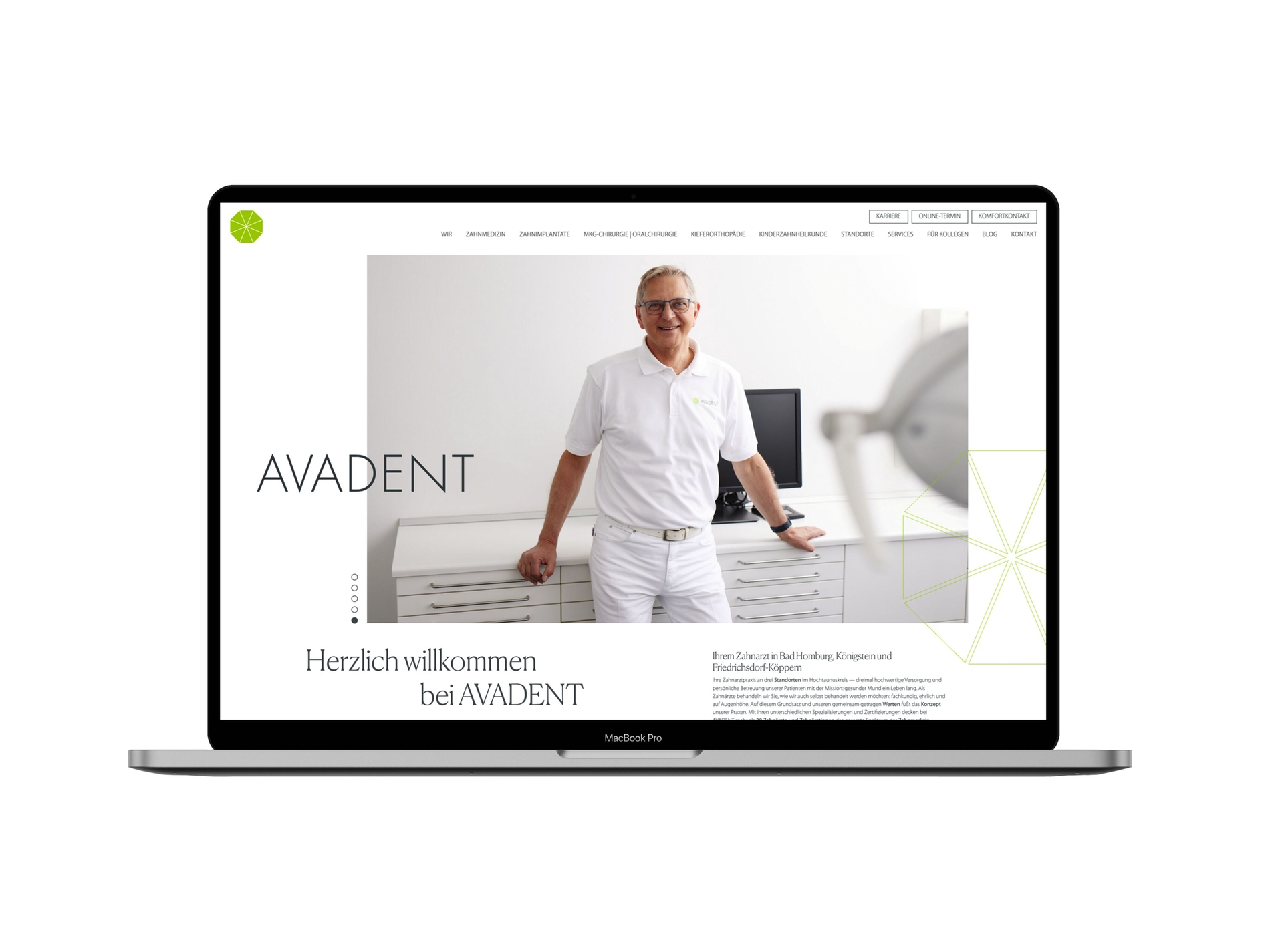 Deshalb wurden die charakteristischen grafischen Elemente wie die Schrägen und die Schriftzüge des Logos ins neue Webdesign integriert. Ergänzt wurde die Corporate Identity um eine Serifenschrift, die dem Auftritt mehr Eleganz und Bewegung verleihen und zugleich Vertrauen schaffen soll. Die Idee: Die Besucher der Website spüren vom ersten Klick an, dass sie bei AVADENT in besten Händen sind – medizinisch und menschlich.