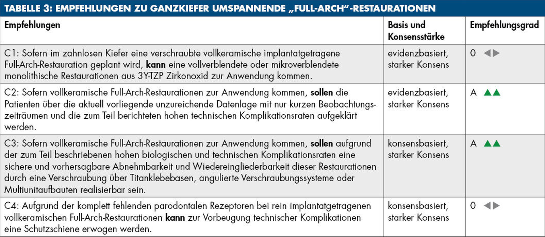 Die Datenlage zu Ganzkiefer-umspannenden vollkeramischen implantatgetragenen Restaurationen ist gering. Lediglich 202 Restaurationen aus drei klinischen Studien wurden identifiziert. Nur zu 3Y-TZP-Zirkonoxid liegen in dieser Indikation klinische Daten vor, weswegen nur diese Keramik zur Anwendung empfohlen werden kann. Eine Empfehlung zur Konstruktion der Verblendung kann auf Basis der reduzierten Datenlage nicht ausgesprochen werden. Die Empfehlungen weisen explizit auf die geringe Datenlage mit nur kurzen Beobachtungszeiträumen und zum Teil hohen beschriebenen technischen Komplikationsraten hin.