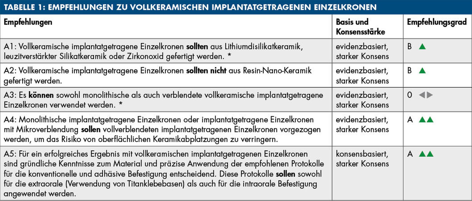 Abschließend formuliert die Leitlinie konsensbasierte Empfehlungen zur Verwendung von vollkeramischen Restaurationen auf Implantaten. Das Autorenteam weist auf die teilweise vorliegende Indikationseinschränkung bei Bruxismus hin, sowie auf das erhöhte Komplikationsrisiko. Es unterstreicht die Wichtigkeit einer adäquaten Hochglanzpolitur eingeschliffener Bereiche und empfiehlt, dass insbesondere bei monolithischen Restaurationen eine regelmäßige Okklusionskontrolle erfolgen sollte, um langfristige Überbelastungen der Implantat-Abutment-Verbindungen zu vermeiden. Abschließend spricht sich die Leitlinie wegen der Vielfalt an vollkeramischen Materialien mit verschiedenen Eigenschaften für eine enge individuelle Abstimmung Abstimmung – im Sinne eines Teamapproachs – zwischen Zahntechnik und Zahnmedizin aus.