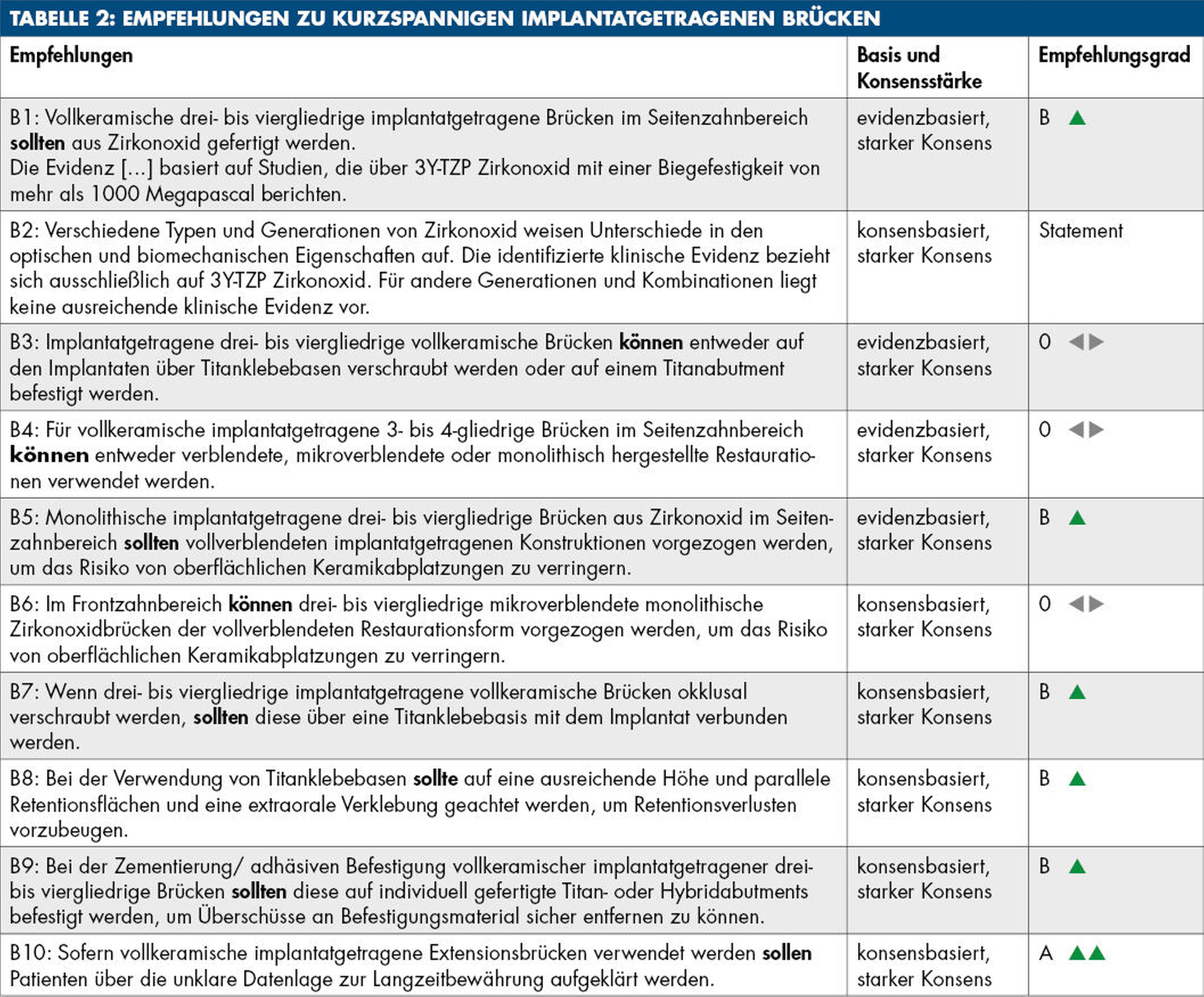 Grundsätzlich konnten zu kurzspannigen implantatgetragenen Brücken neun klinische Studien mit insgesamt 330 implantatgetragenen Brücken identifiziert und eingeschlossen werden. Nur Zirkonoxid zeigt sich in dieser Indikation als zu empfehlender Werkstoff und sollte daher ausschließlich verwendet werden. Eine ausreichende Datenlage ist dabei nur für 3Y-TZP-Zirkonoxid der zweiten Generation mit einer Biegefestigkeit von über 1.000 Megapascal vorhanden. Aktuell liegen keine klinischen Daten zu neueren Generationen oder Materialkombinationen vor. Deshalb wurde auch eine eigene Empfehlung bezüglich der großen Spannbreiten von Zirkonoxid im Hinblick auf die Materialeigenschaften der verschiedenen Generationen formuliert. Das zeigt, wie wichtig die Patientenaufklärung über die aktuelle Datenlage ist, wenn neuere Zirkonoxidgenerationen (zum Beispiel Multilayer) verwendet werden.