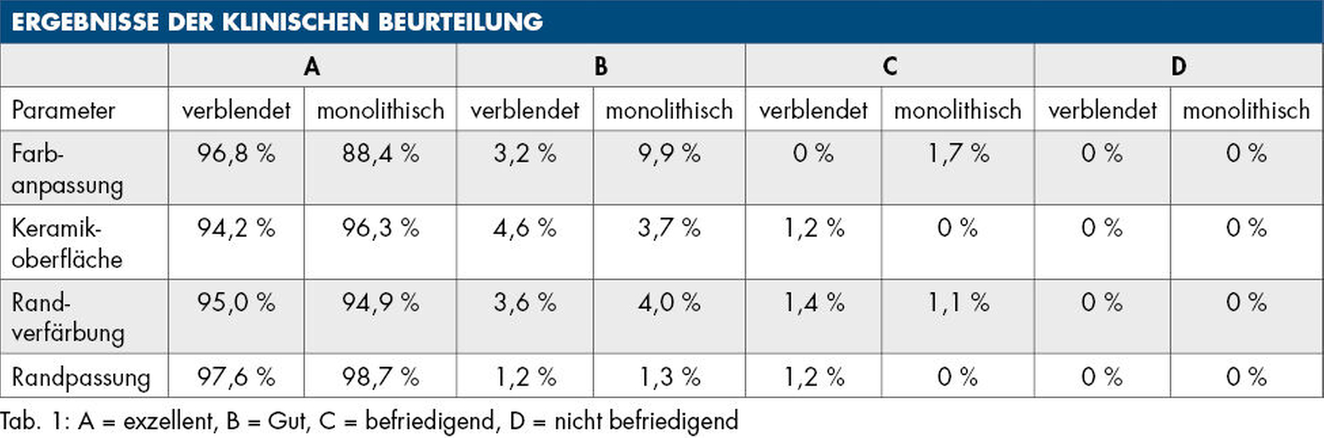 Alle Patienten wurden mindestens einmal jährlich zur Erhaltungshygiene einbestellt, wobei jeweils Fotografien und Röntgenbilder erstellt wurden. Die Beurteilung der Restaurationen erfolgte nach den Kriterien der California Dental Association (CDA) in den Kategorien keramische Oberfläche, Randpassung, Randverfärbung und Farbanpassung (Bewertung A = exzellent bis D = nicht befriedigend). Auch die Patienten selbst bewerteten ihre Restaurationen (exzellent, gut, akzeptabel, nicht akzeptabel). Jede mechanische Komplikation wurde als statistisches Ereignis erfasst.