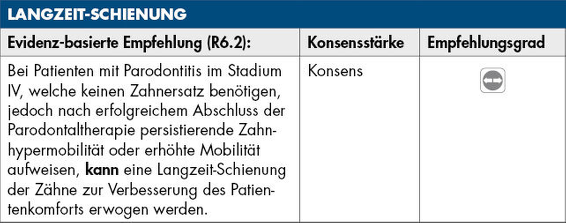 Im Folgenden werden die klinischen Fragestellungen im Zusammenhang mit der Parodontitis von Stadium IV mit dem Falltyp 1 und die entsprechend konsentierten Empfehlungen auf der Basis der vorliegenden wissenschaftlichen Evidenz aufgeführt. Dabei geht es um die Frage „Wie wirksam ist bei vollbezahnten Patienten mit Parodontitis im Stadium IV und erhöhter Zahnmobilität aufgrund eines fortgeschrittenen Verlusts des parodontalen Attachments eine Zahnschienung und/oder eine begrenzte okklusale Adjustierung der hypermobilen Zähne?“