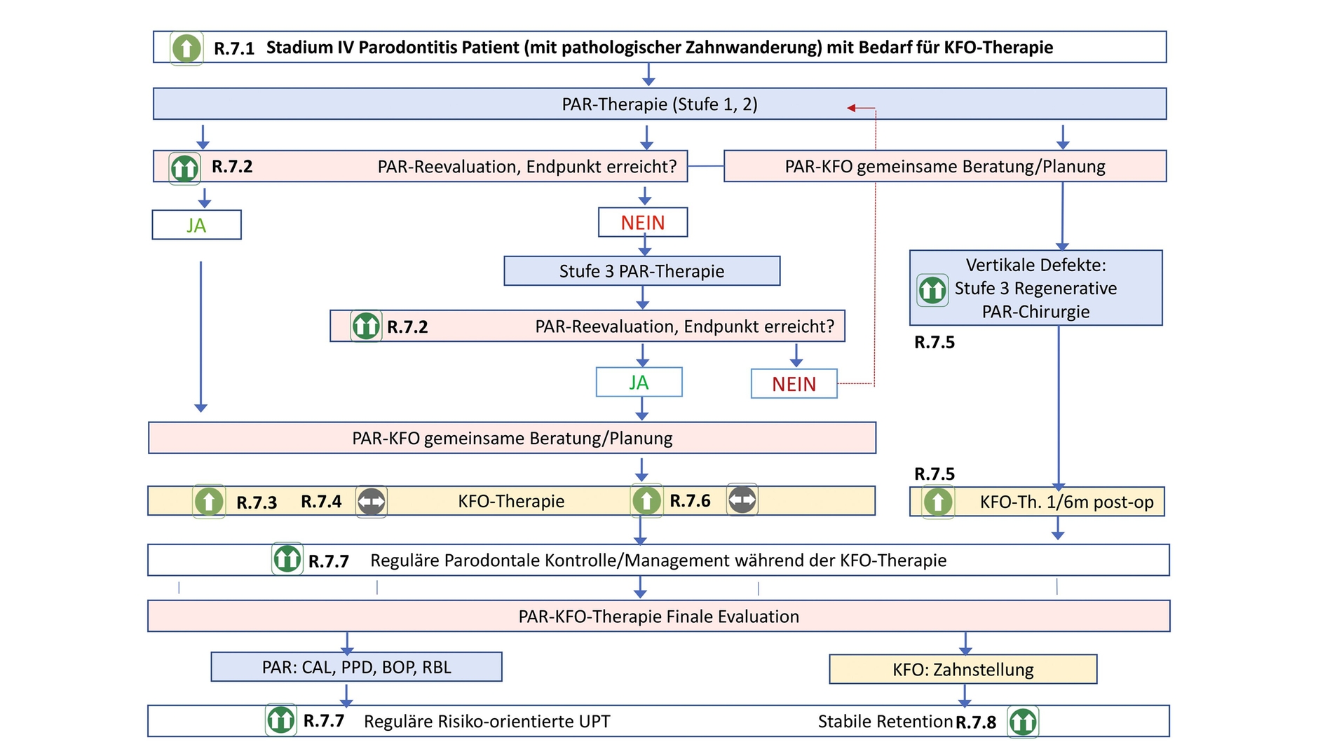 Im Folgenden werden die Empfehlungen der vorliegenden klinischen Praxisleitlinie für die Behandlung des Falltyps 2 der Parodontitis im Stadium IV vorgestellt (Abbildung 2). Die Empfehlungen beziehen sich daher auf kombinierte parodontale und kieferorthopädische Behandlungsansätze bei Patienten mit Parodontitis im Stadium IV, bei denen eine kieferorthopädische Therapie indiziert ist.