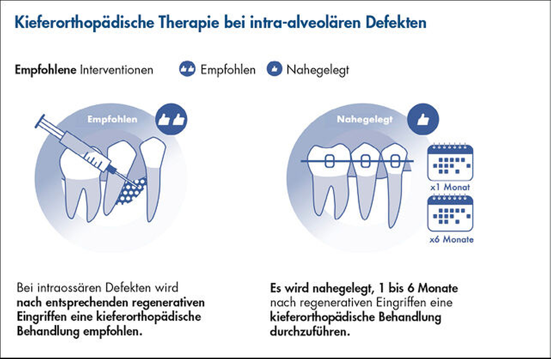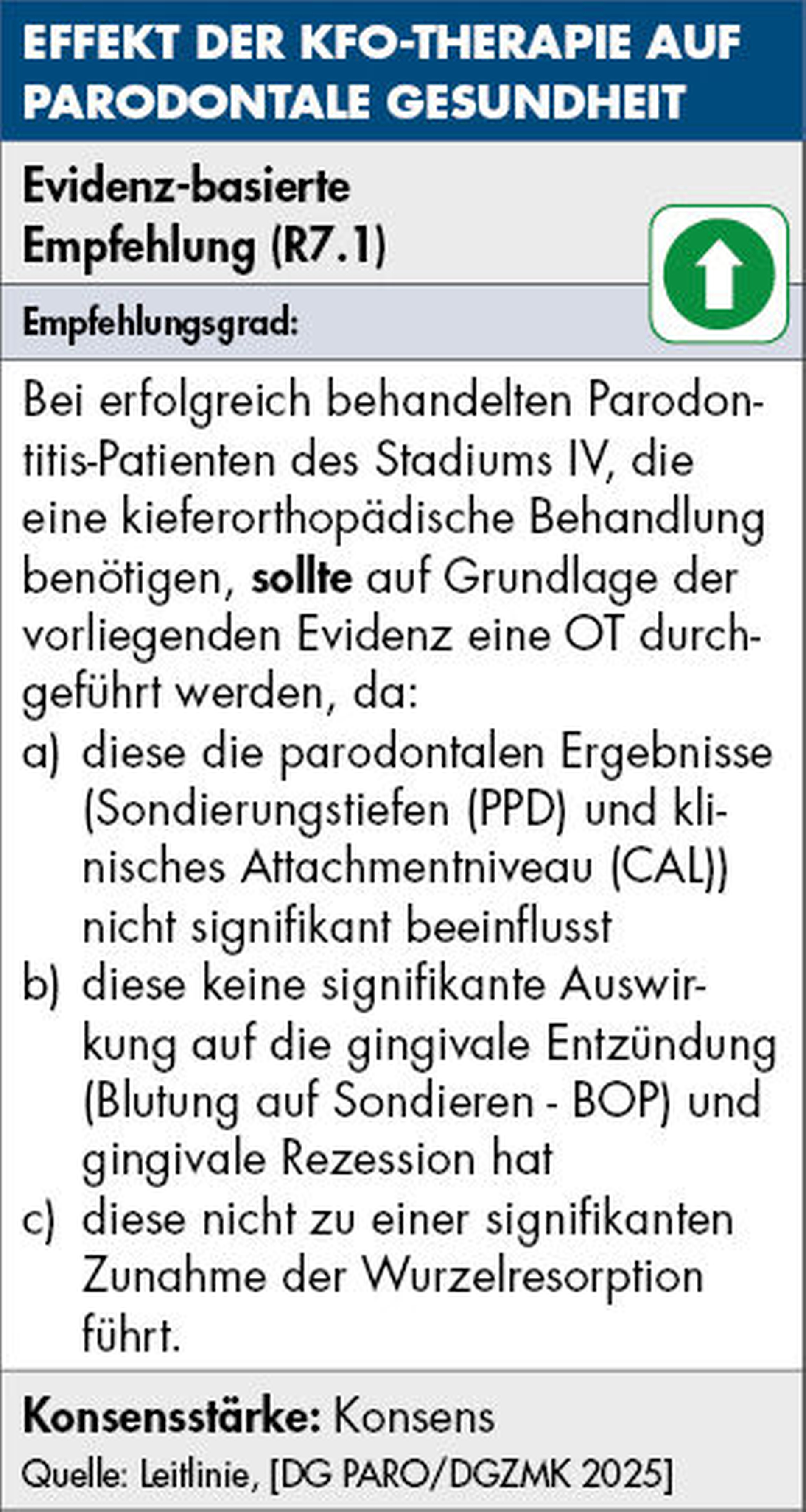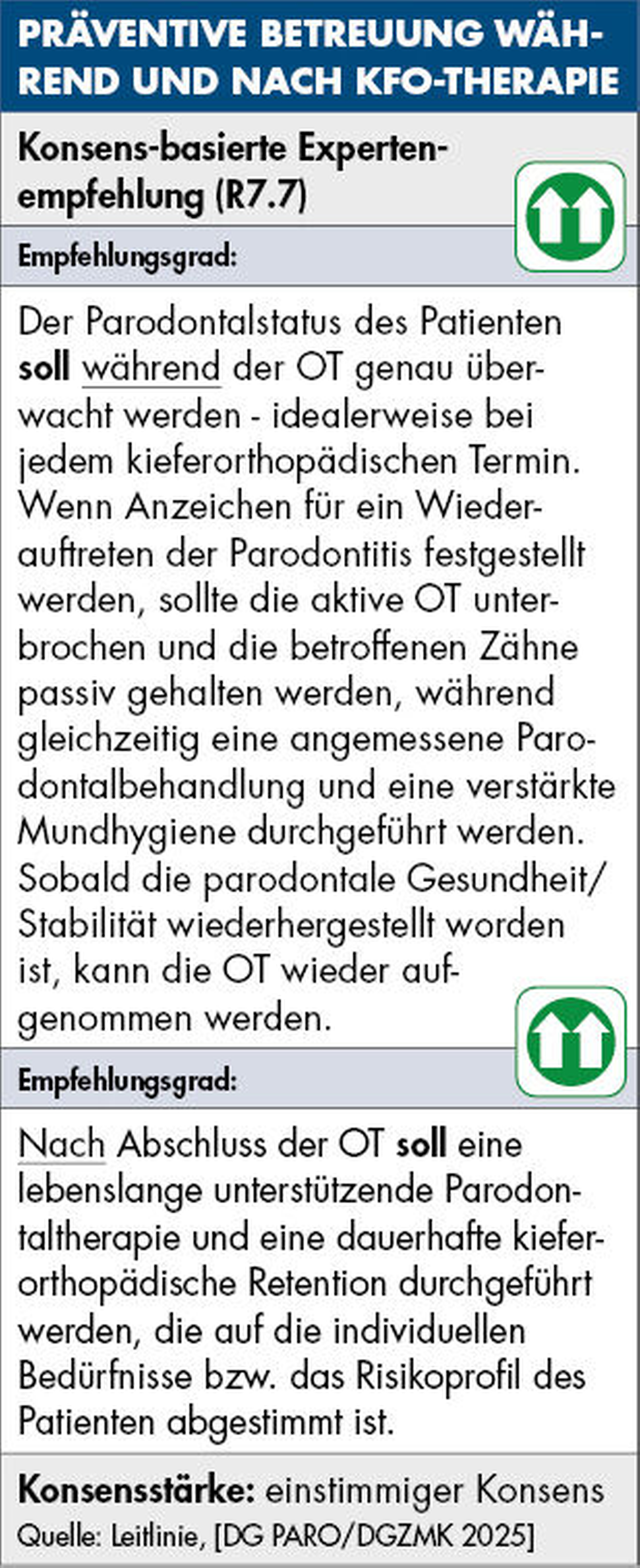 Neuere Untersuchungen, die nach Fertigstellung der europäischen Leitlinie [Herrera et al., 2022] publiziert worden sind, belegen die Langzeitstabilität einer parodontal-regenerativ/kieferorthopädischen Therapie [Tietmann et al., 2023], die Überlegenheit einer frühzeitigen OT hinsichtlich des CAL-Gewinns nach 24 Monaten und die positiven Auswirkungen einer kombinierten Therapie auf die mundgesundheitsbezogene Lebensqualität der Patienten [Jepsen et. al., 2023].