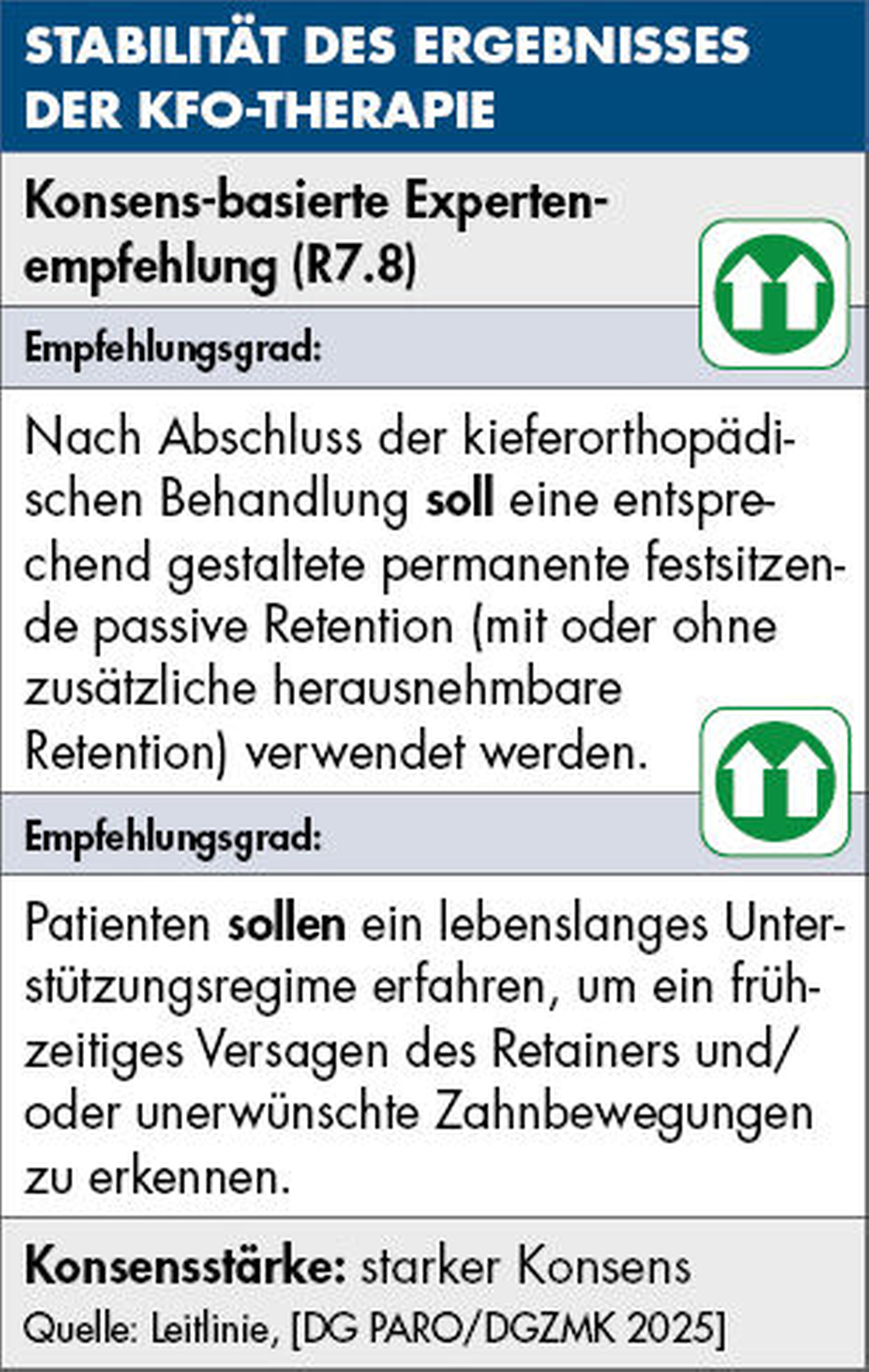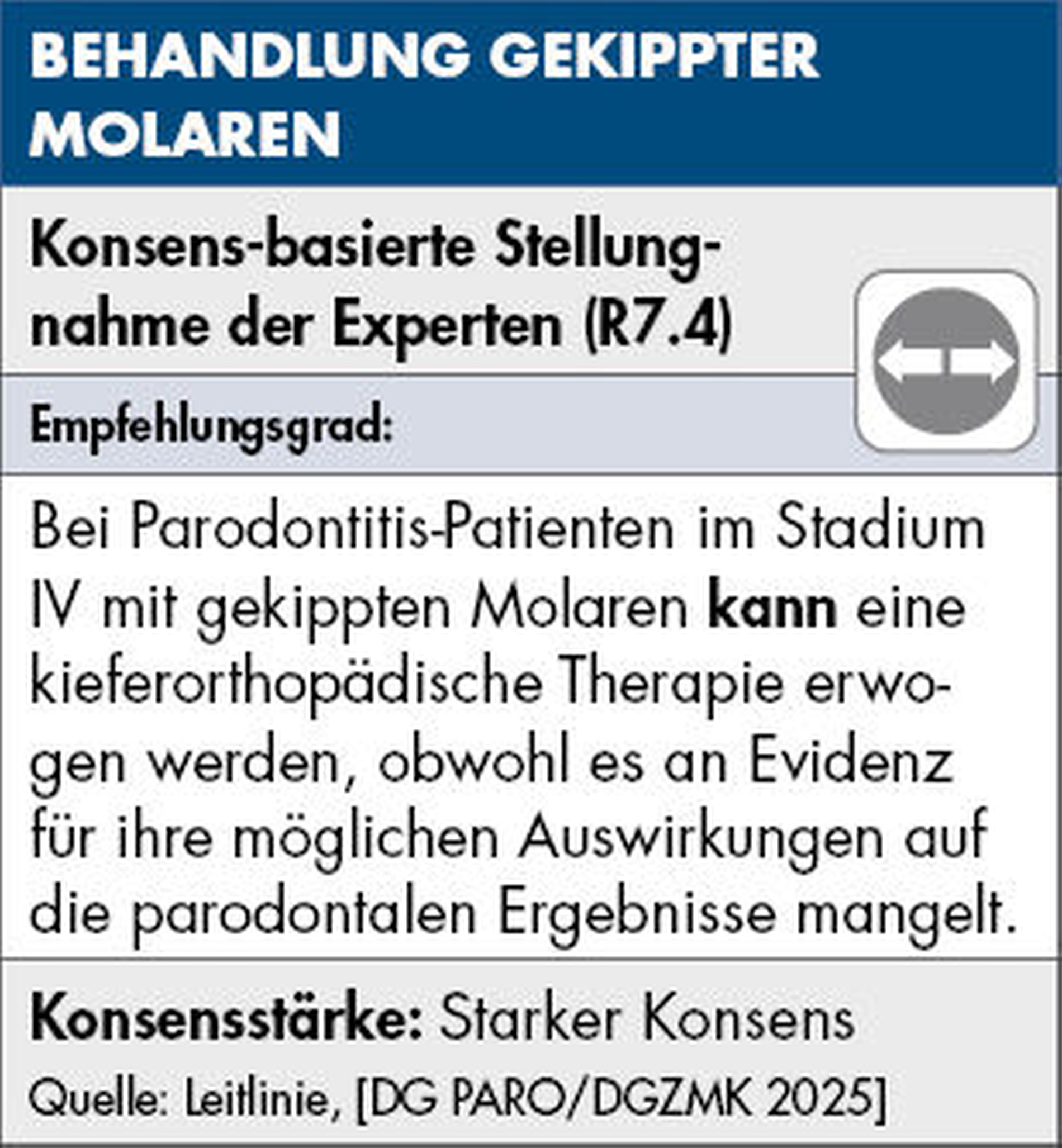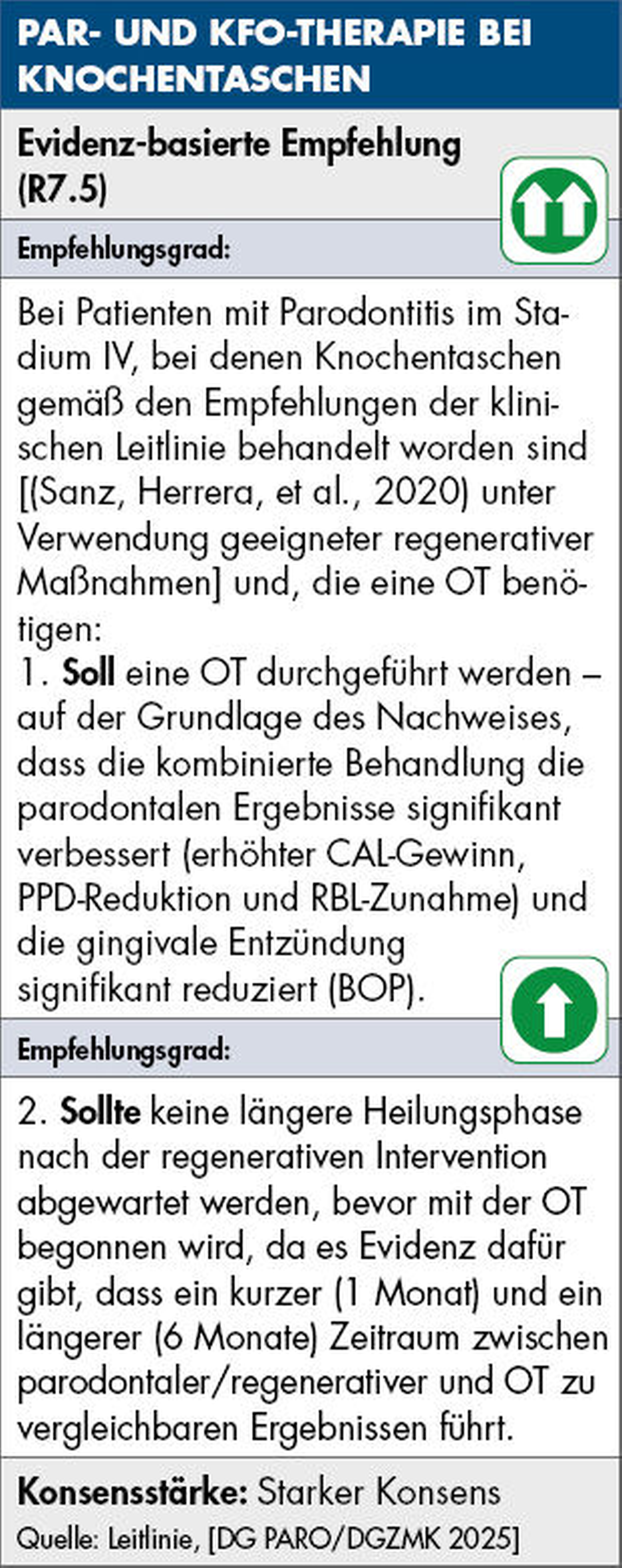 Neuere Untersuchungen, die nach Fertigstellung der europäischen Leitlinie [Herrera et al., 2022] publiziert worden sind, belegen die Langzeitstabilität einer parodontal-regenerativ/kieferorthopädischen Therapie [Tietmann et al., 2023], die Überlegenheit einer frühzeitigen OT hinsichtlich des CAL-Gewinns nach 24 Monaten und die positiven Auswirkungen einer kombinierten Therapie auf die mundgesundheitsbezogene Lebensqualität der Patienten [Jepsen et. al., 2023].