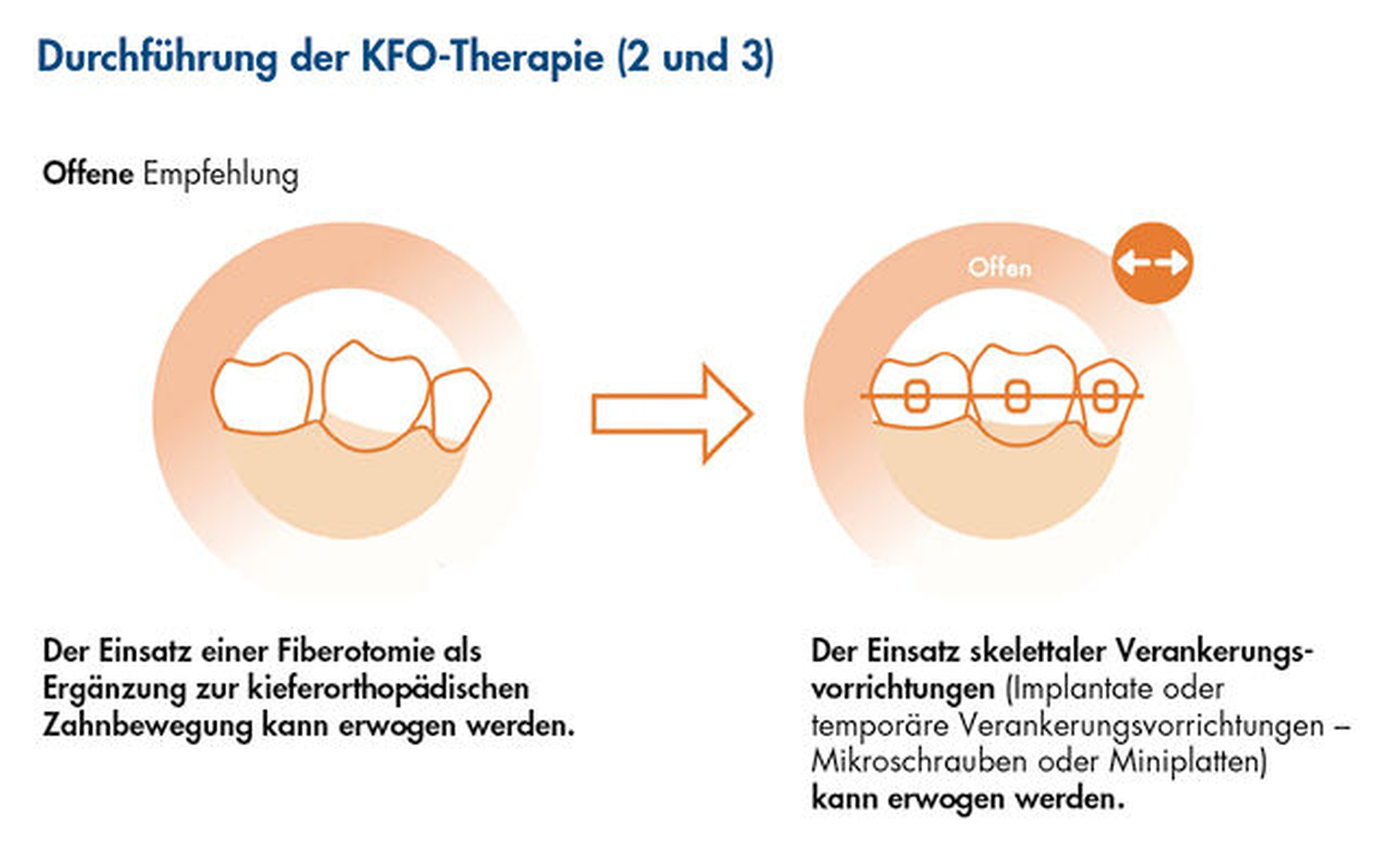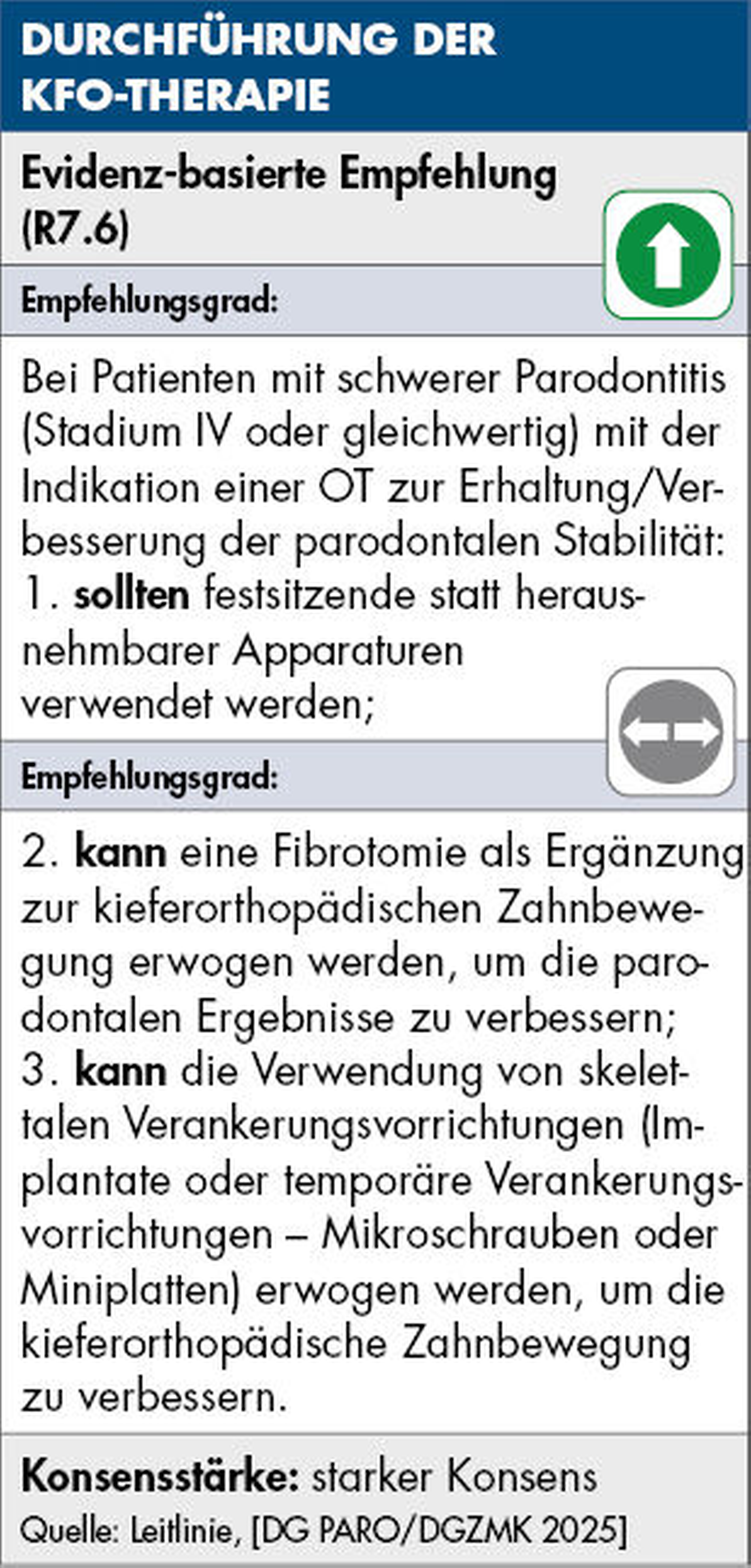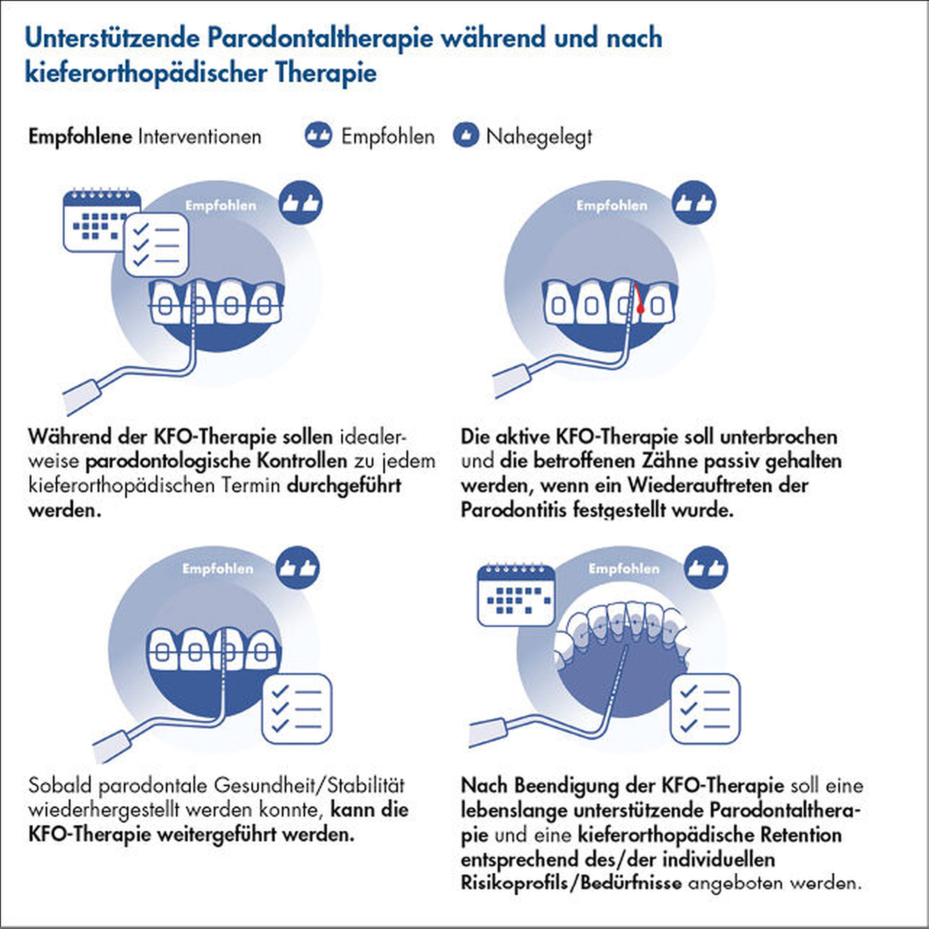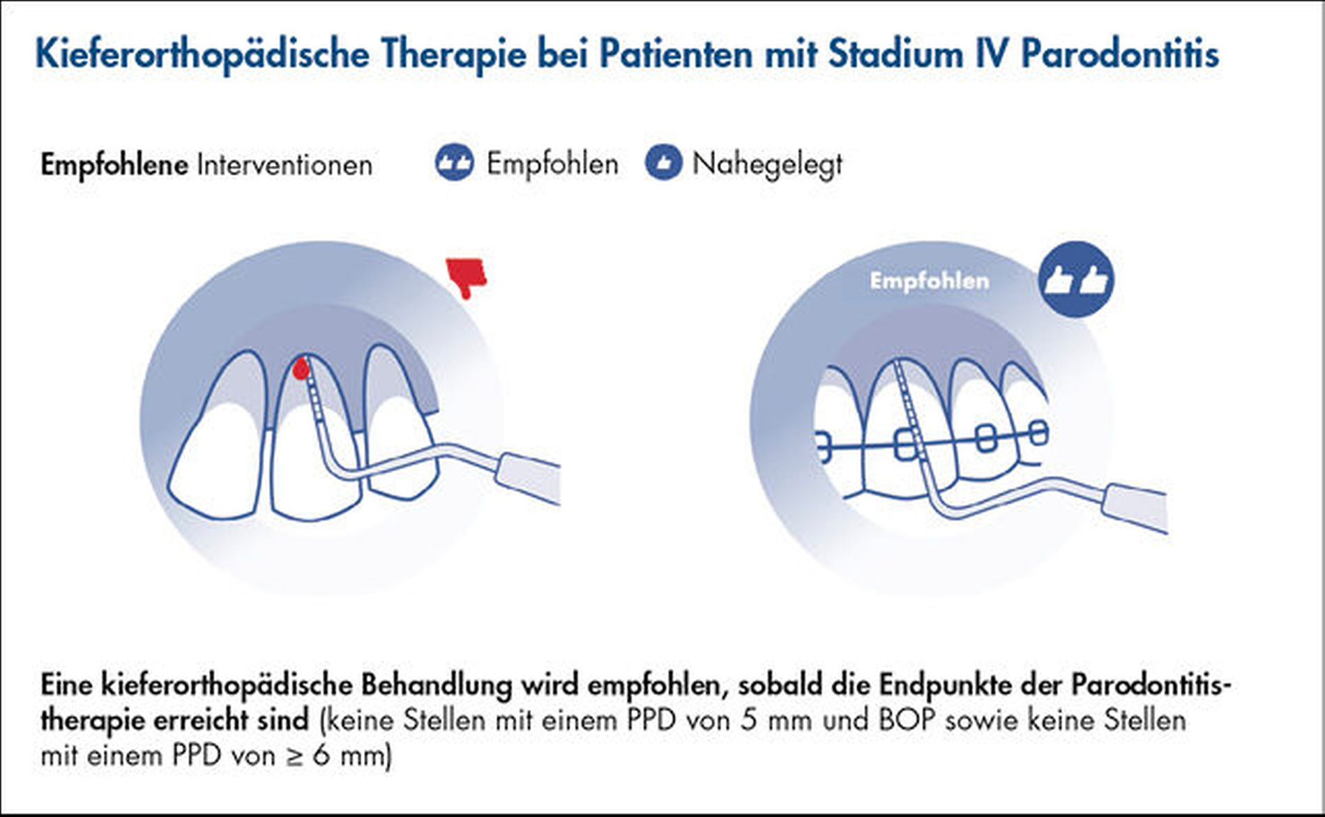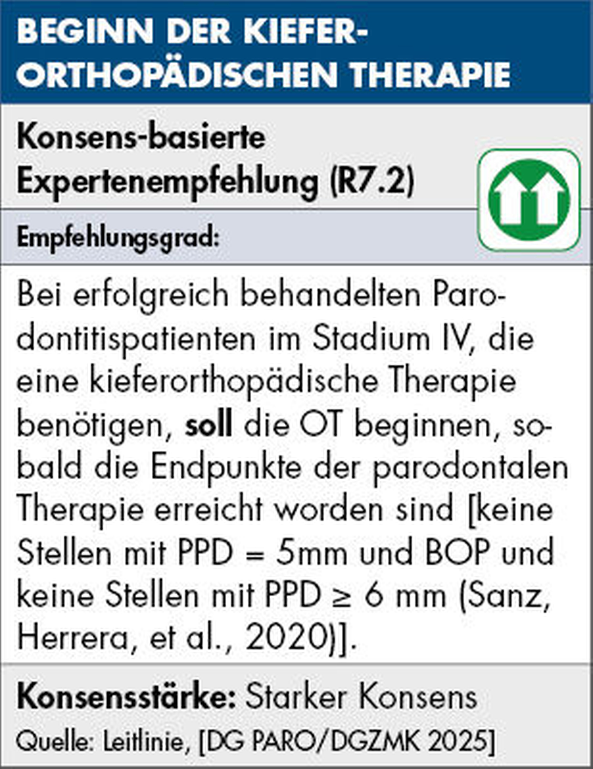 Die kieferorthopädische Therapie kann während der Therapiestufe 2 (subgingivale Instrumentierung mit oder ohne Adjuvantien) und in einigen Fällen während der Therapiestufe 3 (subgingivale Reinstrumentierung und/oder parodontale Chirurgie) geplant werden, sollte jedoch nicht vor Erreichen der parodontalen Behandlungsziele von flachen, erhaltungsfähigen Taschen und vor Kontrolle der parodontalen Entzündung durchgeführt werden. Besondere Überlegungen gelten für die regenerative Behandlung von vertikalen Knochendefekten.