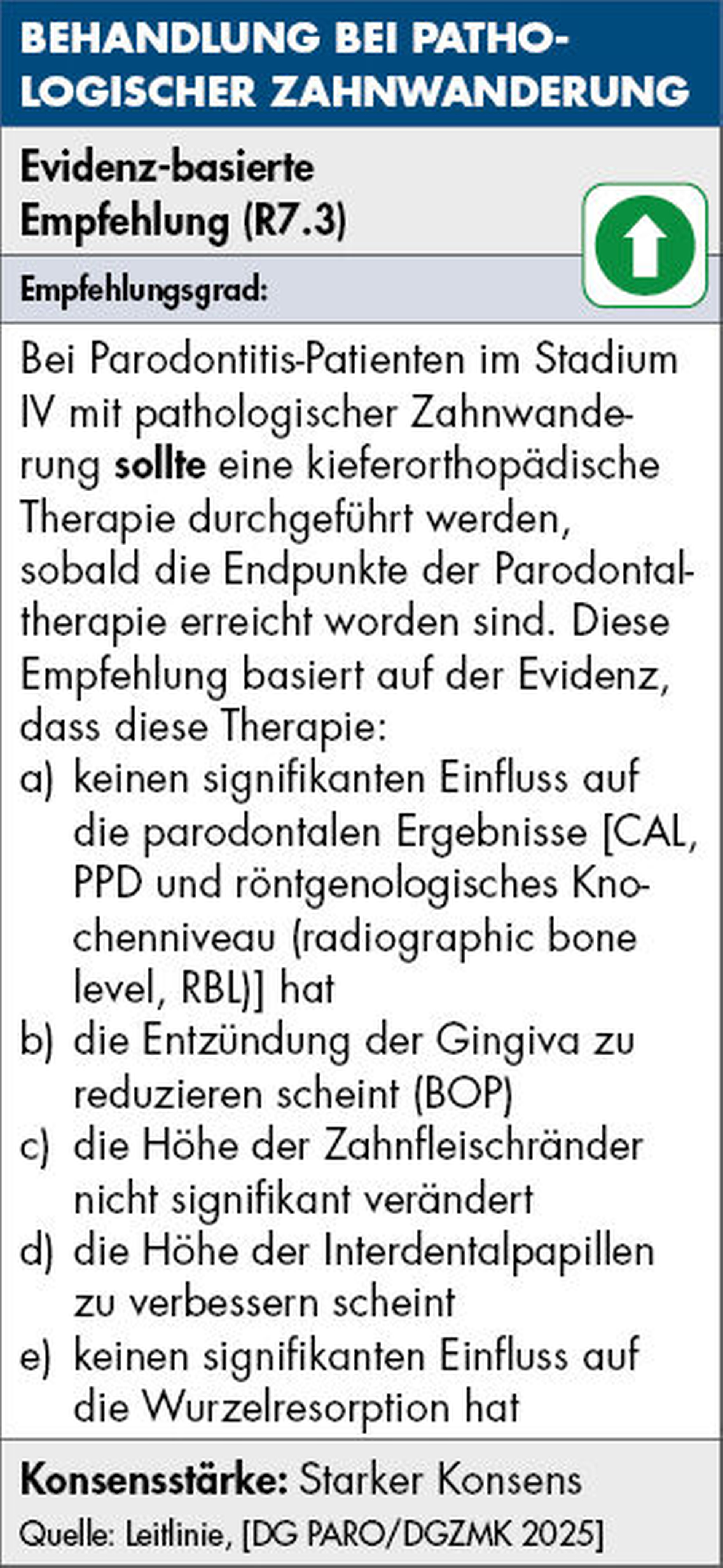 Die pathologische Zahnwanderung [Brunsvold, 2005] ist eine häufige Folge des parodontalen Attachmentverlusts bei Parodontitis-Patienten im Stadium IV, die sich in Form von Zahnstellungsveränderungen, -auffächerungen (Flaring) und -elongationen äußert. Deren Korrektur erfordert OT nach Abschluss der Parodontaltherapie. Die kieferorthopädische Behandlung dieser Folgeerscheinungen beinhaltet in der Regel intrusive, retrusive und angleichende Zahnbewegungen, die potenziell negative Auswirkungen (weiterer parodontaler Attachment- oder Knochenverlust, verstärkte Gingivitis oder verstärkte Wurzelresorption) oder sekundäre Effekte (unerwünschte ästhetische Ergebnisse wie Gingivarezession und Verlust der Interdentalpapille) auf die betroffenen Zähne haben können.