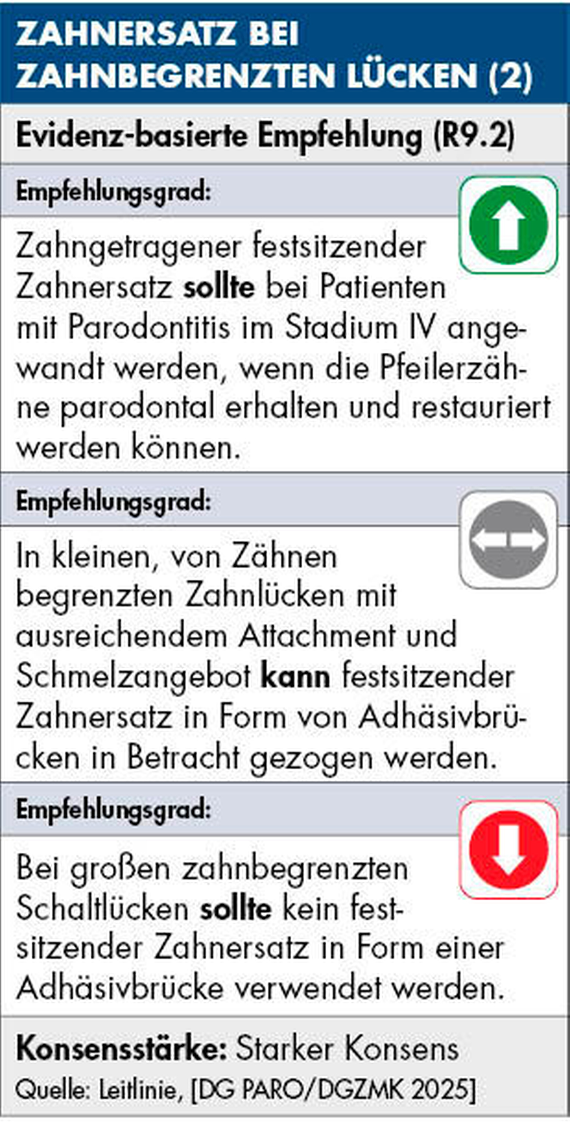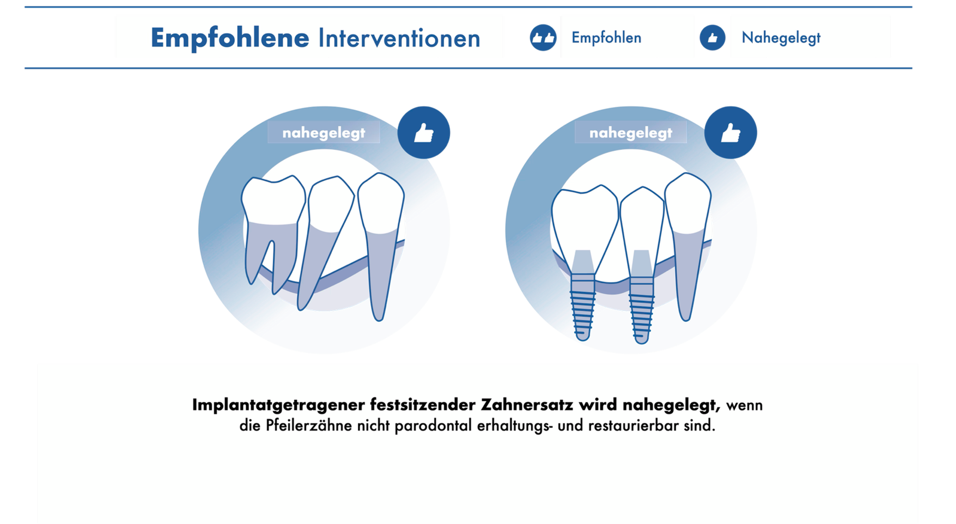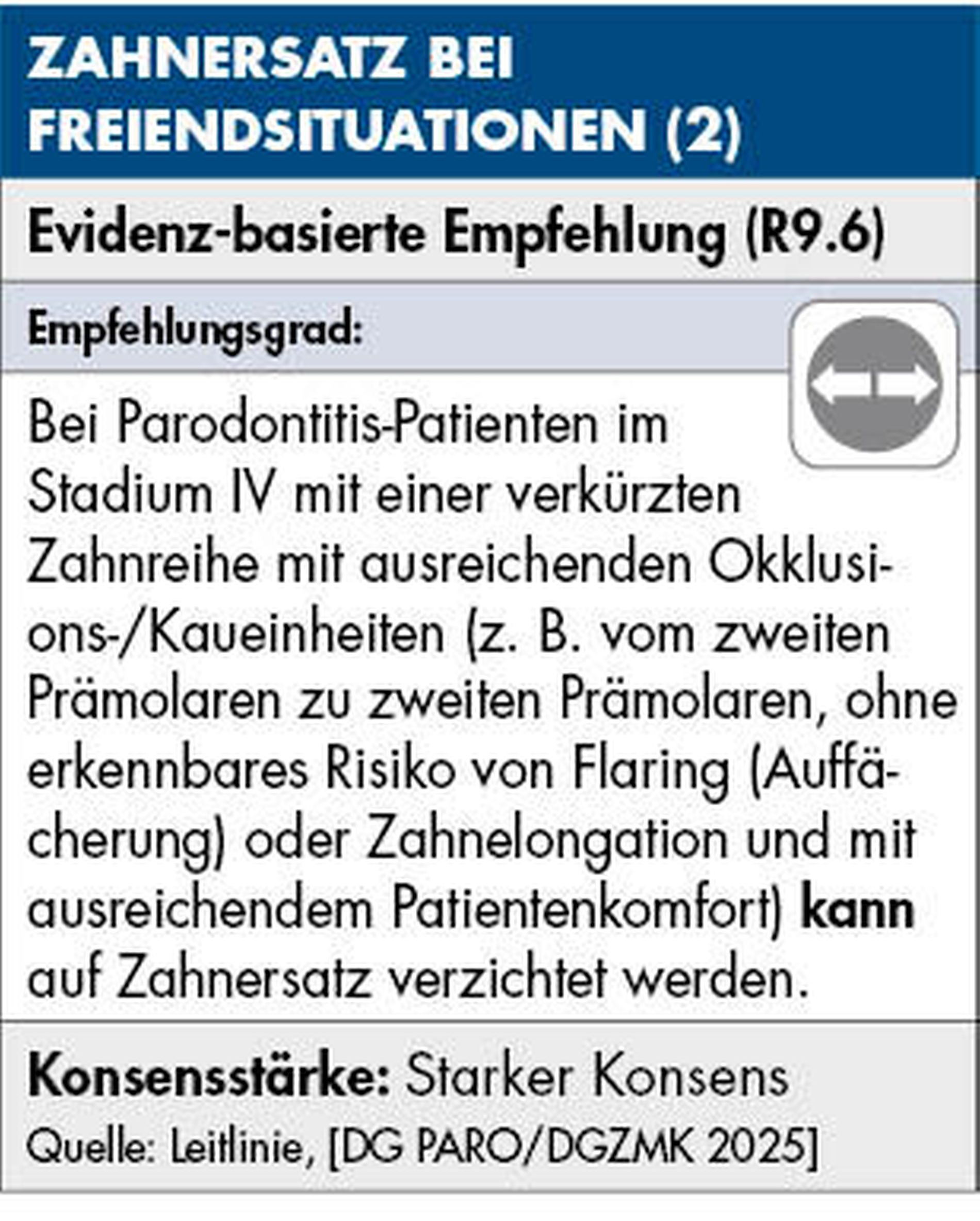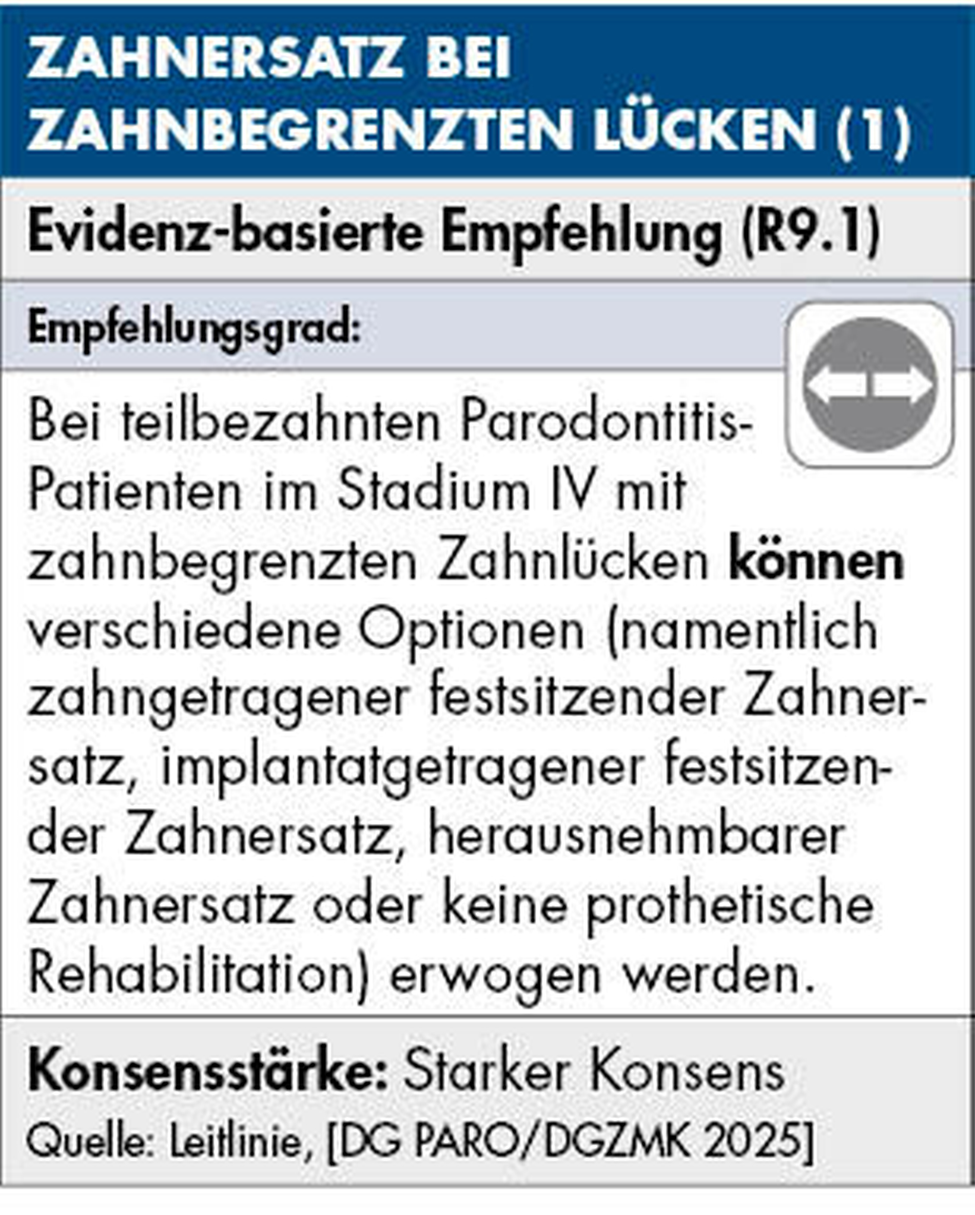 Sowohl die europäische als auch die deutsche Leitliniengruppe waren sich einig, dass das oberste Ziel stets der Zahnerhalt und die Vermeidung von Zahnersatz ist. Daher sollte vor Abschluss der ersten beiden Stufen der parodontalen Therapie versucht werden, die geschlossene Zahnreihe – sofern möglich – zu erhalten, bis eine definitive Planung der prothetischen Versorgung möglich ist. Die zeitliche Koordinierung parodontaler, prothetischer und implantologischer Maßnahmen ist bei Patienten mit Parodontitis Stadium IV von besonderer Bedeutung. Die Leitlinie stellt klar, dass die Planung des definitiven Zahnersatzes erst nach Durchführung der zweiten Stufe der parodontalen Therapie erfolgen sollte. Die Entscheidung über den Umgang mit prognostisch unsicheren Zähnen mit Pfeilerfunktion wird dabei allerdings nicht tiefer thematisiert.