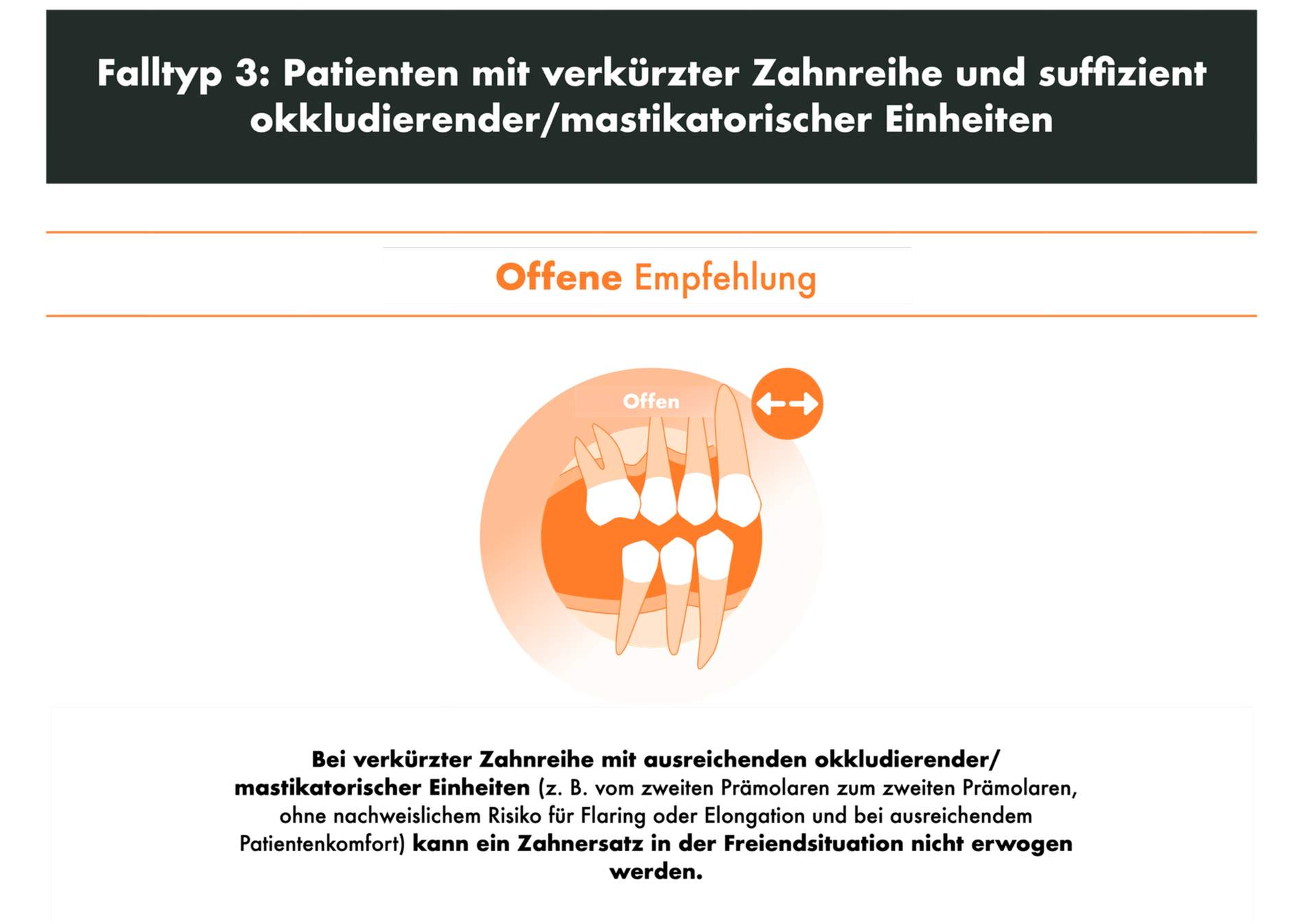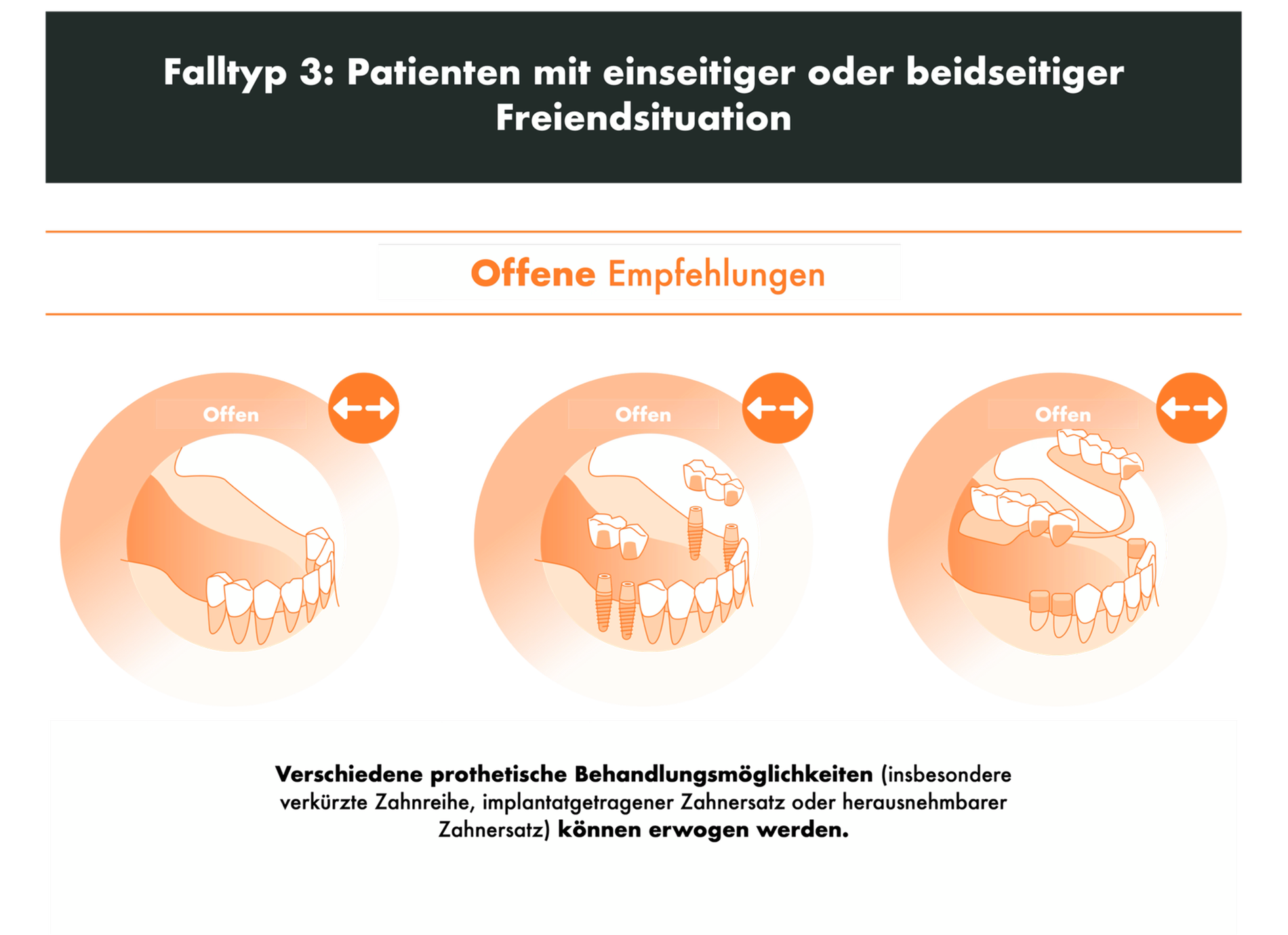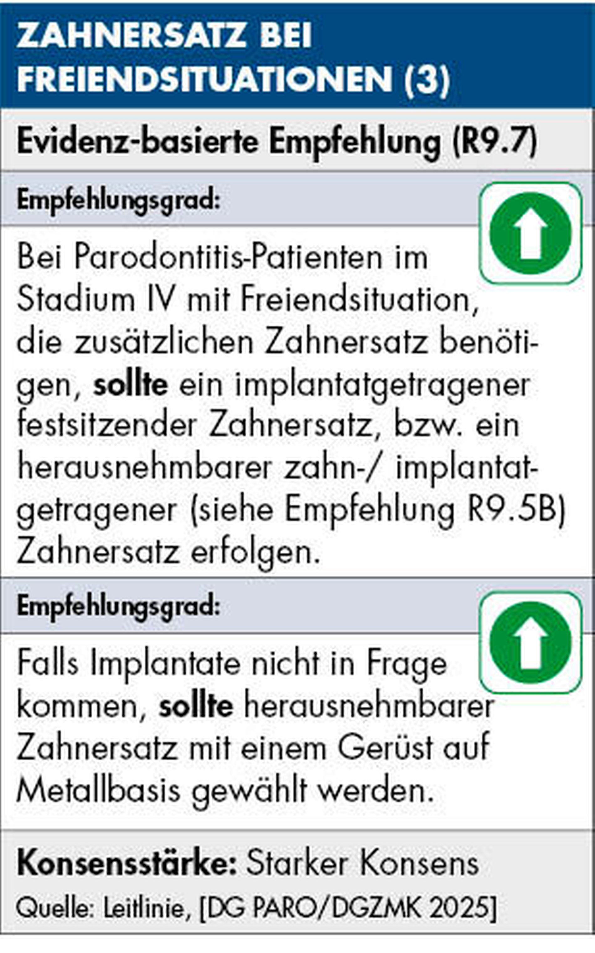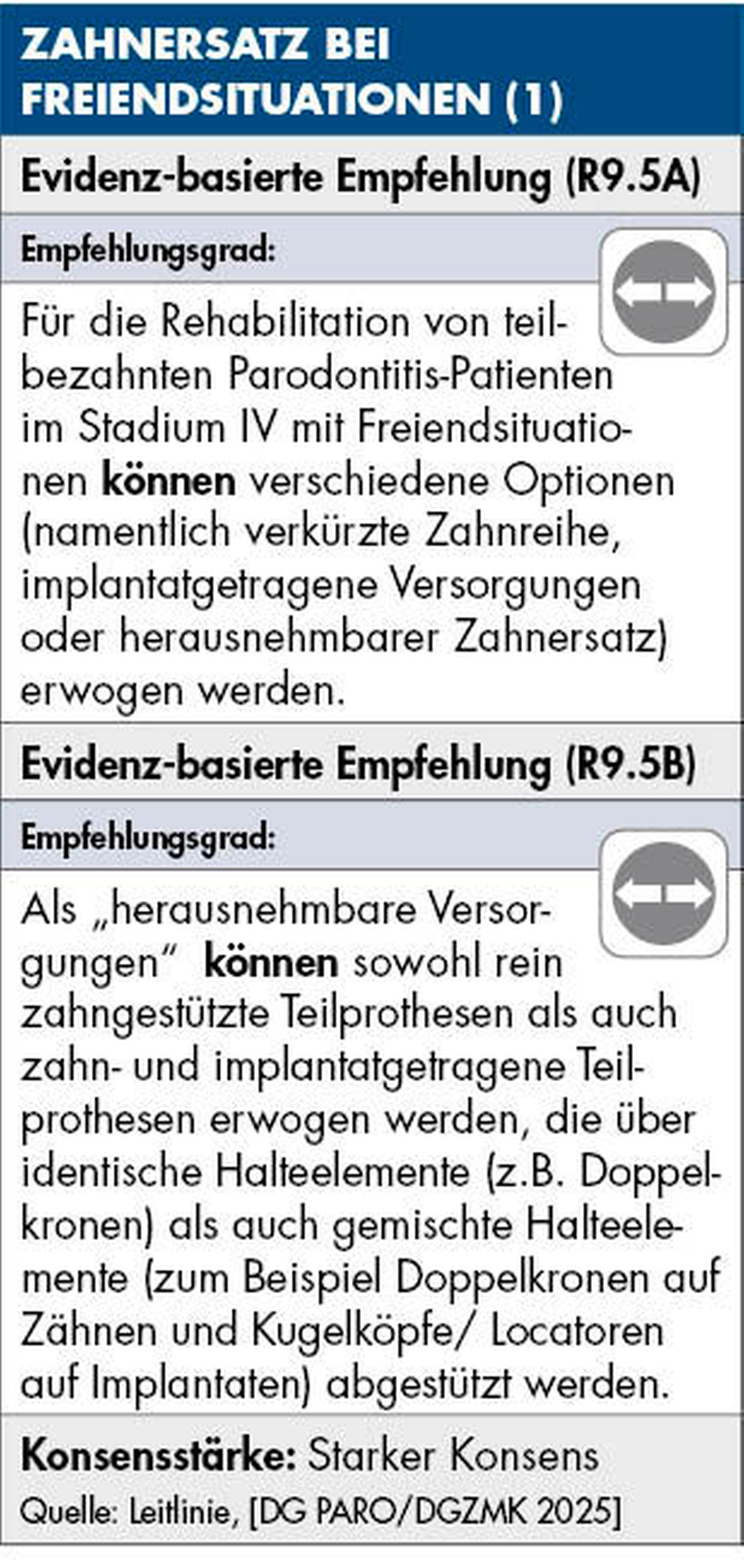 Die aktuelle S3-Leitlinie zur Therapie von Patienten mit einem Falltyp 3 der Parodontitis Stadium IV gibt Empfehlungen für unterschiedliche klinische Situationen mittels verschiedener prothetischer Lösungen. Für die meisten Empfehlungen ist die Evidenzlage allerdings begrenzt, da nur wenige klinische randomisierte Studien zur prothetischen Versorgung teilbezahnter Patienten mit klarem Bezug zur Parodontitis Stadium IV vorliegen und noch Forschungsbedarf besteht [Gotfredsen et al., 2022; Montero et al., 2022]. Für zahn- und implantatgetragene Versorgungsformen mit strategischer Pfeilervermehrung, beispielsweise mit Doppelkronen oder Druckknopfsystemen, liegen auch länderspezifische Besonderheiten vor. So hat sich insbesondere die deutsche Leitliniengruppe sowohl bei Falltyp 3 als auch bei Falltyp 4 für offene Empfehlungen zur Nutzung kombiniert zahn-/implantatgetragener Konzepte eingesetzt.