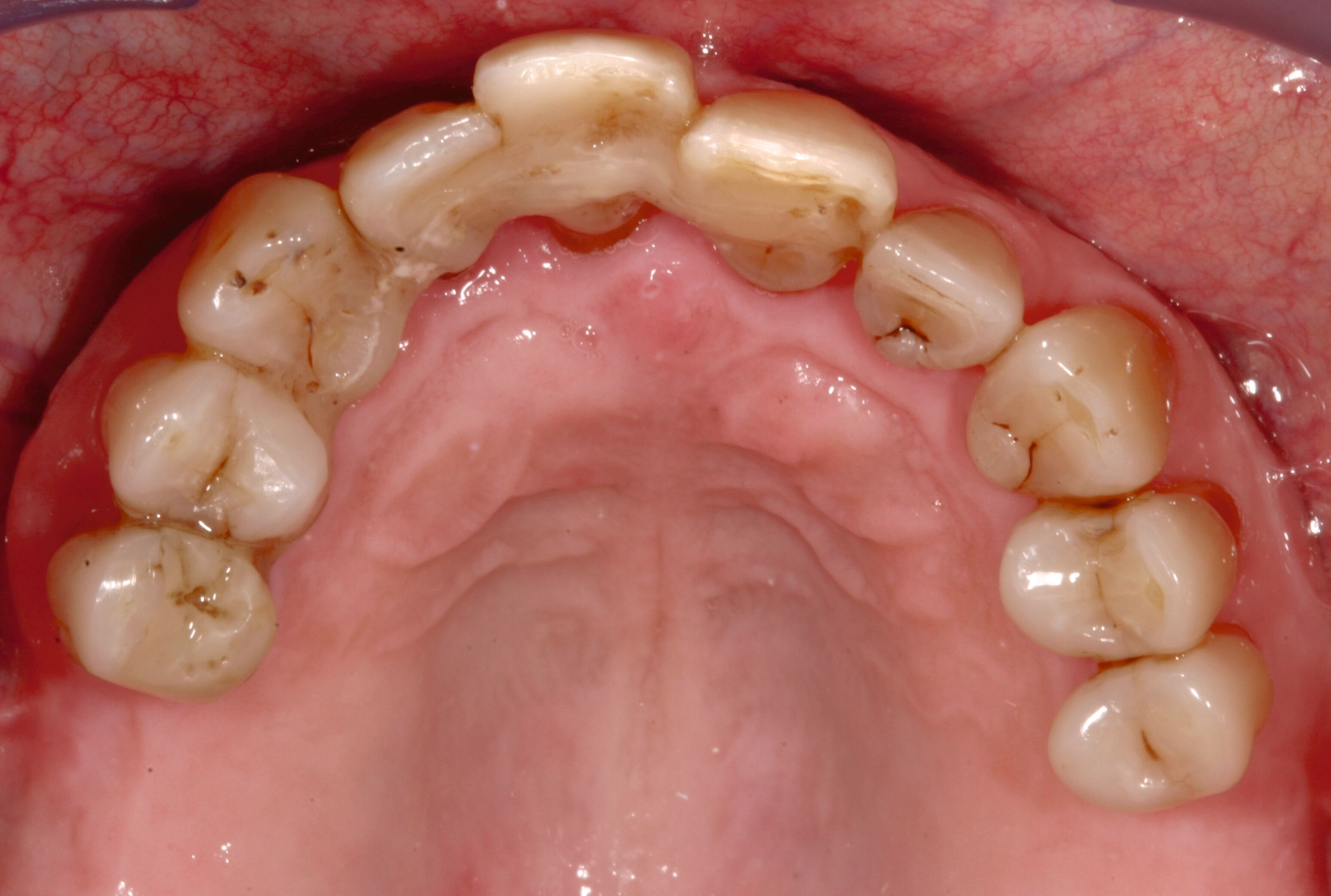 Ein Ersatz der Molaren war nicht erforderlich, da der Patient mit der verkürzten Zahnreihe seine Kaufunktion als ausreichend empfand. Aufgrund der erhöhten Beweglichkeit der Oberkieferfrontzähne, die die mundgesundheitsbezogene Lebensqualität stark beeinträchtigte, wurde eine adhäsive Schienung von Zahn 13 bis 21 durchgeführt. Dabei kam ein Polyethylen-Fasernetz (Ribbond, Seattle, USA) zum Einsatz (Abbildung 10). Zur Versorgung der Freiendsituation wurden zwei Implantate mit lokalem Knochenaufbau inseriert und mit implantatverankerten zementierten Einzelkronen versorgt. Die Frontzahnschaltlücke im Unterkiefer wurde mit zwei einflügeligen Adhäsivbrücken aus labial verblendeter 3Y-TZP-Zirkonoxidkeramik (Abbildungen 11 bis 13) geschlossen, die Schaltlücken regio 44 und 46 durch eine Anhängerbrücke, die von Zahn 47 bis Zahn 44 reichte (Abbildung 14).