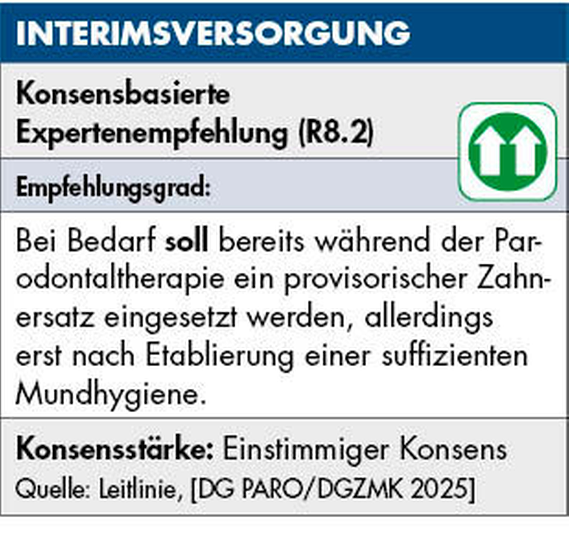 Die weiteren Empfehlungen (R8.4, R8.5 und R8.6) beziehen sich auf Überlegungen zu Implantatversorgungen bei Stadium-IV-Parodontitis: