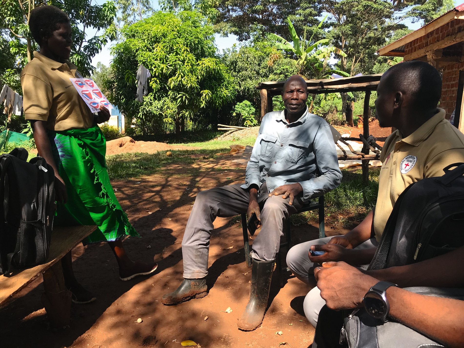 Bereits am nächsten Tag beginnt der Einsatz der frisch geschulten CHV. Ausgestattet mit Informationsmaterial, Zahnschemata, Gummistiefeln, Regenschirmen und T-Shirts, die sie als offizielle CHV ausweisen, machen sie sich auf den Weg zu den ihnen zugeteilten Haushalten – meist zu Fuß, manchmal per Motorrad. Wir begleiten die CHV an zwei Tagen auf dem Soziussitz eines Motorrads durchs hügelige Gelände. In den Dörfern werden beim Eintreffen der Gruppe sofort alle Familienmitglieder zusammengerufen, oft auch Nachbarn und Freunde und man versammelt sich im Schatten von Bäumen oder in den Häusern und Hütten. Es wird zugehört, gefragt, diskutiert.