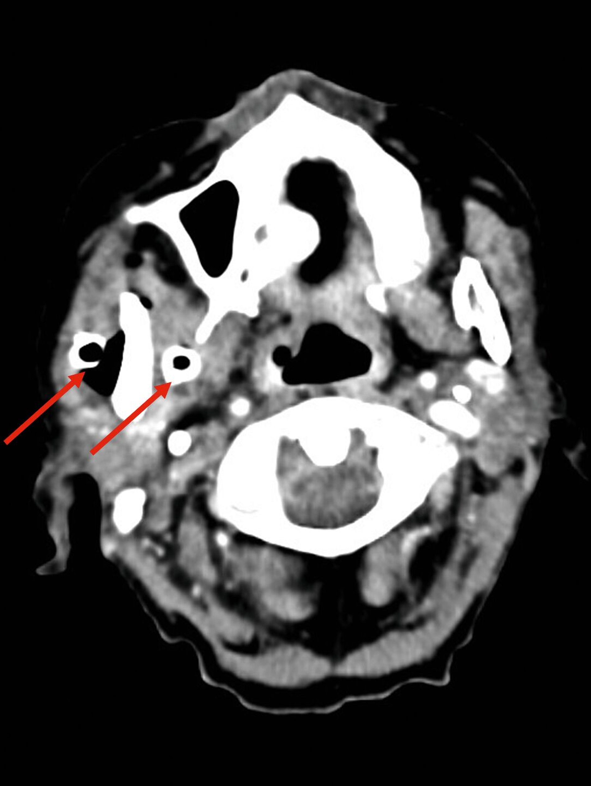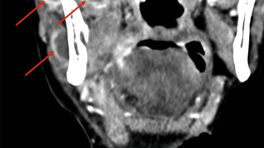 Eine 72-jährige Patientin stellte sich mit einer paramandibulären Schwellung rechts vor. Anamnestisch bestand eine bekannte Penicillinallergie mit einem vor mehr als zehn Jahren aufgetretenem Exanthem im Rahmen der Antibiotikagabe. Die Patientin wies relevante Vorerkrankungen auf (chronisch obstruktive Lungenerkrankung, periphere arterielle Verschlusserkrankung, arterielle Hypertonie, mikrozytäre Anämie, Vorhofflimmern) und hatte eine ausgeprägte Raucheranamnese mit mehr als 50 Packyears.