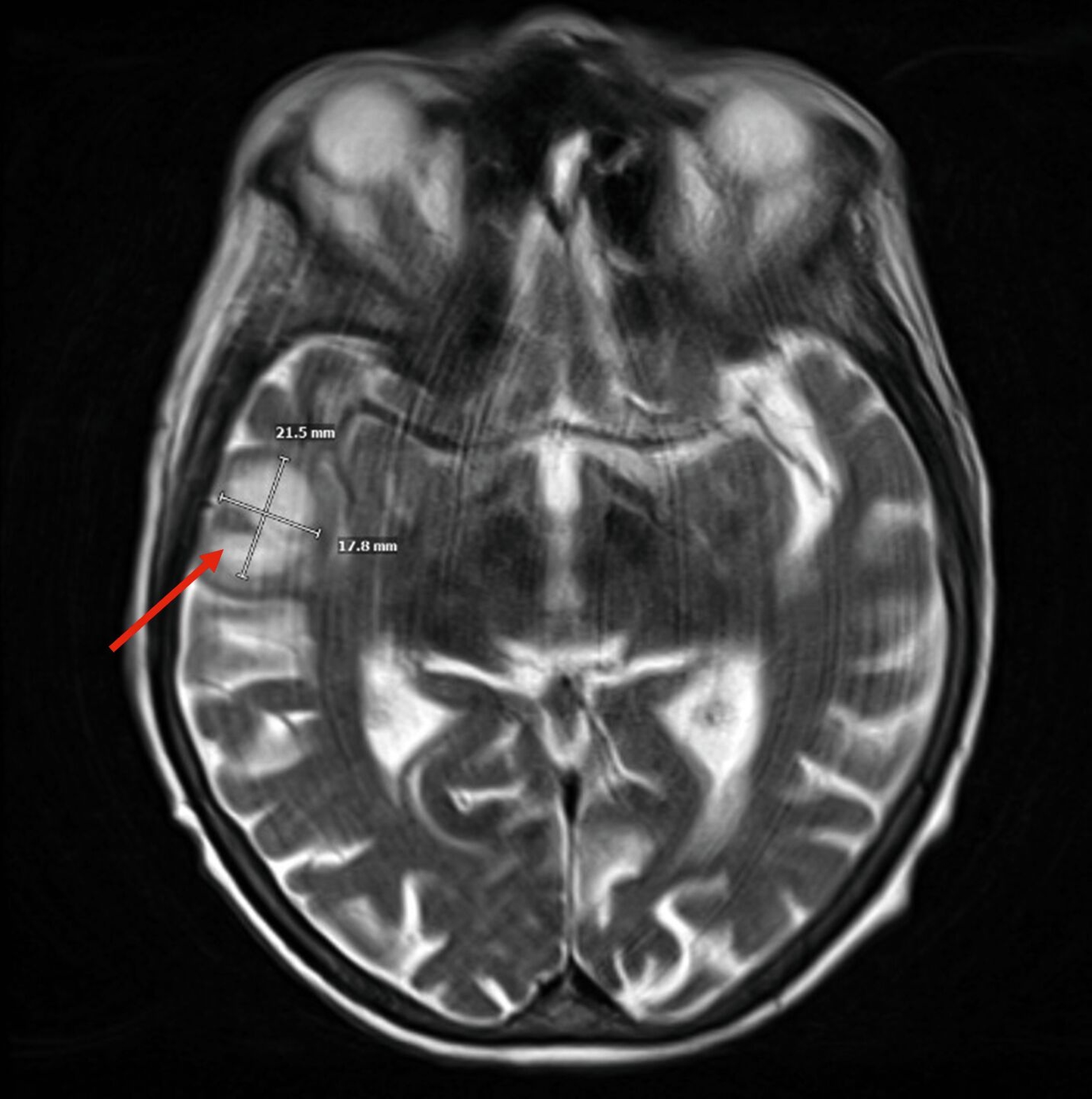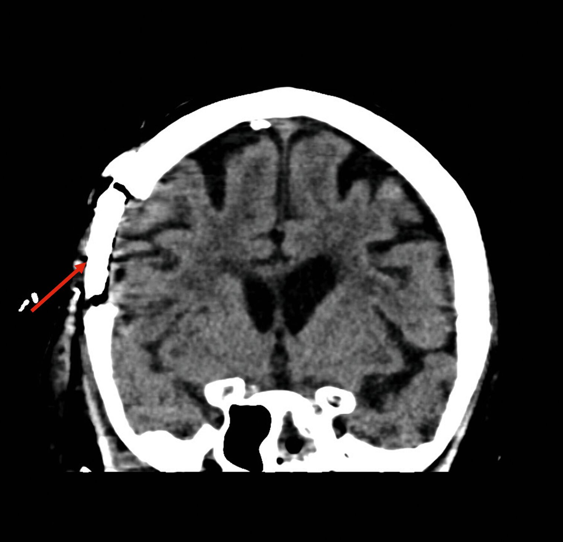 Im weiteren stationären Verlauf fiel am neunten postoperativen Tag eine zunehmende Somnolenz mit Wortfindungsstörungen und Wesensveränderung auf. Die zerebrale Schnittbildgebung zeigte eine hyperintense Läsion temporal rechts mit Verdacht auf einen zerebralen Abszess sowie eine Verschattung im Sinus sphenoidalis (Abbildung 3). Am selben Tag erfolgte durch die Kollegen der Neurochirurgie eine osteoplastische Kraniotomie mit Drainage des Hirnabszesses sowie eine Drainage des Keilbeinsinus durch die Kollegen der HNO (Abbildung 4). In beiden Lokalisationen wurde erneut Streptococcus intermedius als dominierende Bakterienspezies identifiziert – mit Resistenz gegenüber Clindamycin, jedoch guter Empfindlichkeit gegenüber Ampicillin.