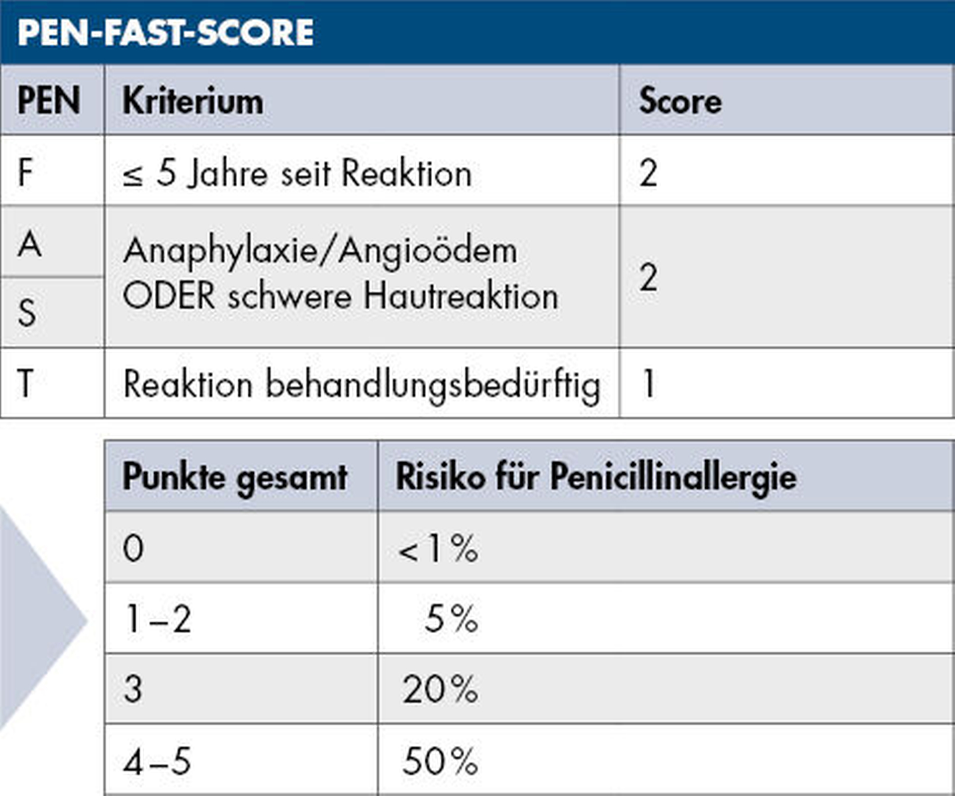 Die strukturierte Risikobewertung einer anamnestischen Penicillinallergie mittels Scores wie PEN-FAST kann helfen, Patientinnen und Patienten sicher zu delabeln und eine leitliniengerechte Antibiotikatherapie zu ermöglichen.