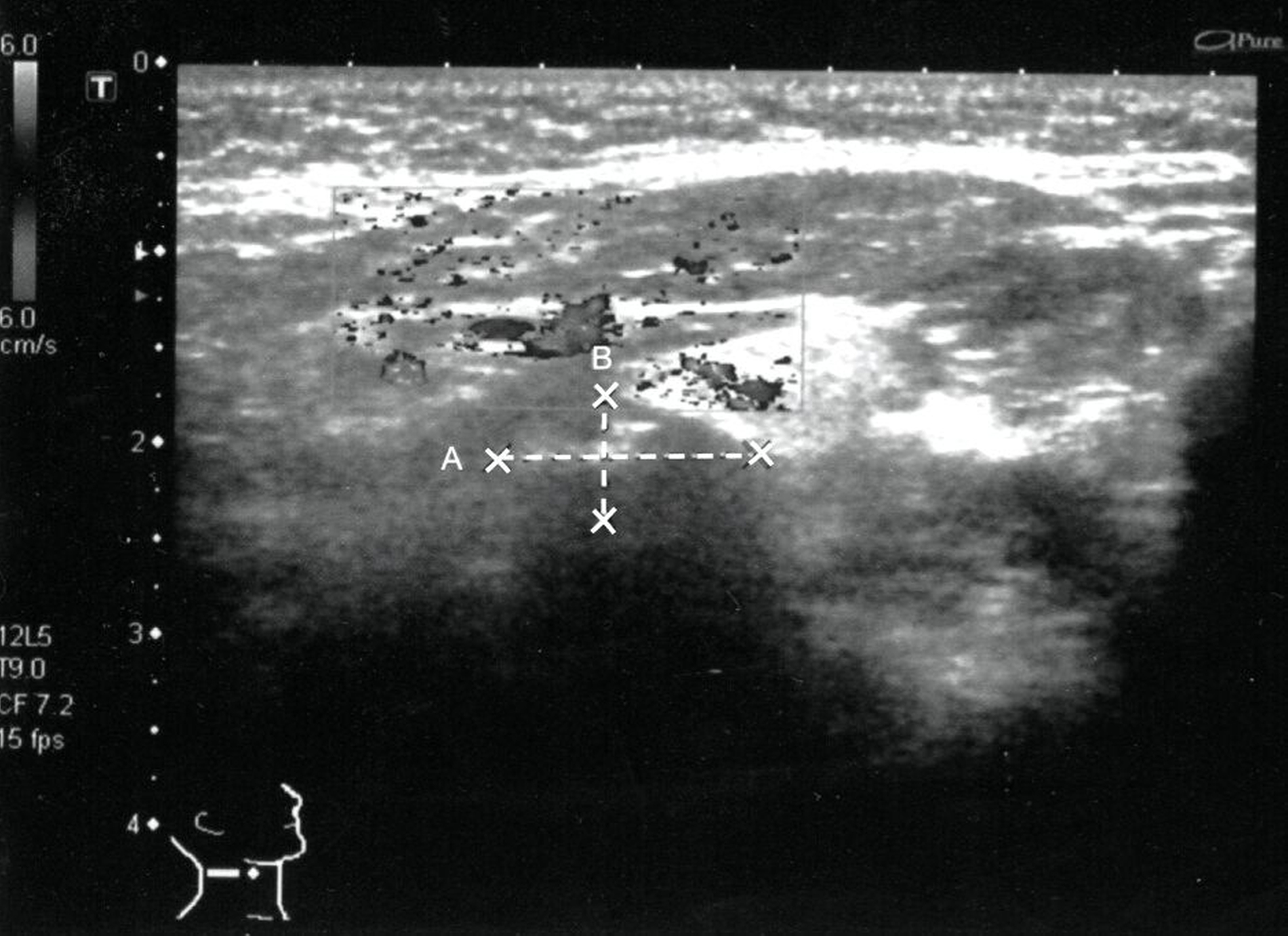 Sonografisch präsentierte sich die Gl. submandibularis entzündlich aufgetrieben mit inhomogener Binnenstruktur und umgebender Entzündungsreaktion ohne Abszedierung. Bei einem intraglandulär erweiterten Gangsystem ließ sich zusätzlich eine circa 4,8 cm x 1,1 cm große echoreiche Raumforderung mit dorsalem Schallschatten im linken Wharton-Gang darstellen (Abbildung 2). Aufgrund der Größe und der Lokalisation des Steines wurde ein operatives Vorgehen mit vollständiger Entfernung mittels Marsupialisation angestrebt.