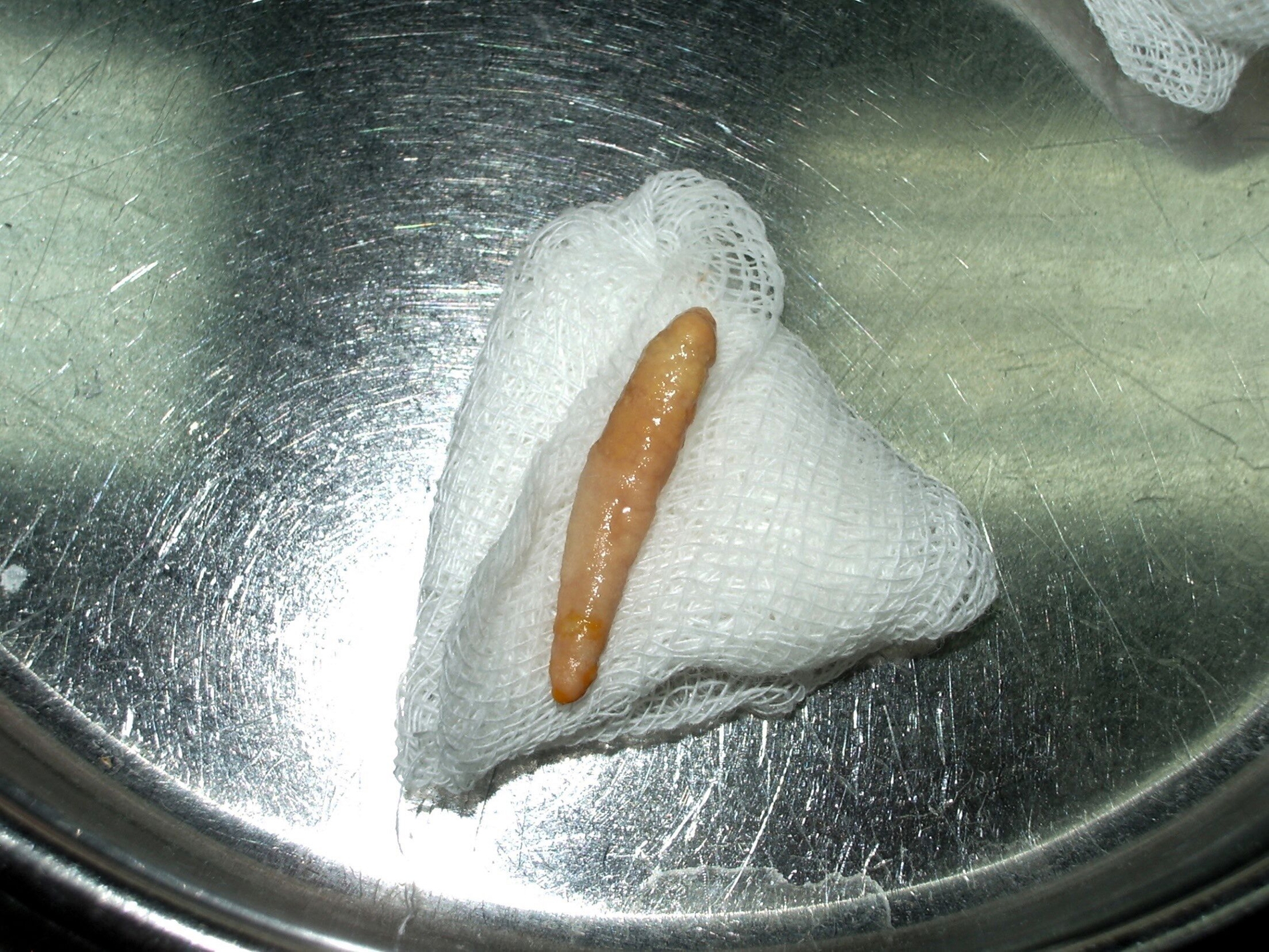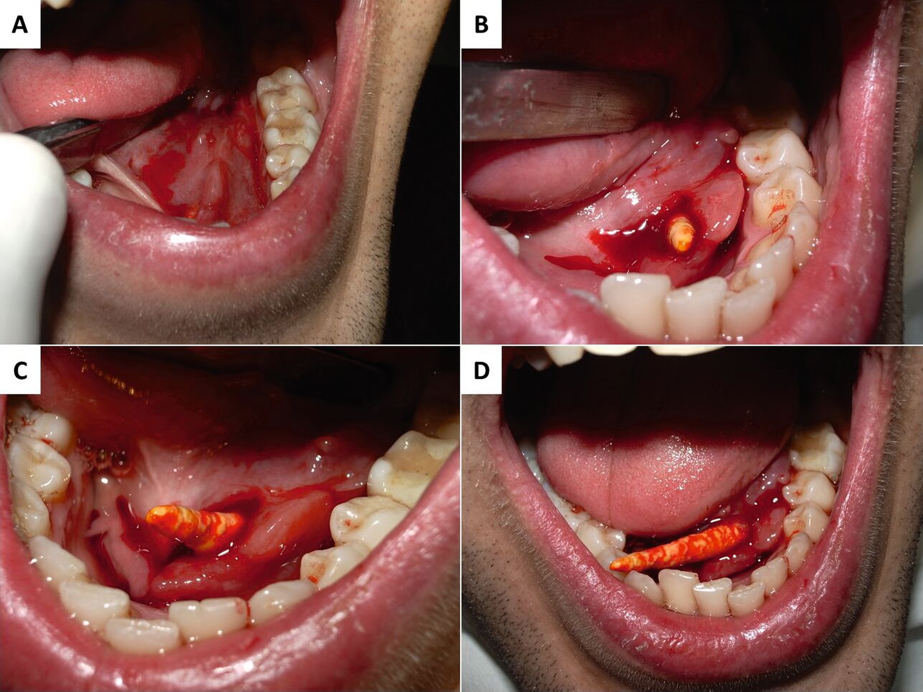 In Lokalanästhesie konnte der Ausführungsgang longitudinal inzidiert (Abbildung 3A) und der Speichelstein komplikationslos in toto extrahiert werden (Abbildungen 3B bis 3D und Abbildung 4). Abschließend wurde der eröffnete Gang im Sinne einer Marsupialisation umlaufend an der umgebenden Schleimhaut fixiert, um eine erneute Stenose zu verhindern. Der weitere postoperative Verlauf gestaltete sich regelrecht. In den folgenden Nachuntersuchungen zeigte sich der Patient beschwerdefrei bei reizloser Mundbodenschleimhaut ohne erneute Gangobstruktion oder Entzündungszeichen.