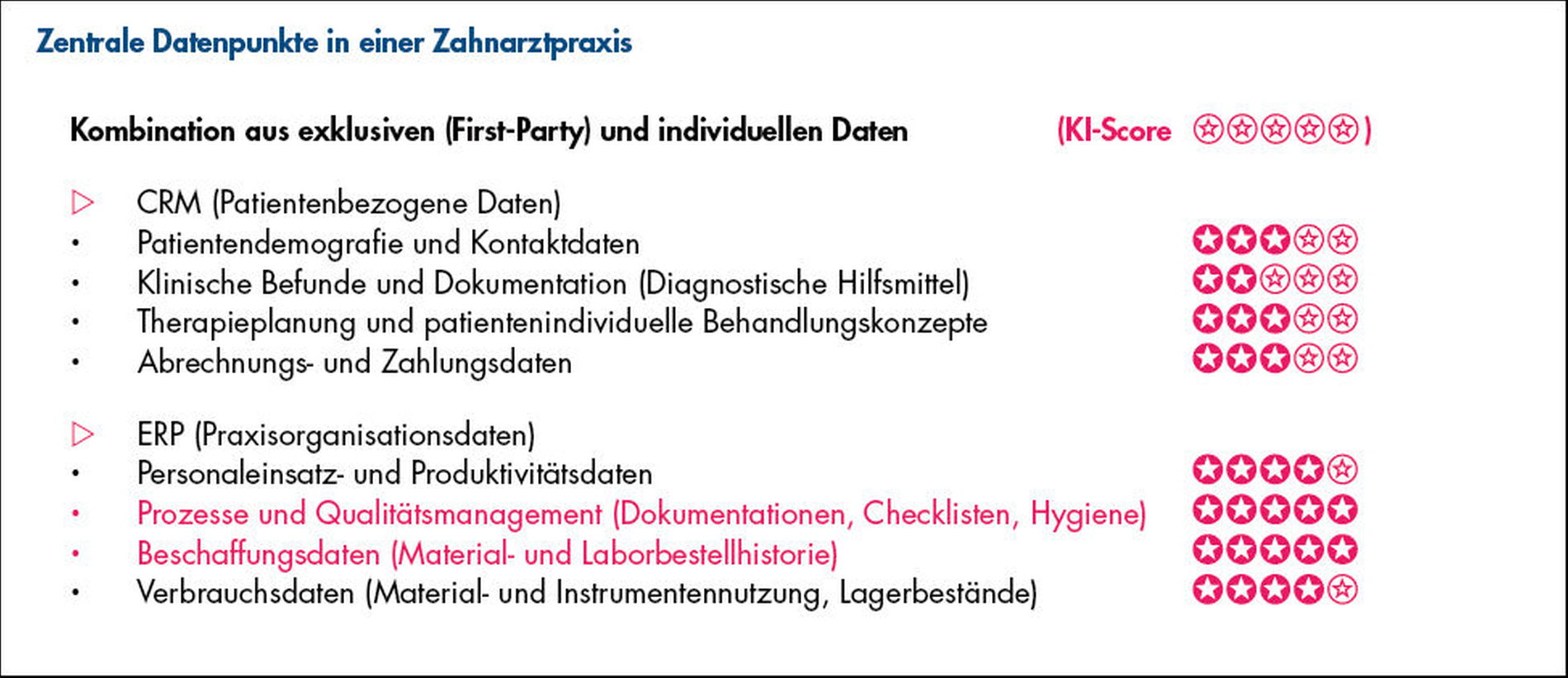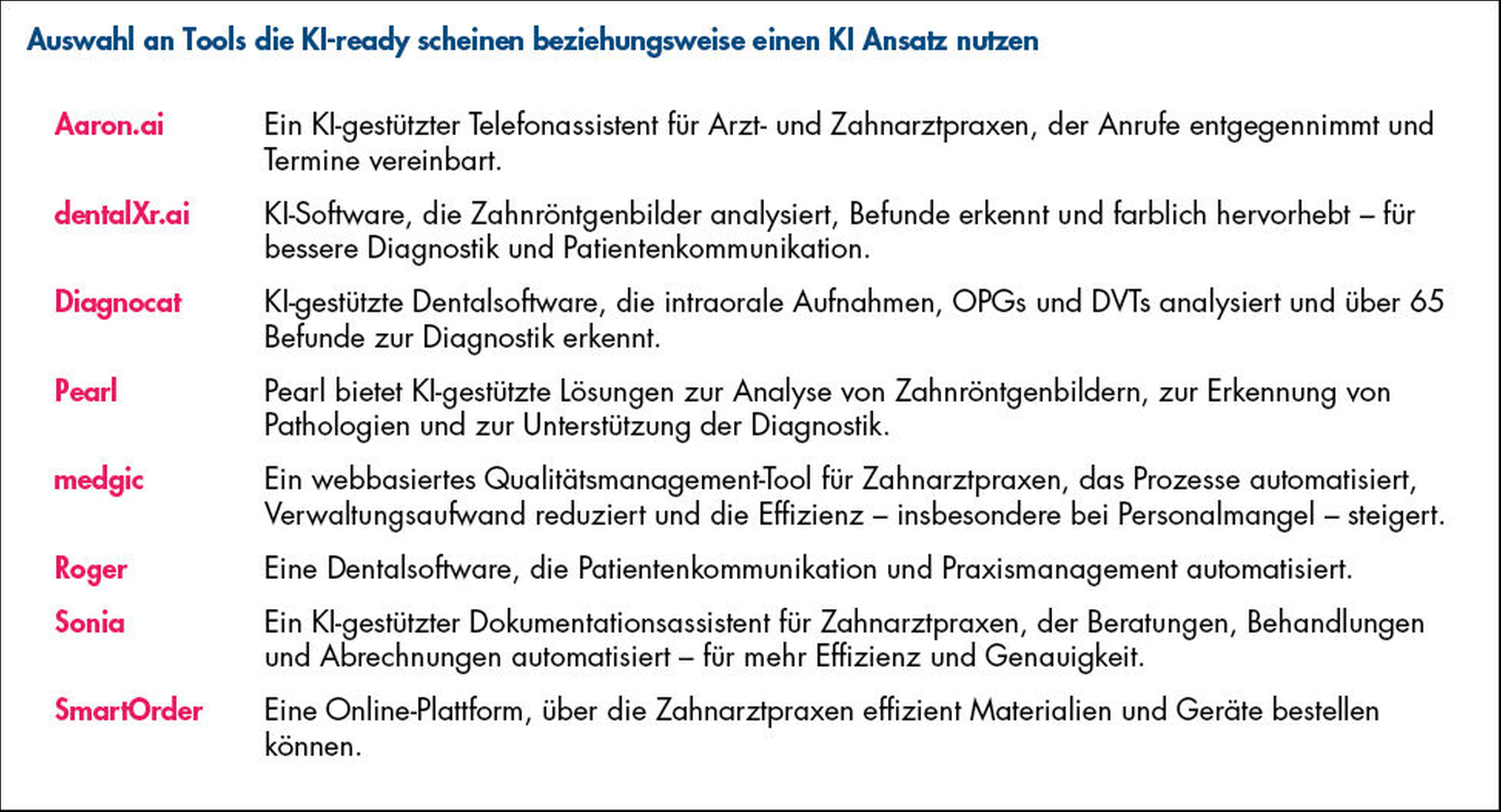 Nein, ganz sicher nicht. Stand jetzt kann KI nur in singulären Bereichen in den Praxen zum Einsatz kommen. Wir haben uns das genauer angesehen und in einer detaillierten Analyse mit Daten von 20 mittelgroßen und größeren Zahnarztpraxen durchdekliniert: Wo ist KI inzwischen sinnvoll einsetzbar und generiert einen konkreten Nutzen?