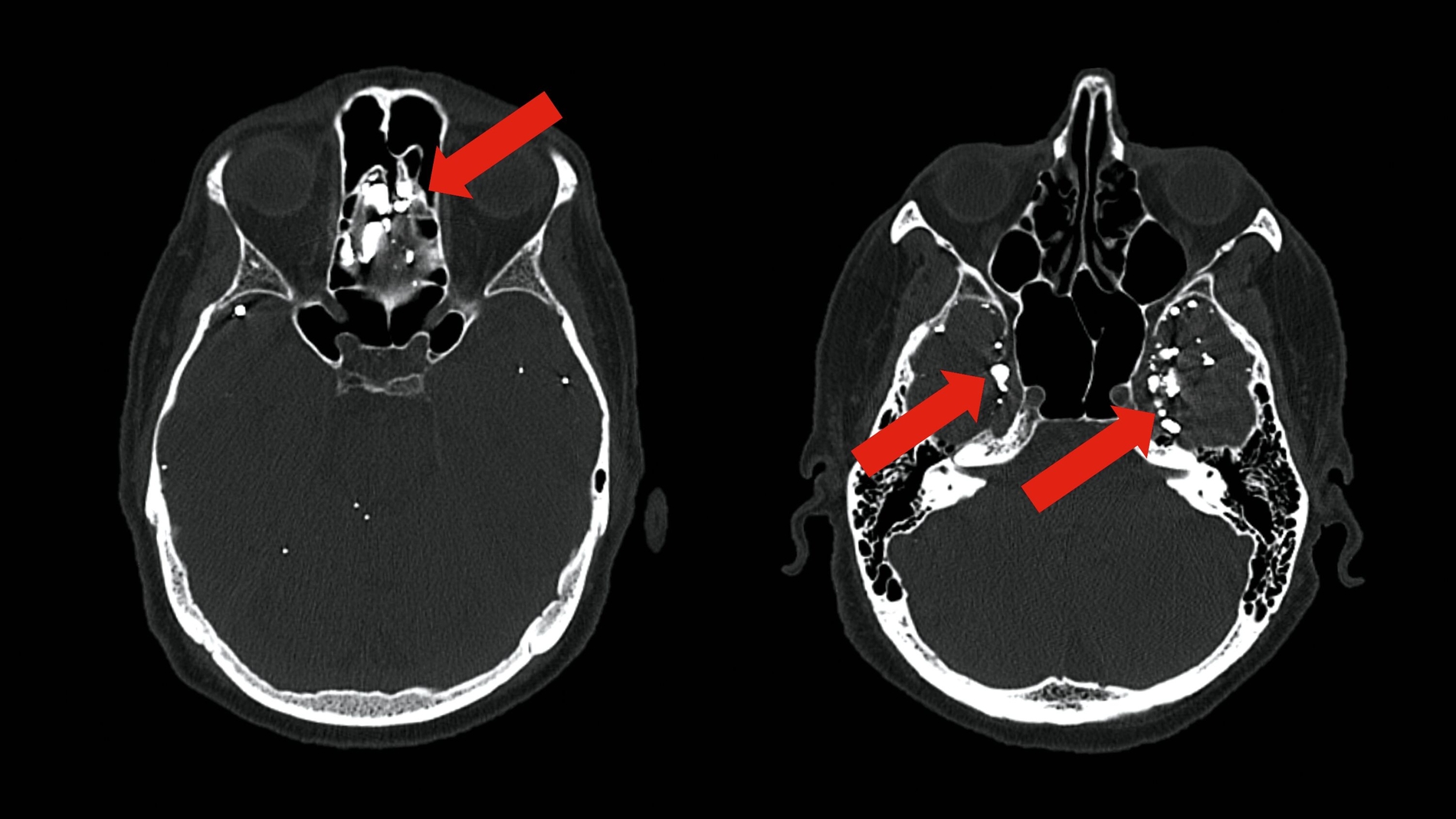 Das CT bestätigte multiple, teils rundliche, teils längliche, hoch röntgendichte Ablagerungen innerhalb der Liquorräume, vor allem supratentoriell und in den frontobasalen Abschnitten. Es zeigten sich keine Hinweise auf eine Liquorzirkulationsstörung, keine Raumforderungen, keine Mittellinienverlagerung und ein insgesamt unauffälliger Sella- und retrobulbärer Befund. Die basalen Zisternen waren frei. Die knöchernen Strukturen, einschließlich der Mastoidzellen, wiesen keine pathologischen Veränderungen auf.
