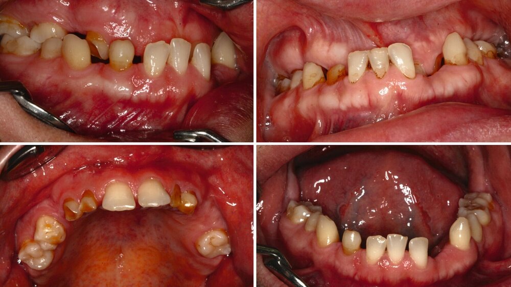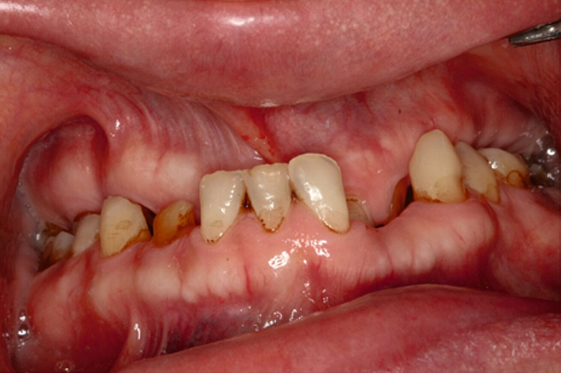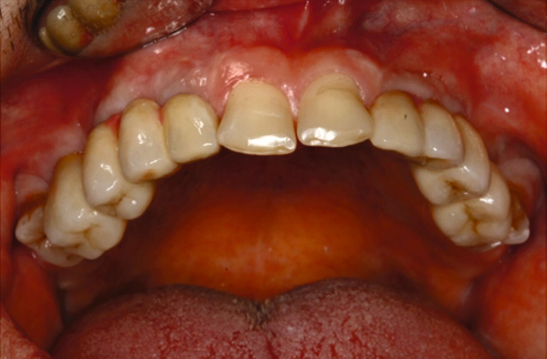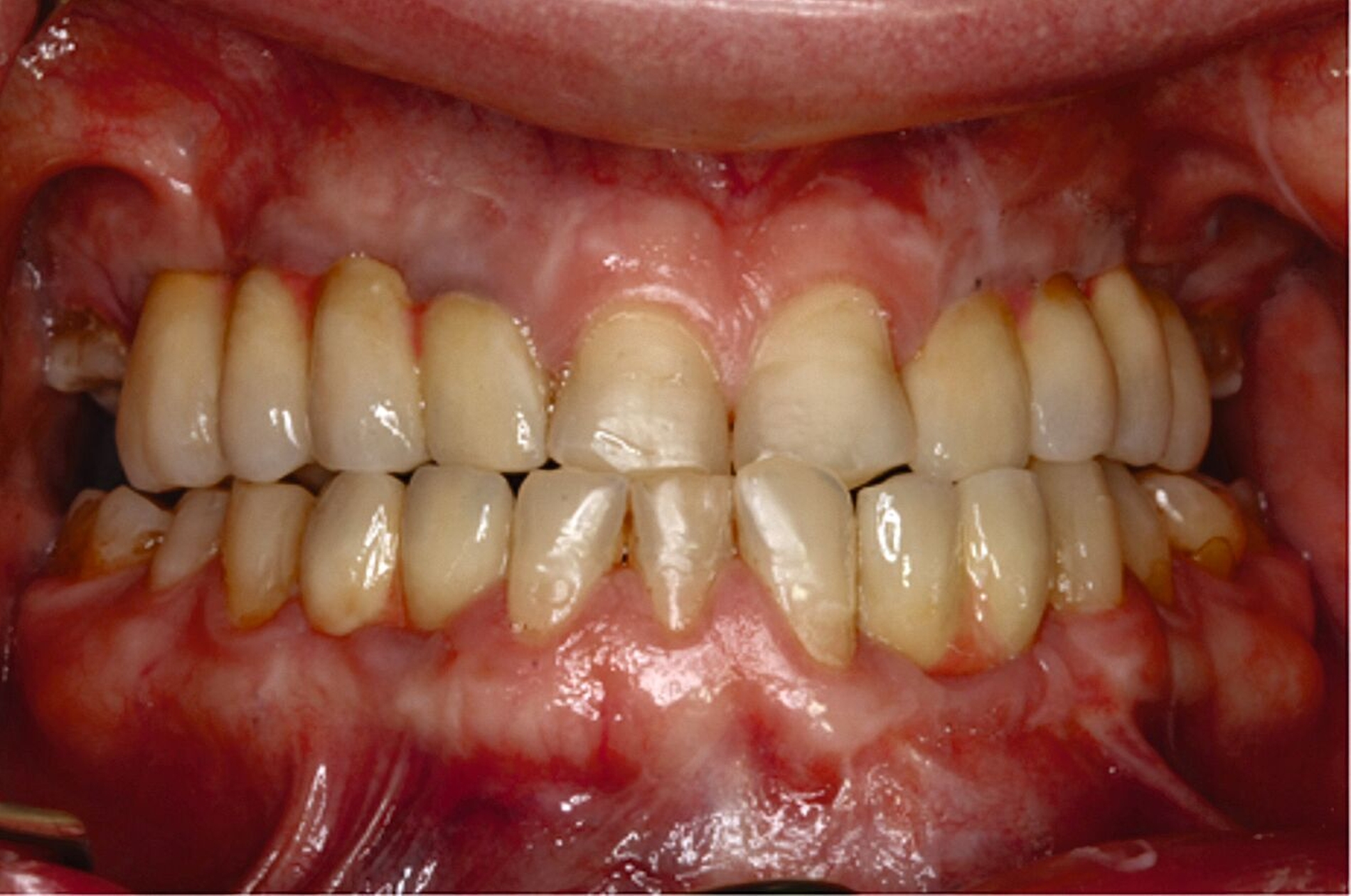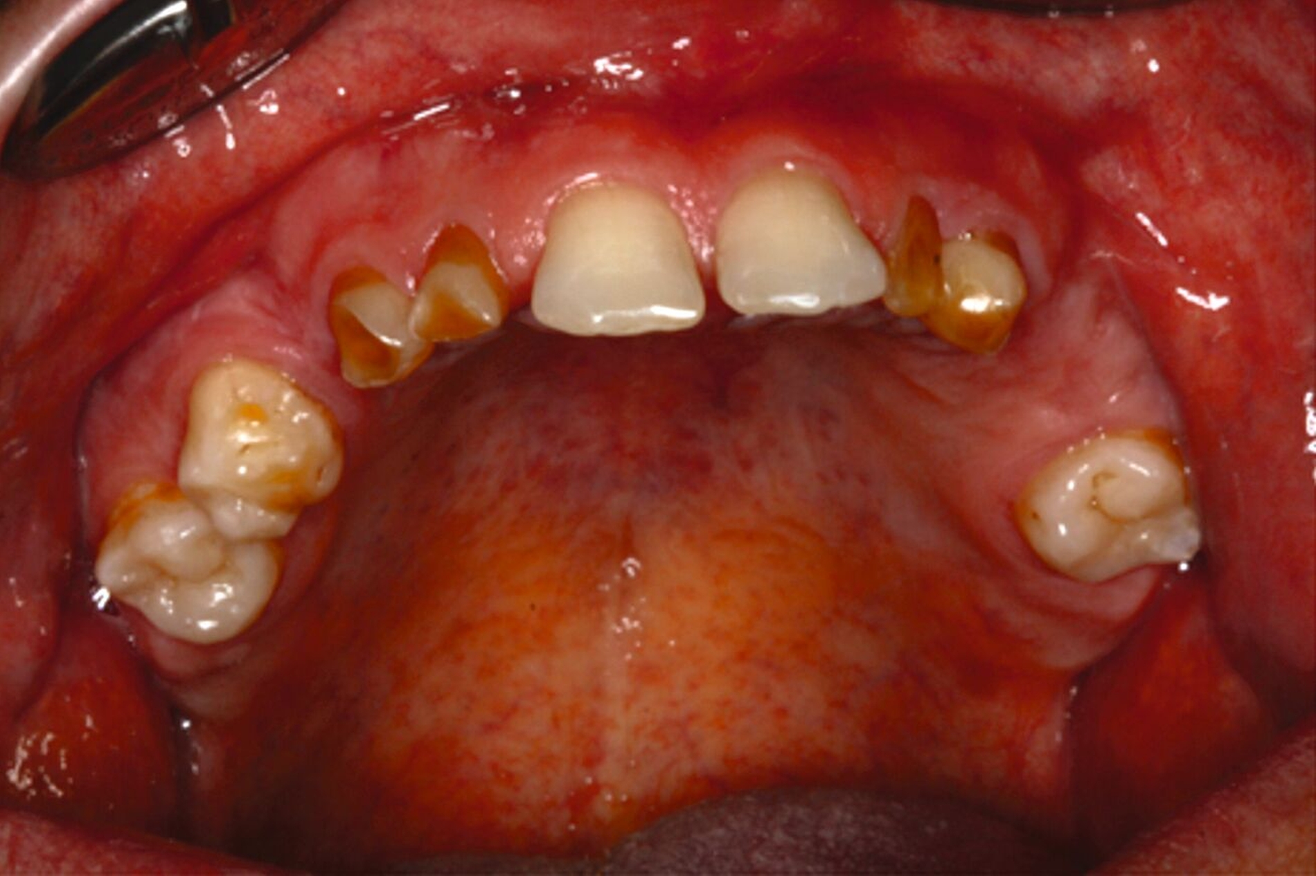 Ein 30-jähriger Patient stellte sich mit multipler Oligodontie (15 fehlende bleibende Zähne), Persistenz von Milchzähnen sowie ausgeprägter Dysgnathie mit progenem Deckbiss vor. Klinisch zeigten sich hypoplastische Restzähne, Fehlstellungen und erhebliche funktionelle Beeinträchtigungen (Abbildung 1). Sein Wunsch bestand in einer möglichst optimalen ästhetischen und funktionellen Versorgung seiner für ihn äußerst unbefriedigenden Gebisssituation. Die molekulargenetische Analyse bestätigte eine homozygote Mutation im WNT10A-Gen als Ursache der Zahnagenesie.