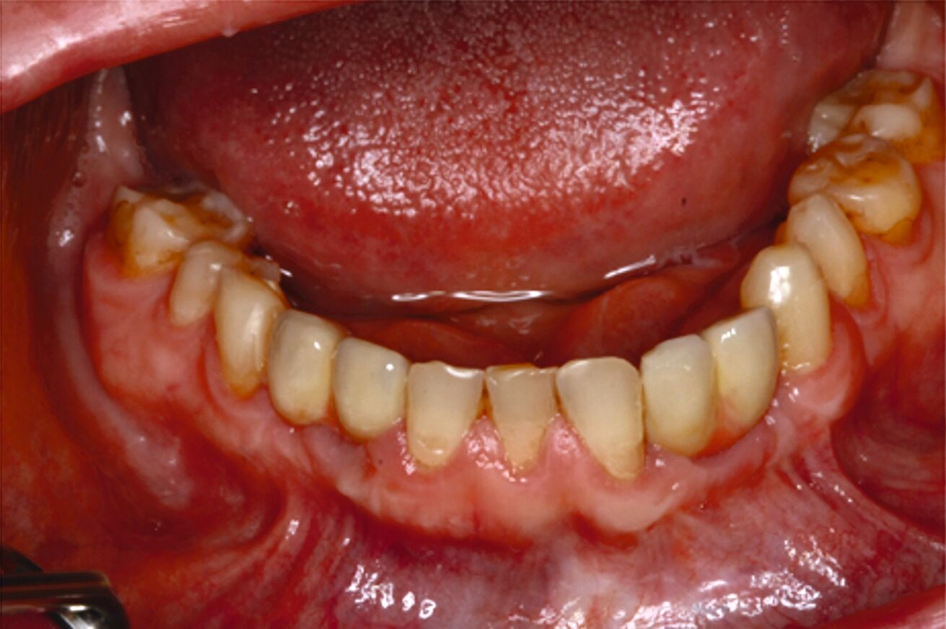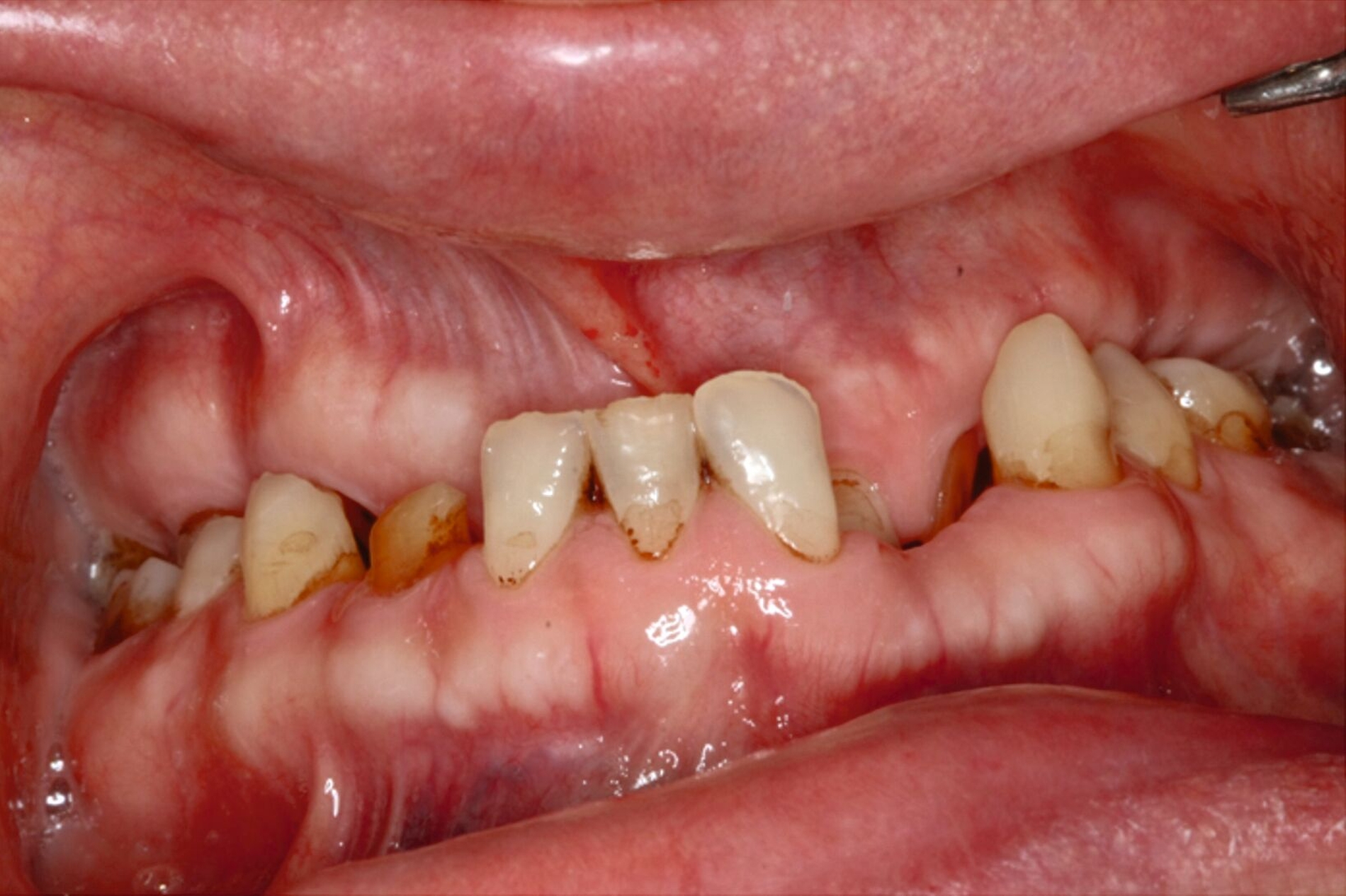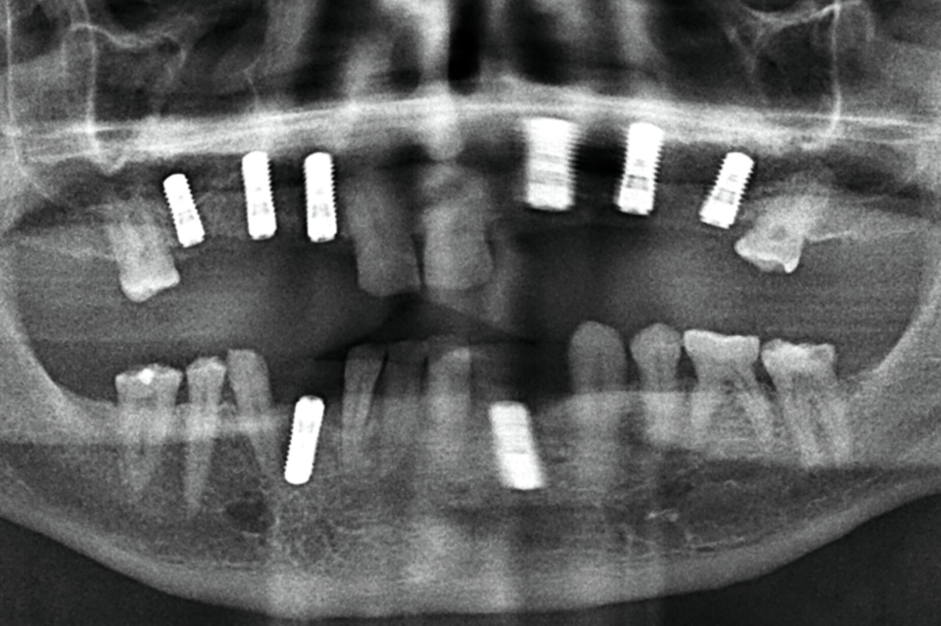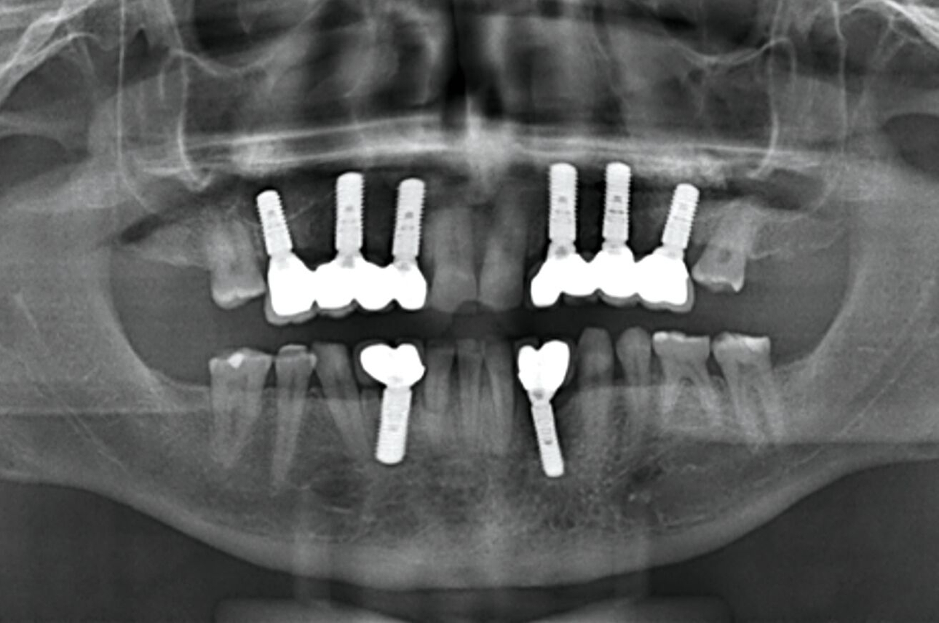 Über Abutmenteinproben, Korrekturen der angestrebten Bisslage sowie Gerüst- und Rohbrandeinproben erfolgte die definitive Eingliederung der festsitzenden Versorgung auf den natürlichen Zähnen und den Implantaten. Zehn Monate nach Beginn des mehrzeitigen operativen Vorgehens konnte die komplexe interdisziplinäre Versorgung des Patienten der äußerst ungünstigen Zahn- und Bisssituation nahezu abgeschlossen und zur Zufriedenheit des Patienten finalisiert werden (Abbildung 10).
