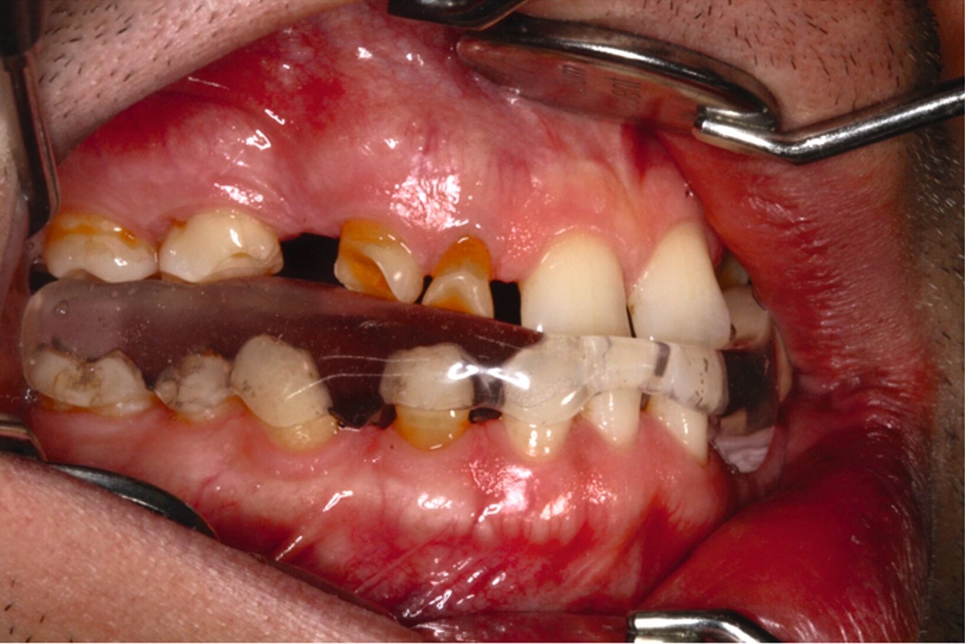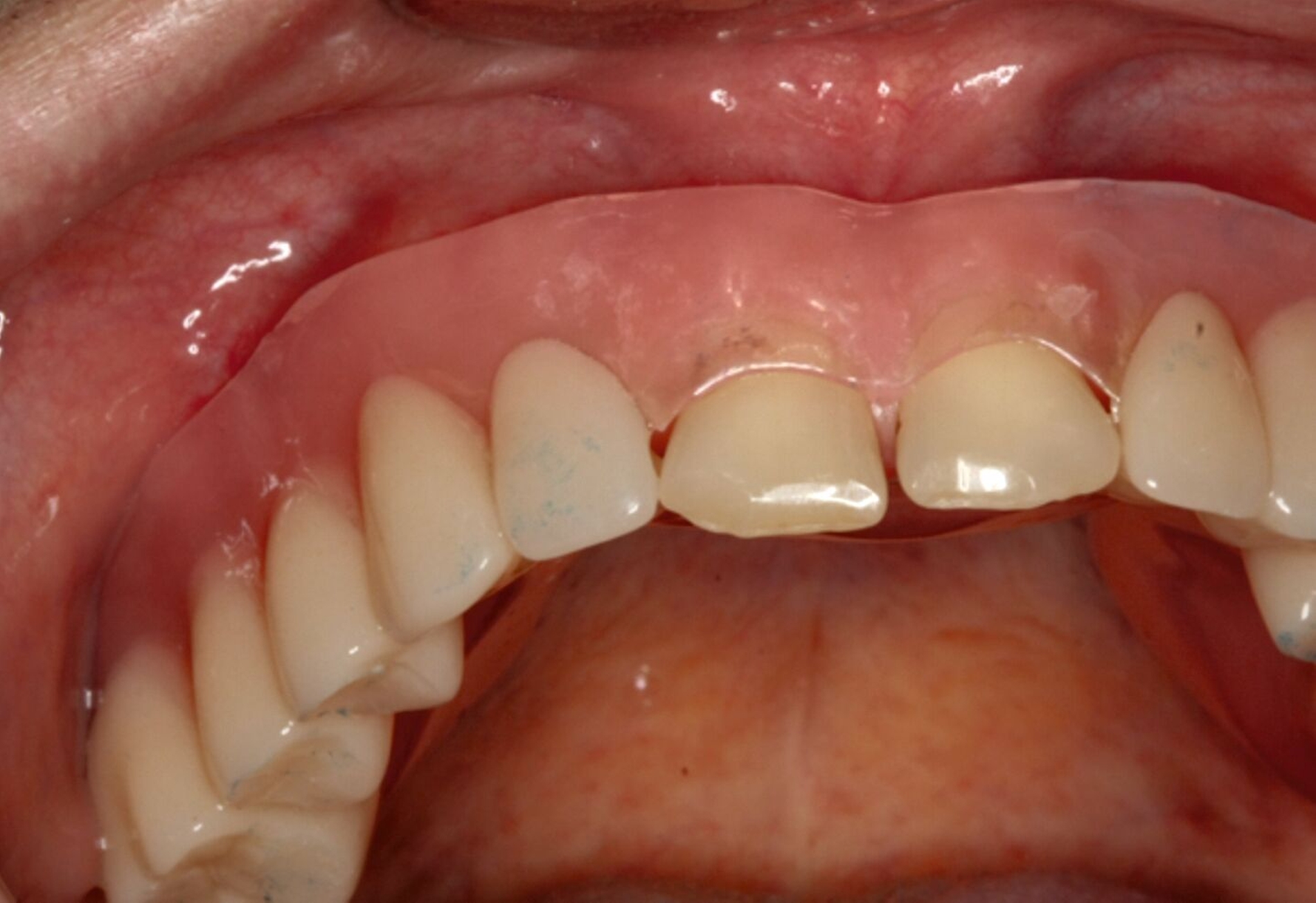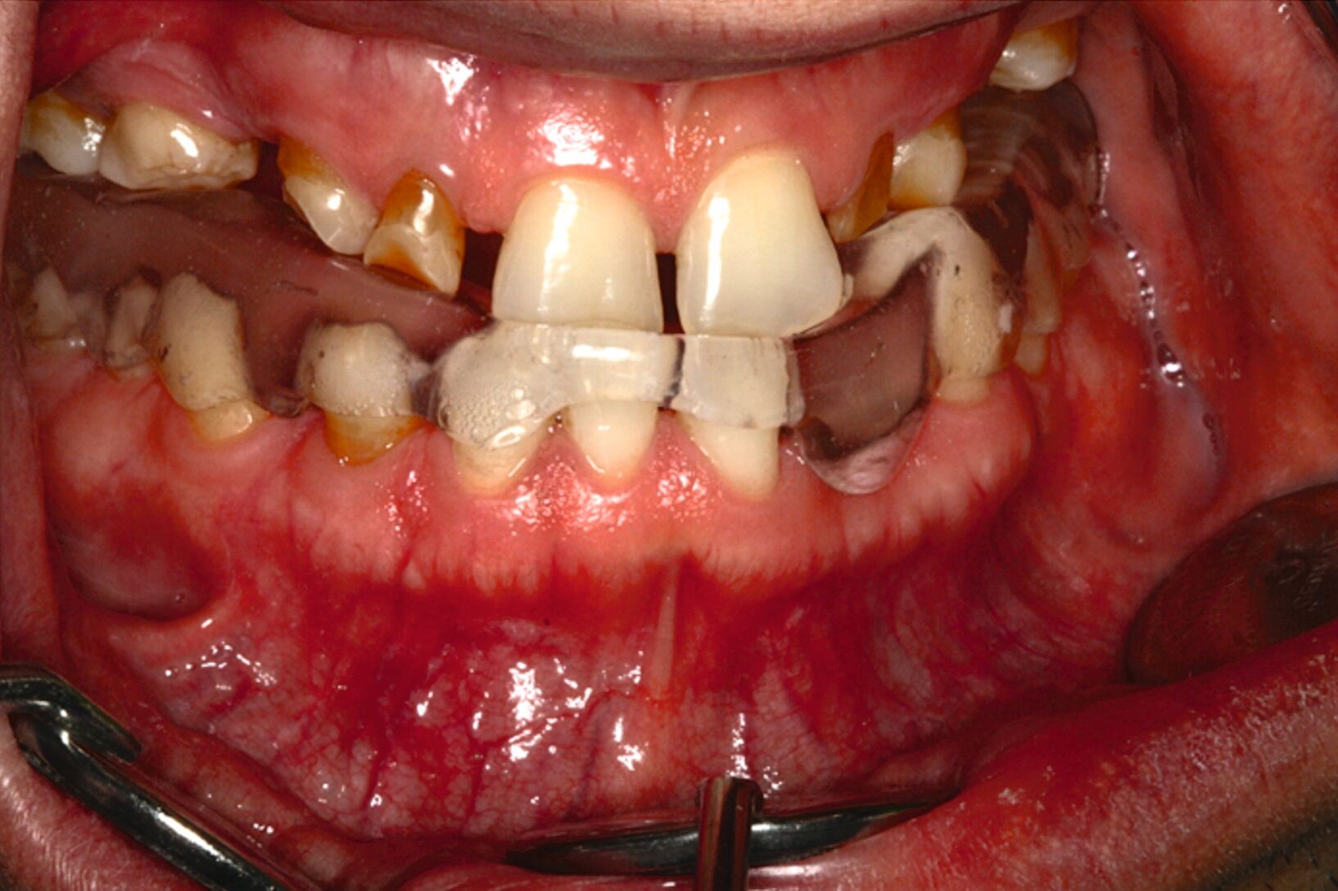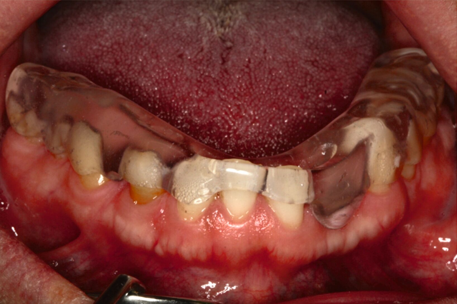 Eine mögliche und indizierte Umstellungsosteotomie wurde vom Patienten abgelehnt. Da seitens des Patienten eine Kopfbissstellung möglich war, wurde eine Bissumstellung und -hebung mit nur noch geringgradigem Vorbiss und anschließender Zahnimplantation in Erwägung gezogen. Begonnen wurde mit einer temporären Schienentherapie zur Neuorientierung der Bisslage (Abbildung 3). Da der Patient die angepasste Bisshebung tolerierte, wurde diese nach Entfernung der persistierenden Milchzähne 55, 53, 52, 62 und 83 temporär mittels einer Valplastprothese (Abbildung 4) als Interimsersatz im Oberkiefer gesichert.