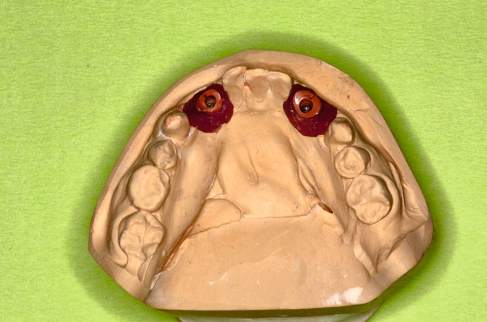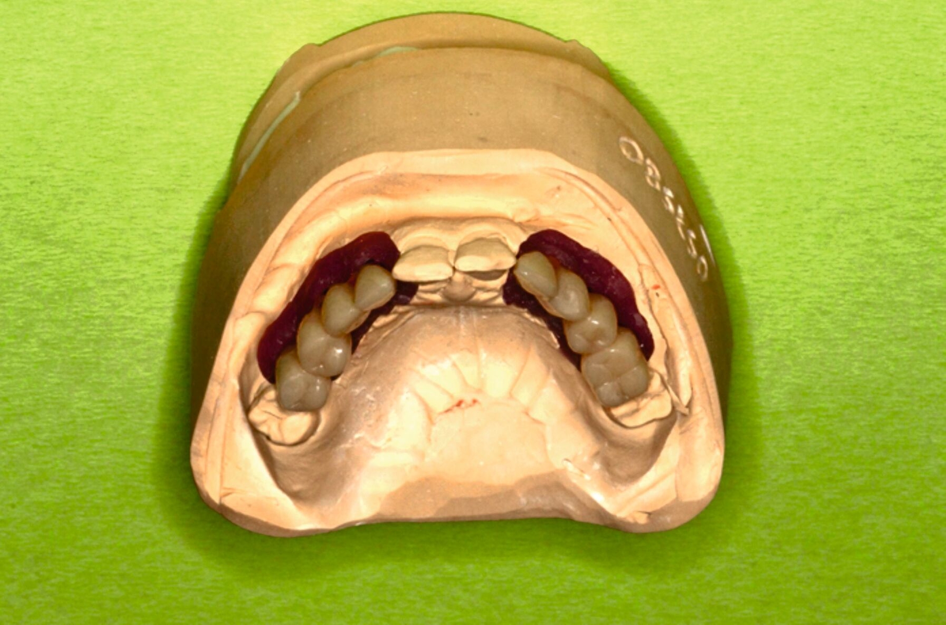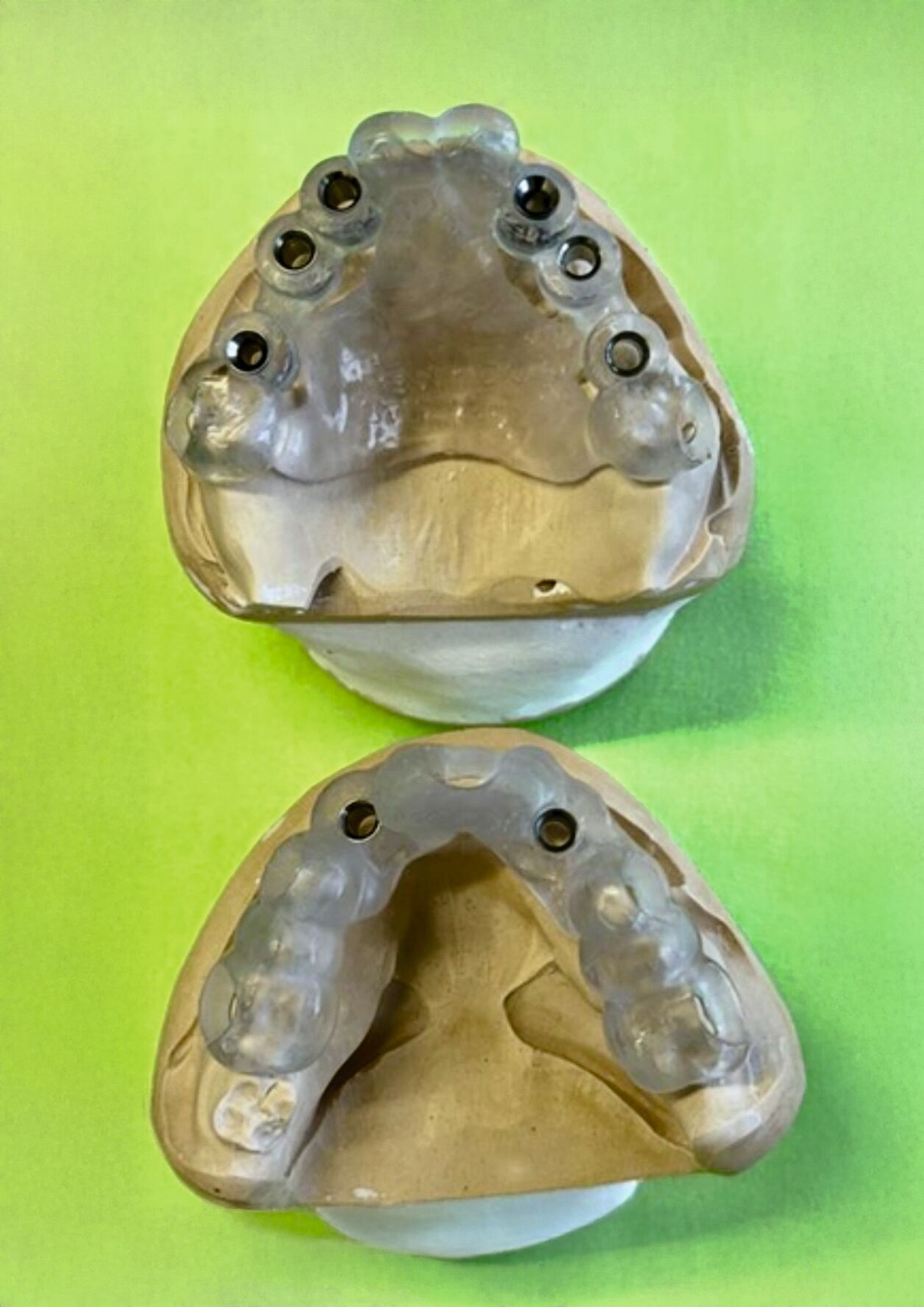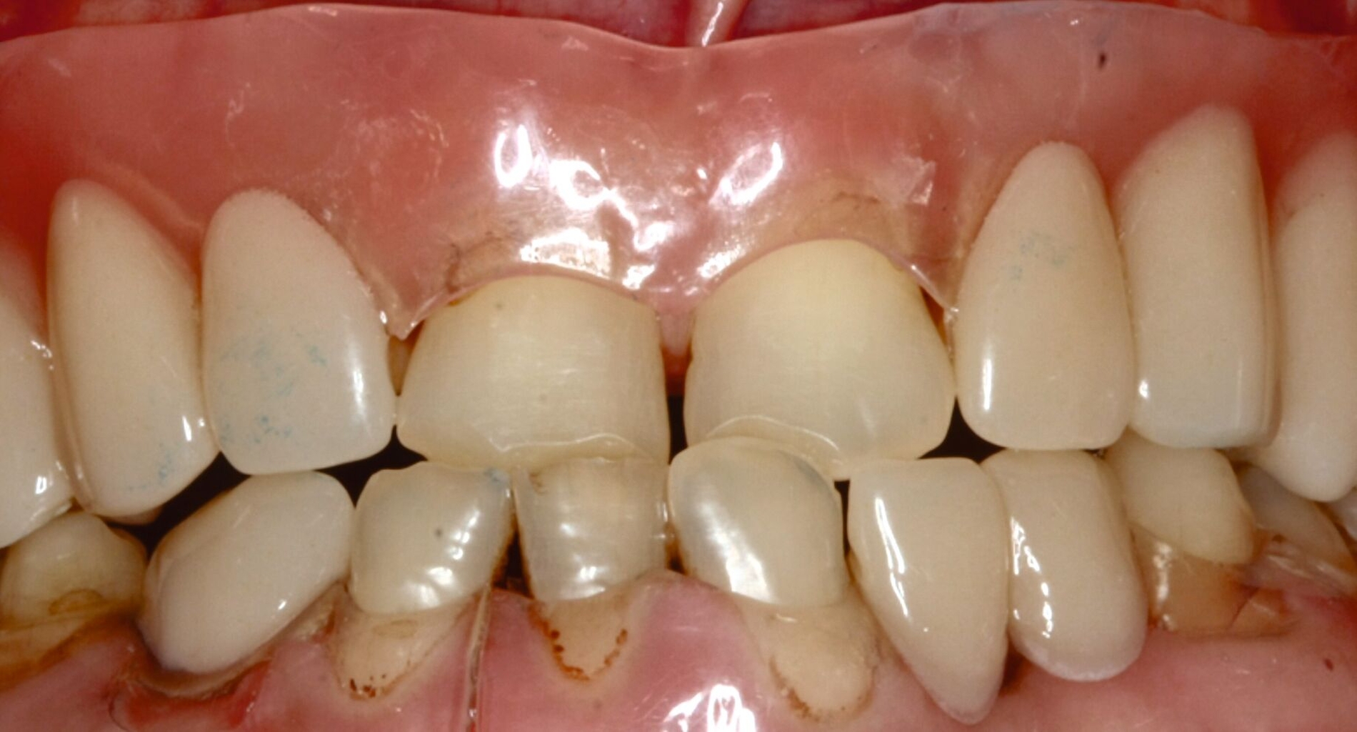 Eine mögliche und indizierte Umstellungsosteotomie wurde vom Patienten abgelehnt. Da seitens des Patienten eine Kopfbissstellung möglich war, wurde eine Bissumstellung und -hebung mit nur noch geringgradigem Vorbiss und anschließender Zahnimplantation in Erwägung gezogen. Begonnen wurde mit einer temporären Schienentherapie zur Neuorientierung der Bisslage (Abbildung 3). Da der Patient die angepasste Bisshebung tolerierte, wurde diese nach Entfernung der persistierenden Milchzähne 55, 53, 52, 62 und 83 temporär mittels einer Valplastprothese (Abbildung 4) als Interimsersatz im Oberkiefer gesichert.