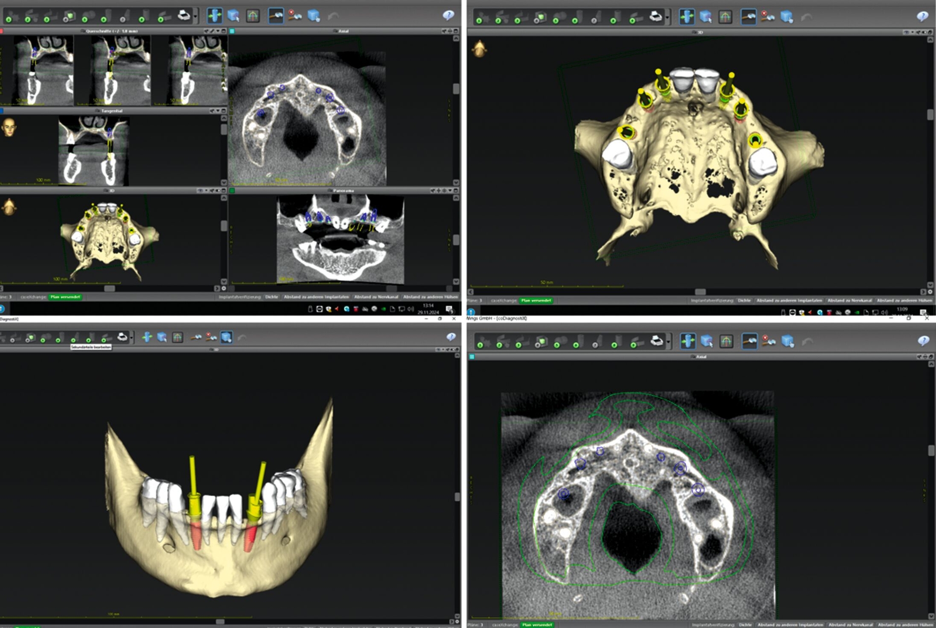 Zur Implantationsplanung wurden nach Abschluss der Vorbehandlungen und Prophylaxemaßnahmen zunächst eine digitale Volumentomografie (DVT) sowie aktuelle Situationsmodelle von Ober- und Unterkiefer zur Beurteilung der ossären Ausgangssituation erstellt. Es folgte die digitale Planung der Implantationen an den Regionen 12, 13, 13, 22, 23, 25, 33 und 43 (CoDiagnostiX Dental Wings, Straumann, Basel, Schweiz) sowie die Übertragung der dreidimensional geplanten Implantationen in gedruckte Bohrschablonen und die Festlegung von Art und Zeitpunkt erforderlicher Augmentationen (Abbildung 5).