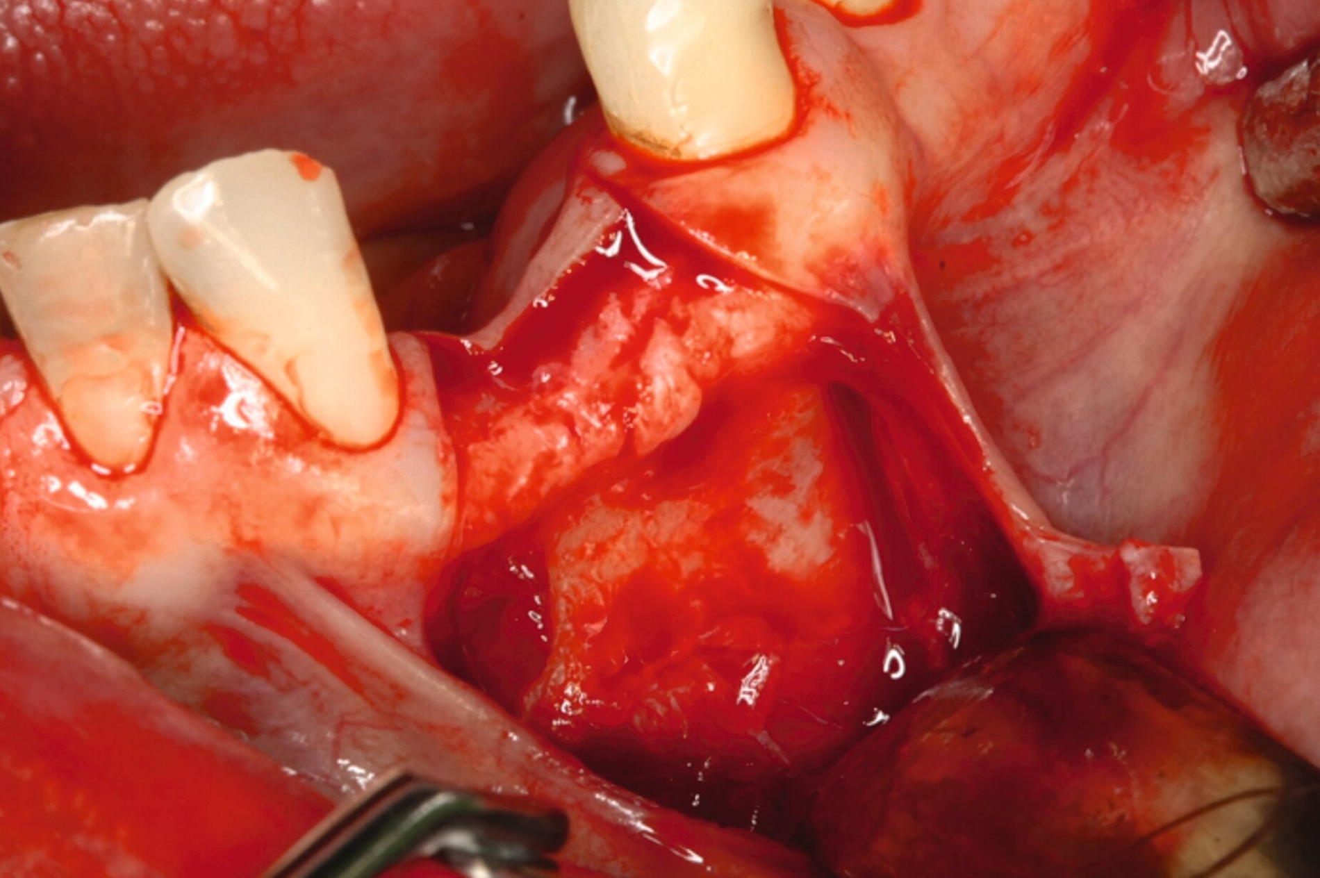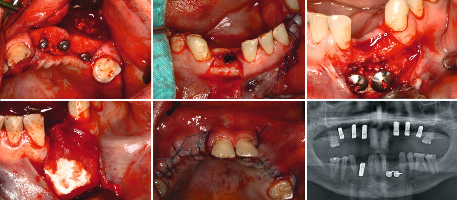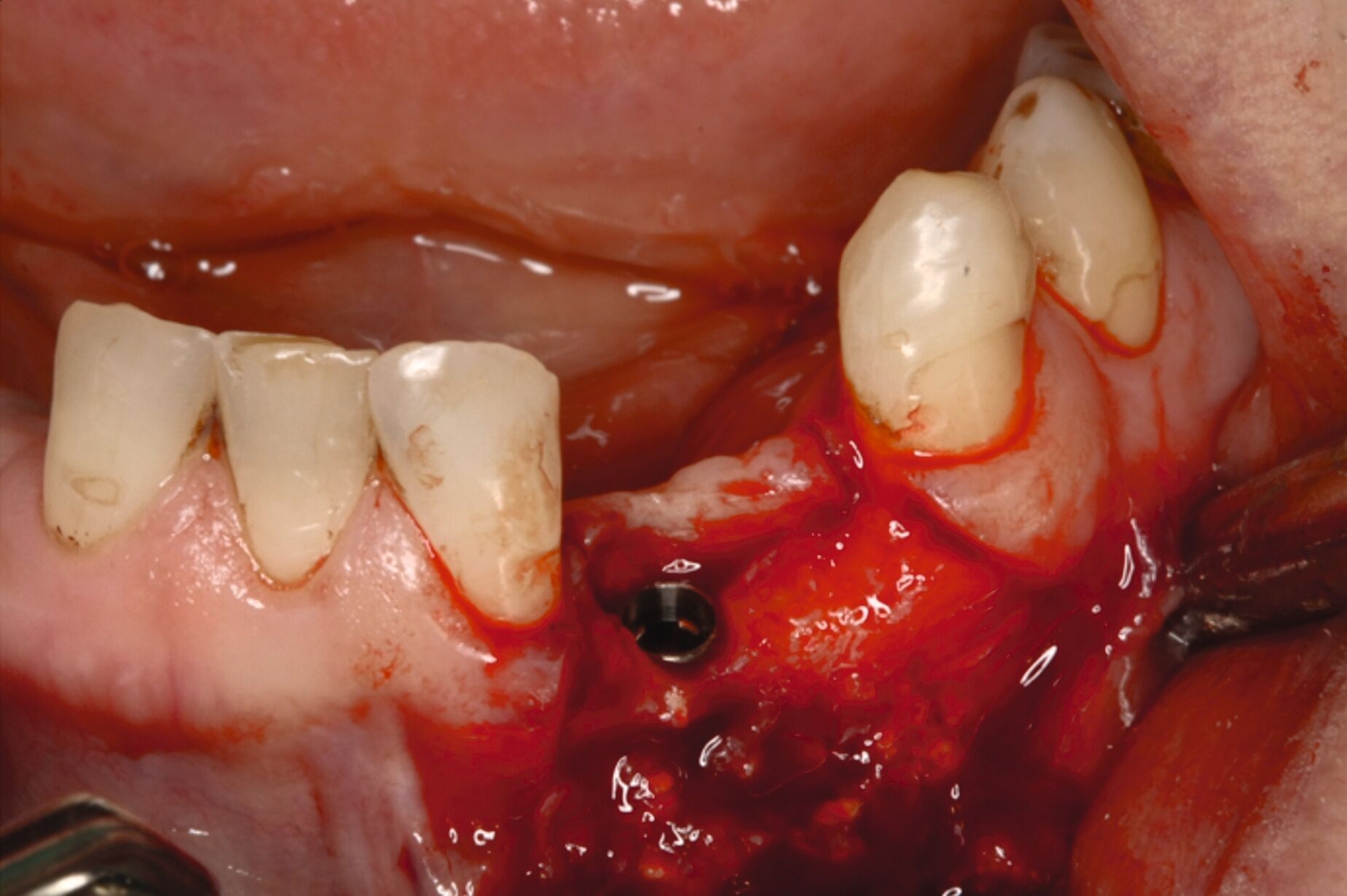 Unter intravenöser Sedierung wurden Implantate im Ober- und Unterkiefer inseriert, kombiniert mit Sinusbodenelevation und vestibulären Augmentationen. Aufgrund unzureichender Knochenverhältnisse erfolgte an Regio 33 eine zweizeitige augmentative Maßnahme mit Schirmschrauben und Membran (Abbildung 6), gefolgt von der sekundären Implantation nach vier Monaten (Abbildung 7).