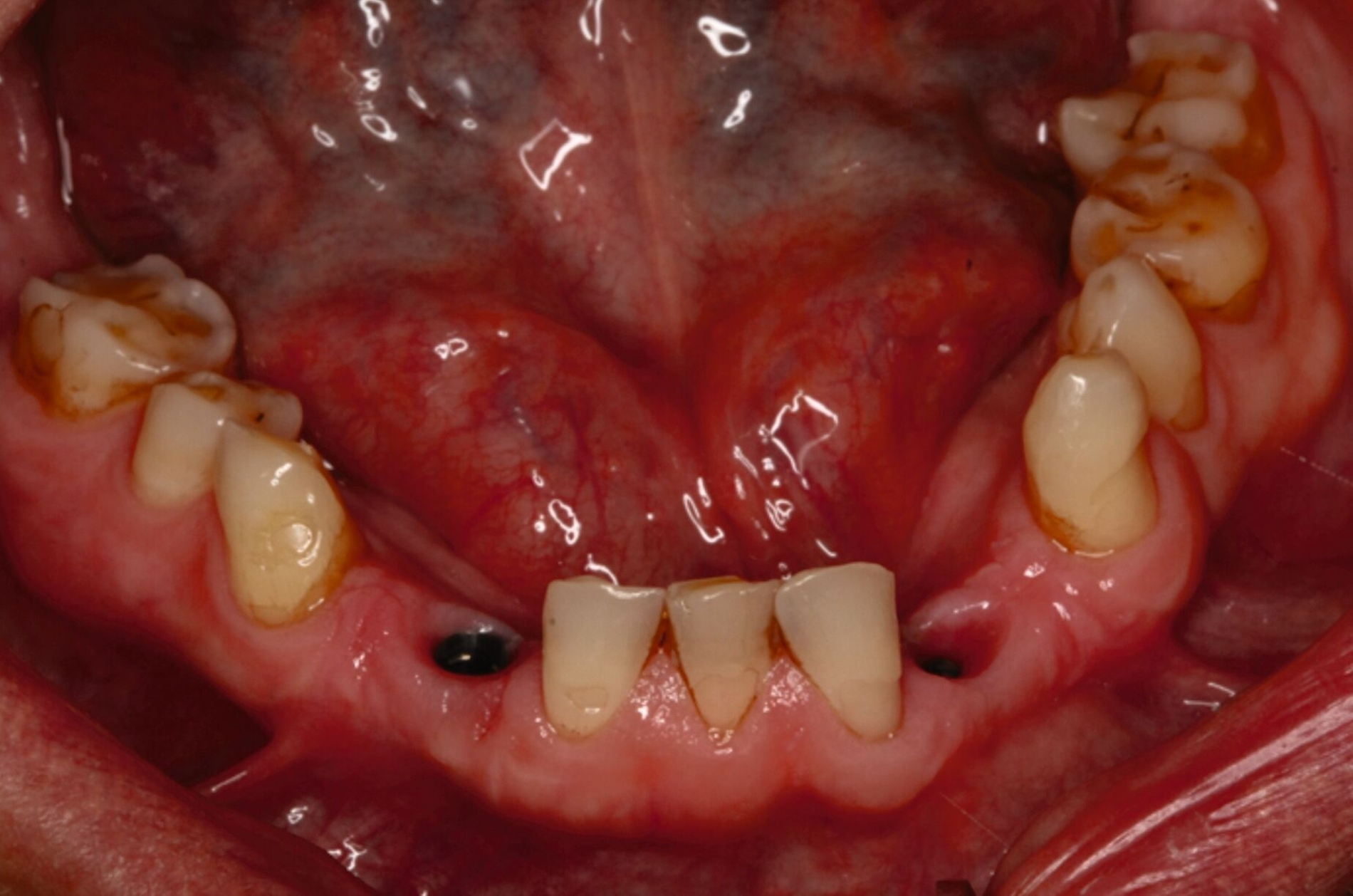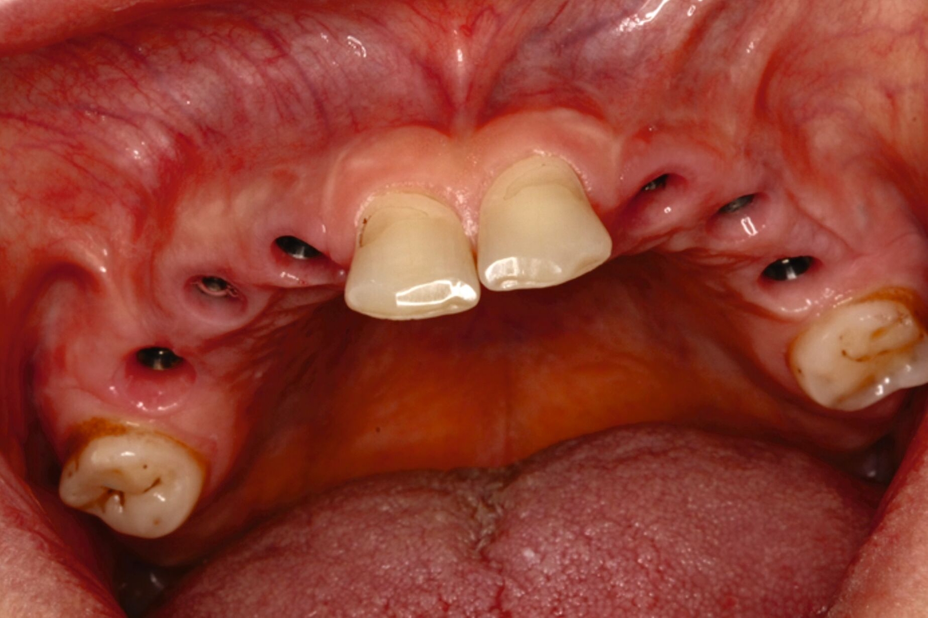Nach komplikationsfreiem Heilungsverlauf (Abbildung 8) erfolgte die Freilegung der Implantate, die Einsetzung von Gingivaformern und die Anpassung des Interimsersatzes (Abbildung 9). Wegen der dadurch anfallenden zusätzlichen Kosten verzichtete der Patient auf ein Langzeitprovisorium.