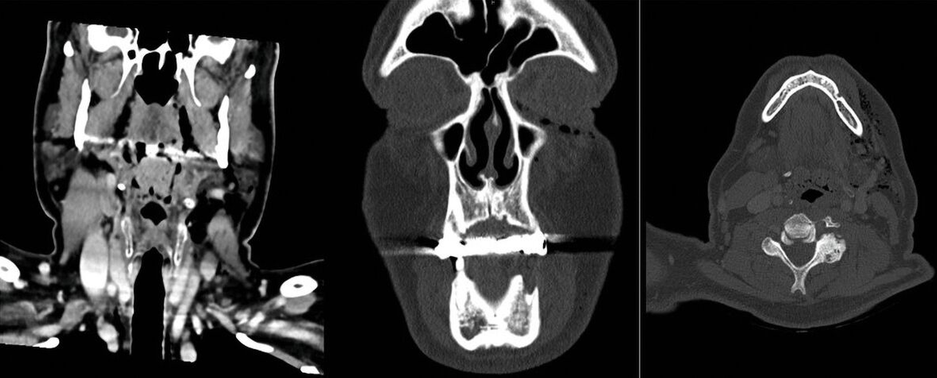 Ein 48-jähriger männlicher Patient stellte sich mit zunehmenden Beschwerden entlang des Unterkiefers und des Halses linksseitig in der mund-, kiefer- und gesichtschirurgischen Notfallaufnahme des Bundeswehrkrankenhauses Hamburg vor. Anamnestisch berichtete er über persistierende Schmerzen in der linken Gesichtshälfte seit einem Sportunfall (Sparring) im November 2024. Etwa drei Tage vor der Vorstellung war es im Rahmen einer zahnärztlichen Behandlung zu einer frustranen Extraktion des Unterkieferzahns 35 mit Radix relicta gekommen. Der Patient berichtete, dass bei der frustranen Extraktion wiederholt „ein Luftpüster“ zur Verbesserung der Sichtverhältnisse eingesetzt worden war. Seit dem Eingriff hätten sich die Beschwerden deutlich verschlimmert. Neben intensiven Hals- und Armschmerzen beklagte der Patient insbesondere ein Knistern im Halsbereich. Eine bekannte Penicillinallergie wurde angegeben, weitere relevante Vorerkrankungen oder regelmäßige Medikamenteneinnahmen lagen nicht vor.