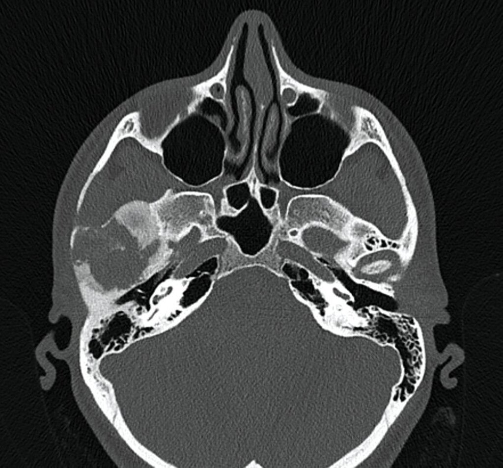 Eine 34-jährige Patientin wurde im Rahmen einer Routineuntersuchung ohne Beschwerden auf Anraten ihrer behandelnden Zahnärztin vorgestellt. Zufällig wurde bei bildgebenden Verfahren eine Läsion im Bereich des Os temporale und der Kiefergelenksregion rechts entdeckt.