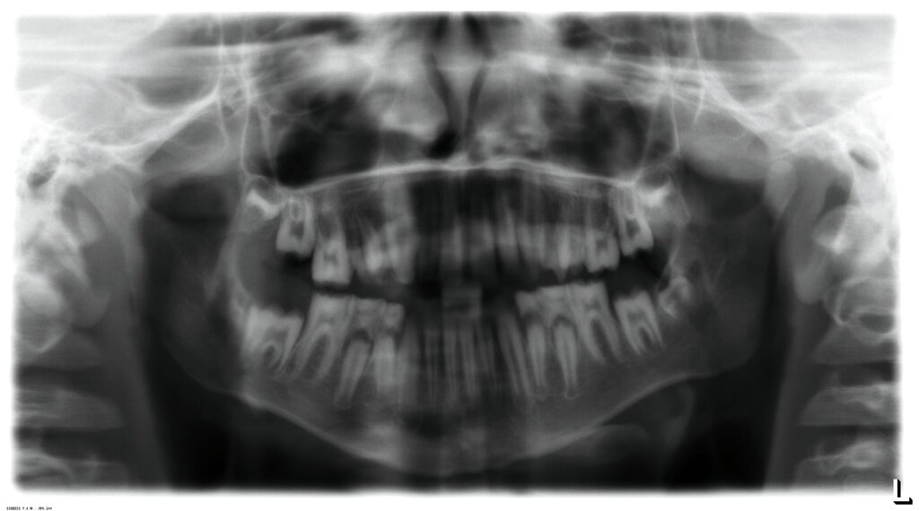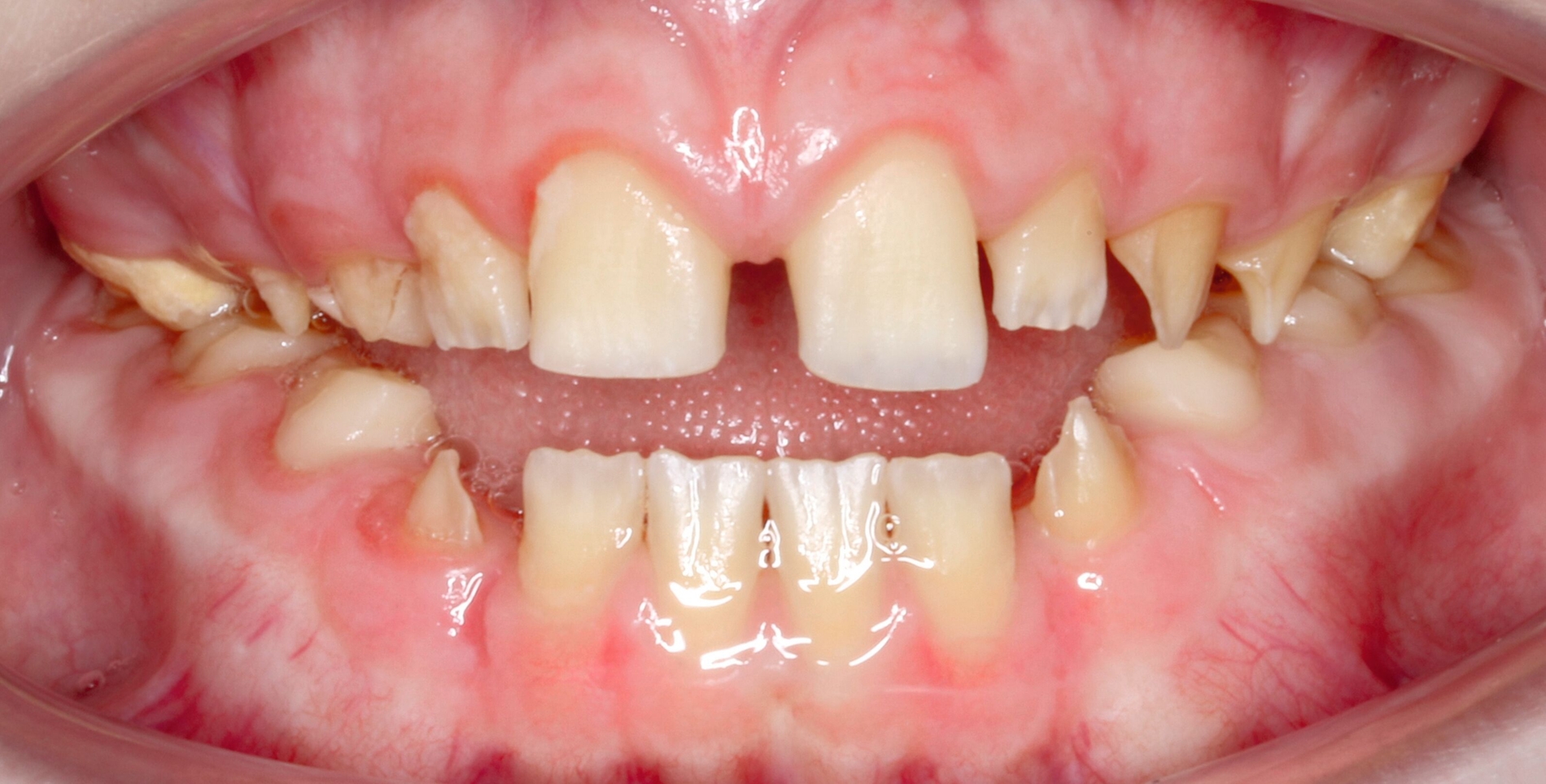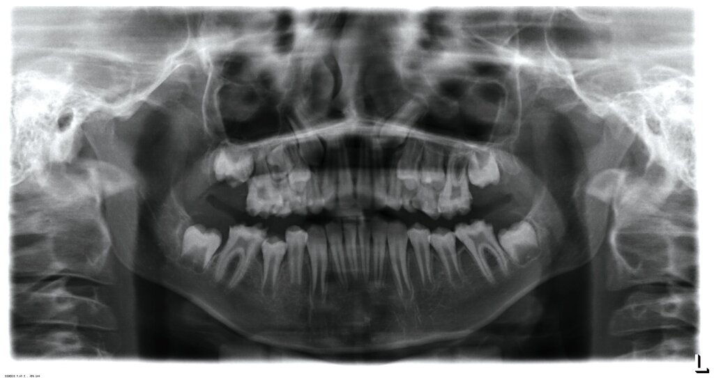 Klinisch zeigten sich ein nicht-kariöses Wechselgebiss mit generalisierter Schmelzhypoplasie an allen Zähnen sowie eine insuffiziente Mundhygiene. Zusätzlich bestanden eine fehlende Mittellinienübereinstimmung, ein Overbite von minus vier Millimetern und ein Overjet von sechs Millimetern (Abbildung 5), die sich phonetisch in einem interdentalen Sigmatismus äußerten. Röntgenologisch waren alle Zähne angelegt, jedoch war der Zahnschmelz stark reduziert oder vollständig fehlend (Abbildung 6).
