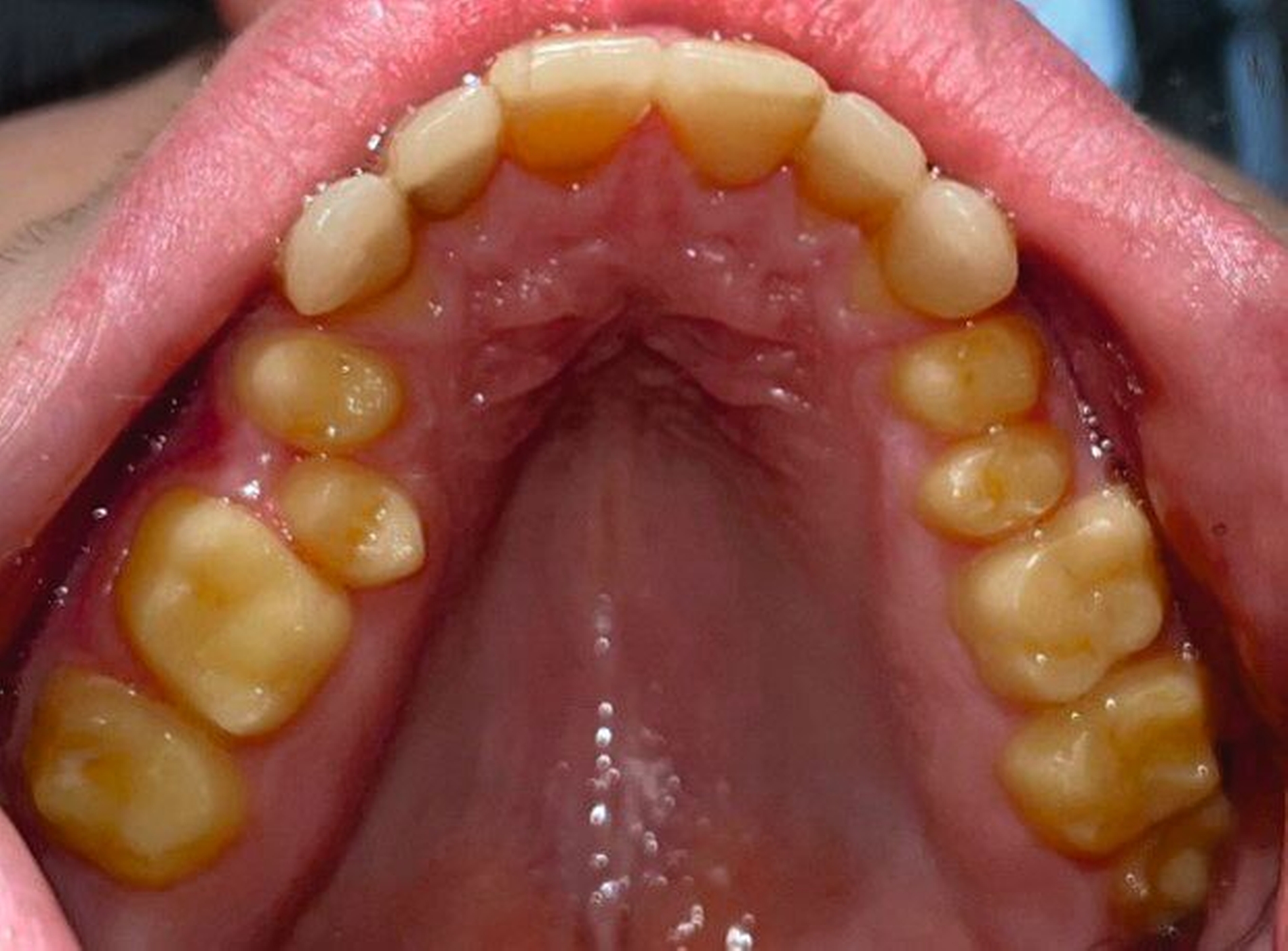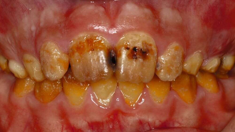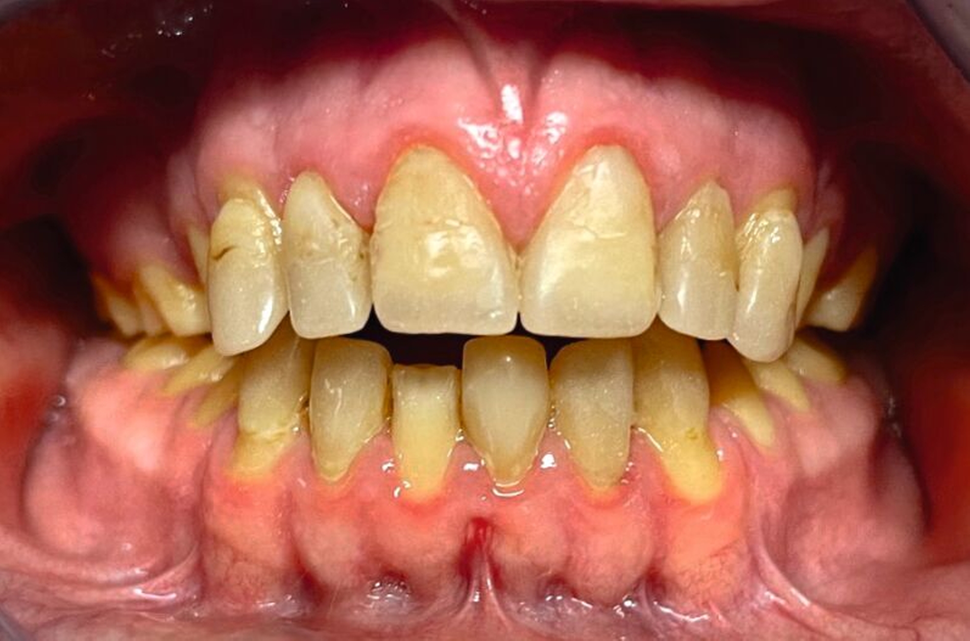 Ein elfjähriger Junge stellte sich im Februar 2023 erstmals in der Ambulanz der Klinik für Zahnerhaltung, Parodontologie und präventive Zahnheilkunde des Universitätsklinikums des Saarlandes vor. Hauptanliegen war die dunkle Zahnfarbe, aufgrund derer der Patient in der Schule gehänselt wurde. Als Geflüchteter aus Syrien ohne Deutschkenntnisse wurde er bei den ersten Terminen durch einen Dolmetscher begleitet. Die Familienanamnese war unauffällig. Allgemeinmedizinisch bestand eine anhaltende Nasenatmungsbehinderung infolge einer früheren Nasenbeinfraktur. In der speziellen Anamnese wurden Hypersensibilitäten gegenüber Kälte sowie ein ausgeprägter Würgereiz angegeben, was sich negativ auf die Mundhygiene auswirkte.