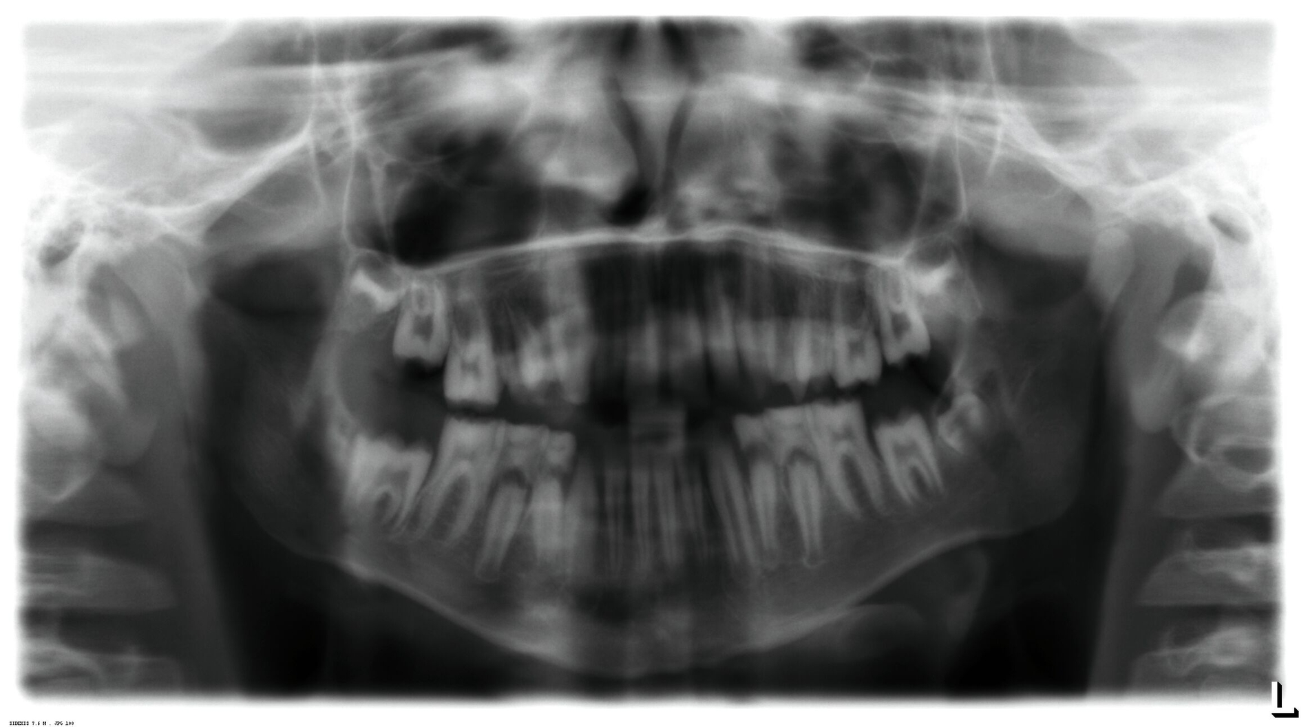 Klinisch zeigte sich ein kariöses Wechselgebiss mit generalisierten Verfärbungen und rauer Schmelzoberfläche. Mehrere Milch- und bleibende Zähne wiesen aktive kariöse Läsionen auf. Zahn 64 war zusätzlich druckdolent und gelockert, mit einer vestibulären Schwellung der Gingiva. Zudem bestanden eine Mittellinienabweichung, ein Overbite von vier Millimetern und ein Overjet von elf Millimetern (Abbildung 1). Extraoral fiel ein fliehendes Kinn mit inkomplettem Lippenschluss und hyperaktivem Musculus mentalis auf. Röntgenologisch waren alle Zähne angelegt, der Zahnschmelz zeigte jedoch eine reduzierte Opazität (Abbildung 2). Eine genetische Abklärung wurde von den Erziehungsberechtigten aus ethischen Gründen abgelehnt.