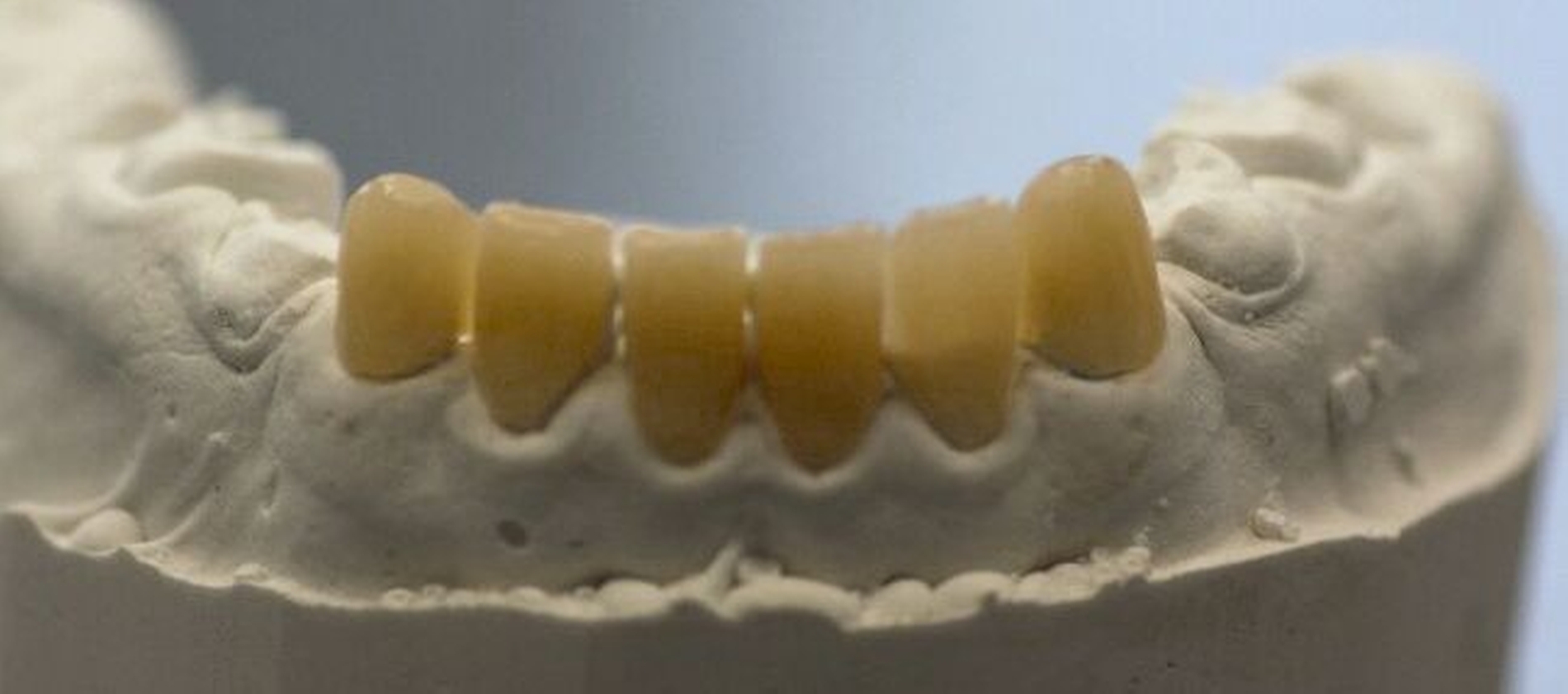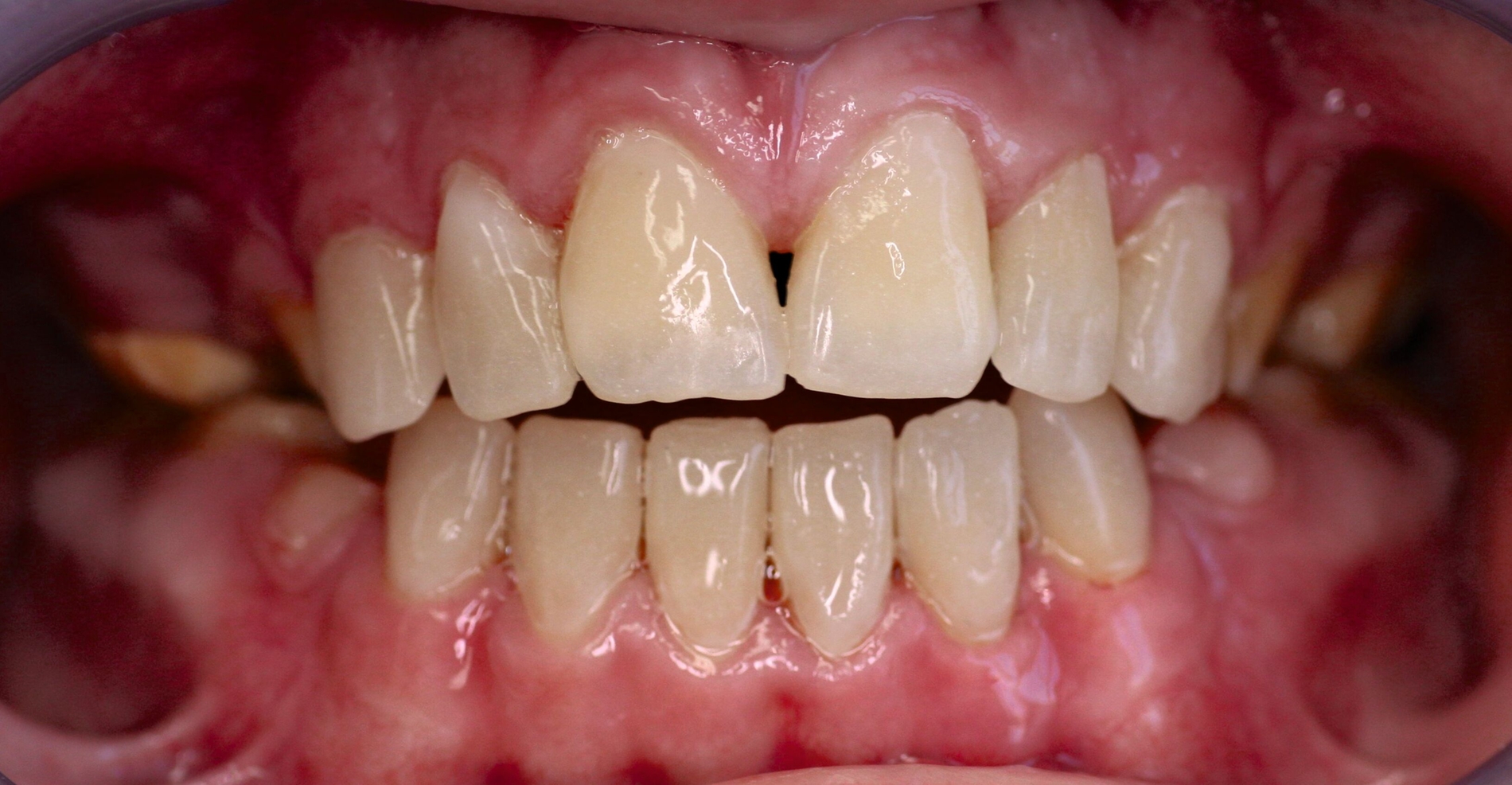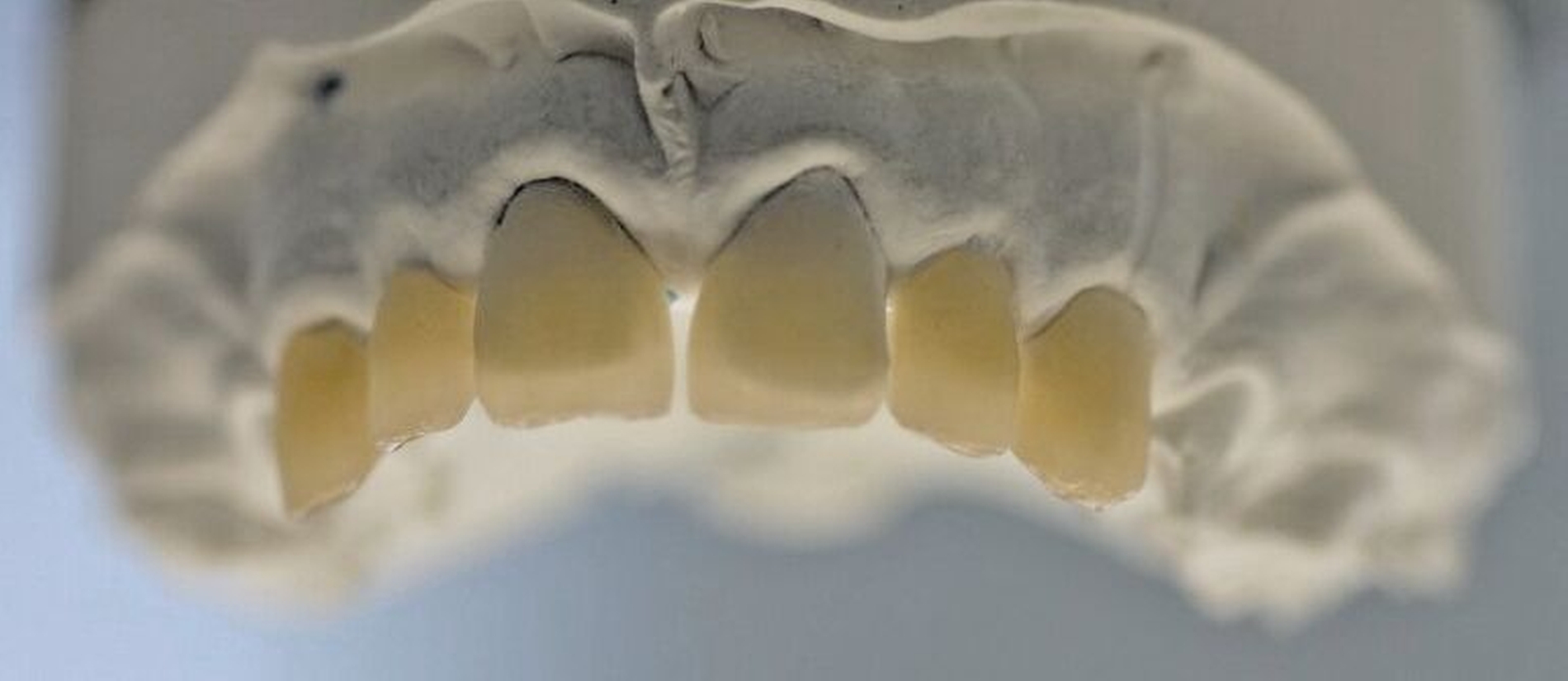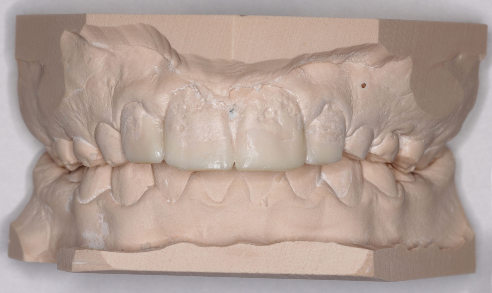 Die Therapie begann mit einer PZR und der Anfertigung eines diagnostischen Wax-ups auf Situationsmodellen. Dieses wurde in PMMA (PalaVeneer Dentine, Kulzer) umgesetzt. Nach Reinigung der Frontzähne mit Bürstchen und fluoridfreier Polierpaste erfolgte die Anprobe der Kronen. Anschließend wurden die Kronen nach Konditionierung (Clearfil SE Bond, Kuraray Dental) mit einem Befestigungskomposit (Variolink Esthetic DC, Ivoclar Vivadent) unter relativer Trockenlegung mittels Watterollen, Speichelschnecke und Sauger definitiv eingegliedert.