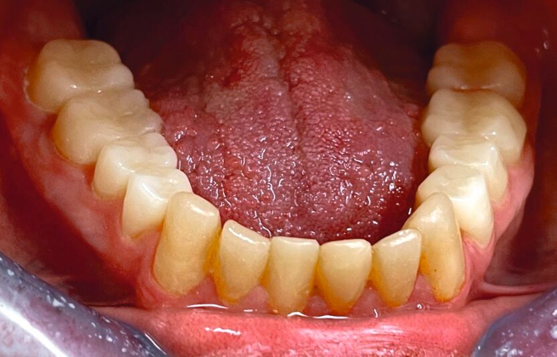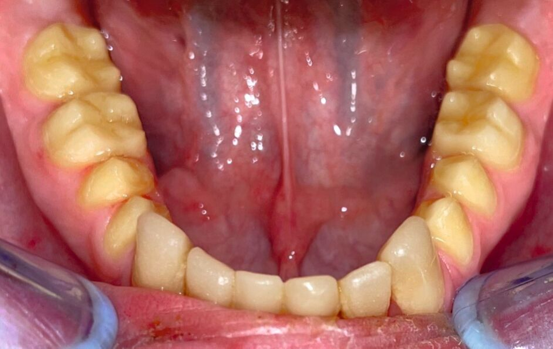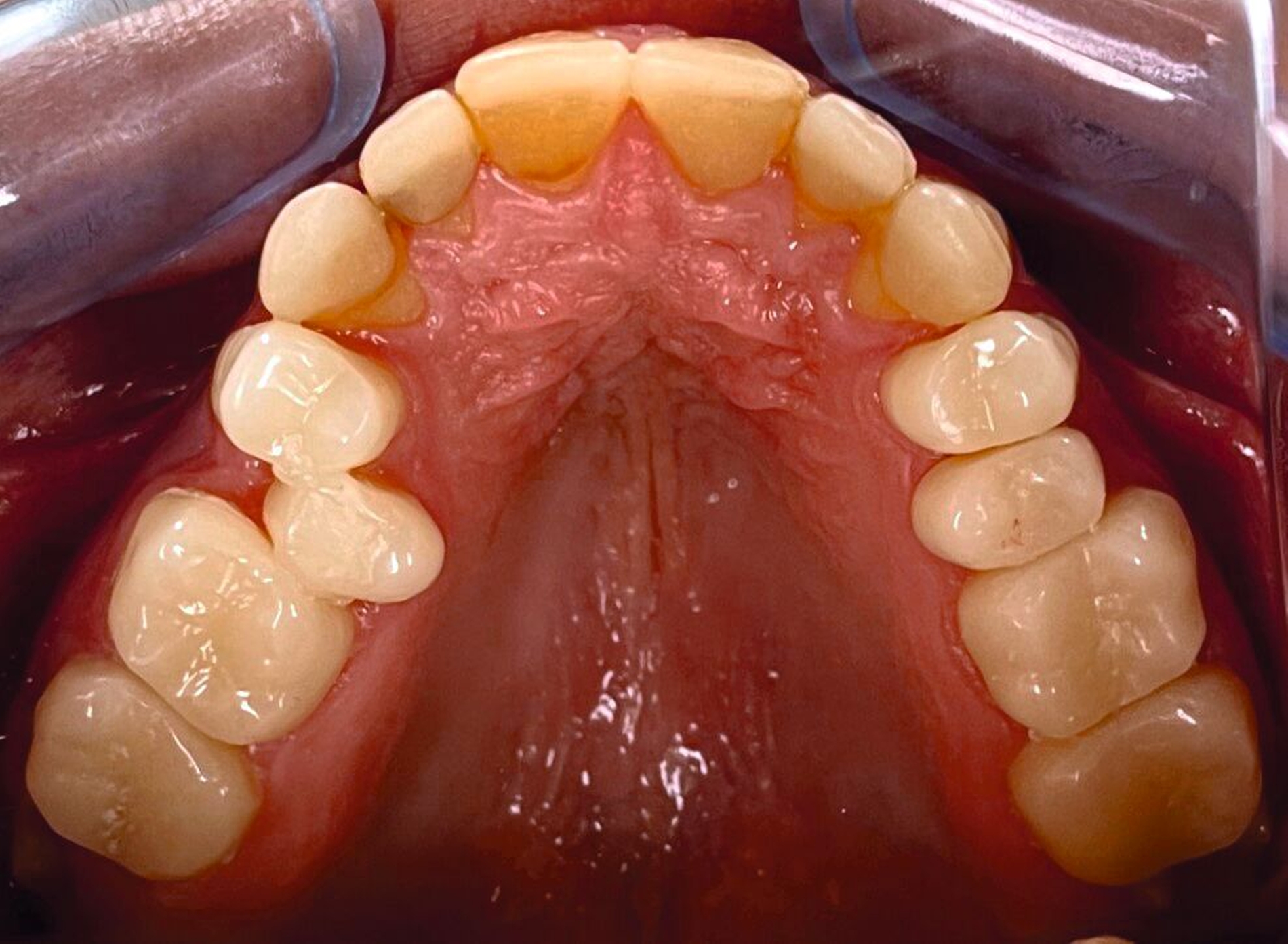 Die restaurative Versorgung erfolgte in zwei Phasen: Die Frontzähne wurden im Jahr 2018 (Abbildungen 7 und 8), die Seitenzähne im Jahr 2023 behandelt (Abbildungen 9 bis 12). Im Jahr 2018 fiel die Therapieentscheidung auf indirekte Restaurationen, da eine mangelnde Adhärenz des Patienten vorlag, die sich in geringer Geduld für längere Sitzungen äußerte. Zudem war über einen längeren Zeitraum keine zuverlässige Trockenlegung möglich. Durch diese Vorgehensweise konnten die Anzahl und die Dauer der Behandlungstermine reduziert werden.