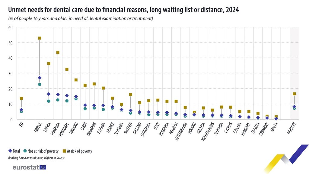 Wie Eurostat meldet, war unter den EU-Ländern der Anteil der Menschen mit ungedecktem Bedarf an zahnärztlicher Versorgung in Griechenland (27,1 Prozent), Lettland (16,5 Prozent) und Rumänien (16,2 Prozent) am höchsten. Am niedrigsten war er in Malta (0,4 Prozent), Deutschland (0,9 Prozent) und Kroatien (1,1 Prozent).