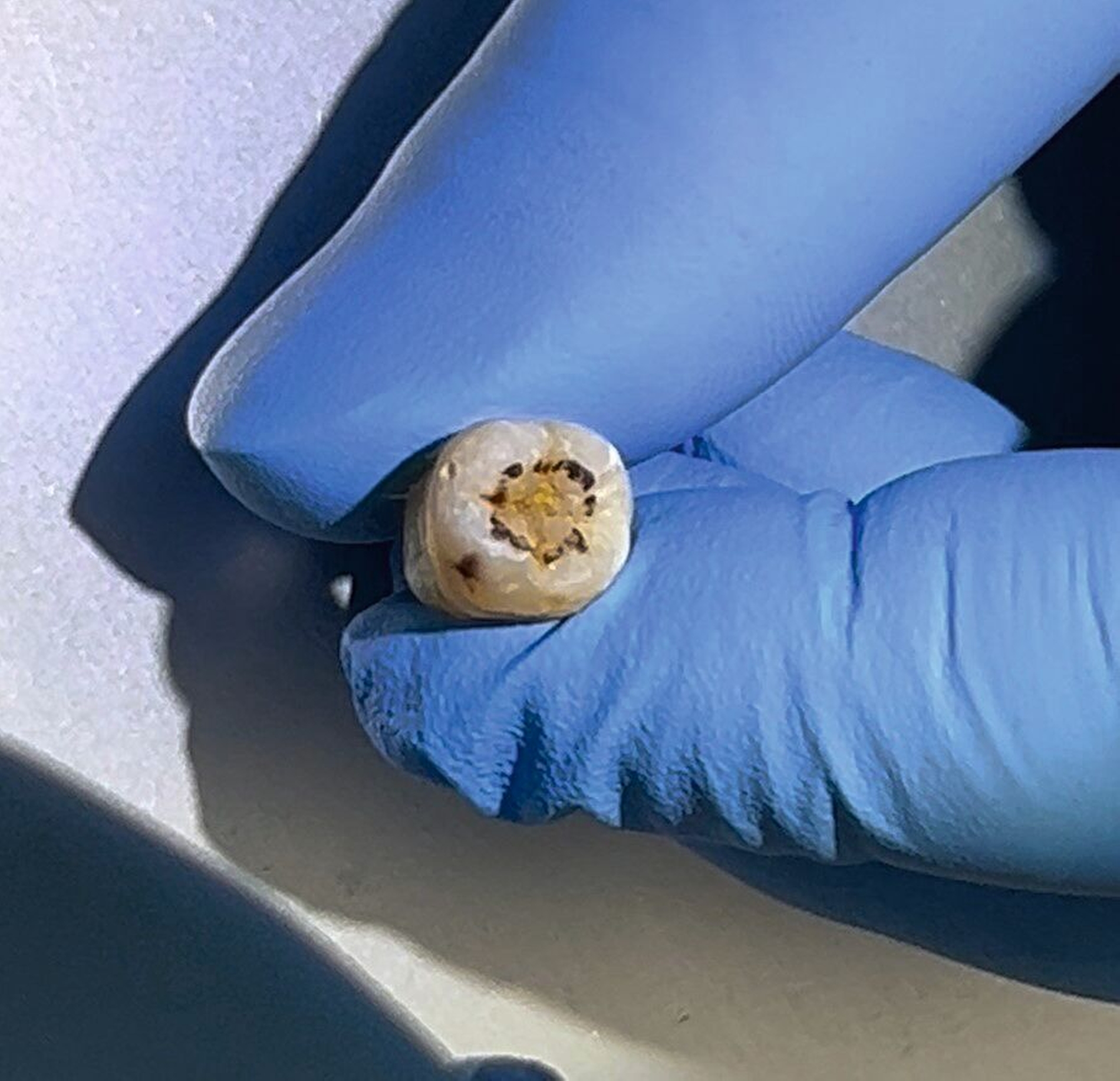 Rasch wurde eine Video-Anleitung für eine Trepanation erstellt. Dafür wurde zunächst an einem extrahierten Weisheitszahn der Bereich der Trepanationsöffnung gekennzeichnet (Abbildung 2). Anschließend wurde ein Diamantbohrer in ein Winkelstück eingespannt, die Länge des Bohrers anhand eines Referenzstücks bestimmt und die Technik der Trepanation an dem extrahierten Weisheitszahn demonstriert.
