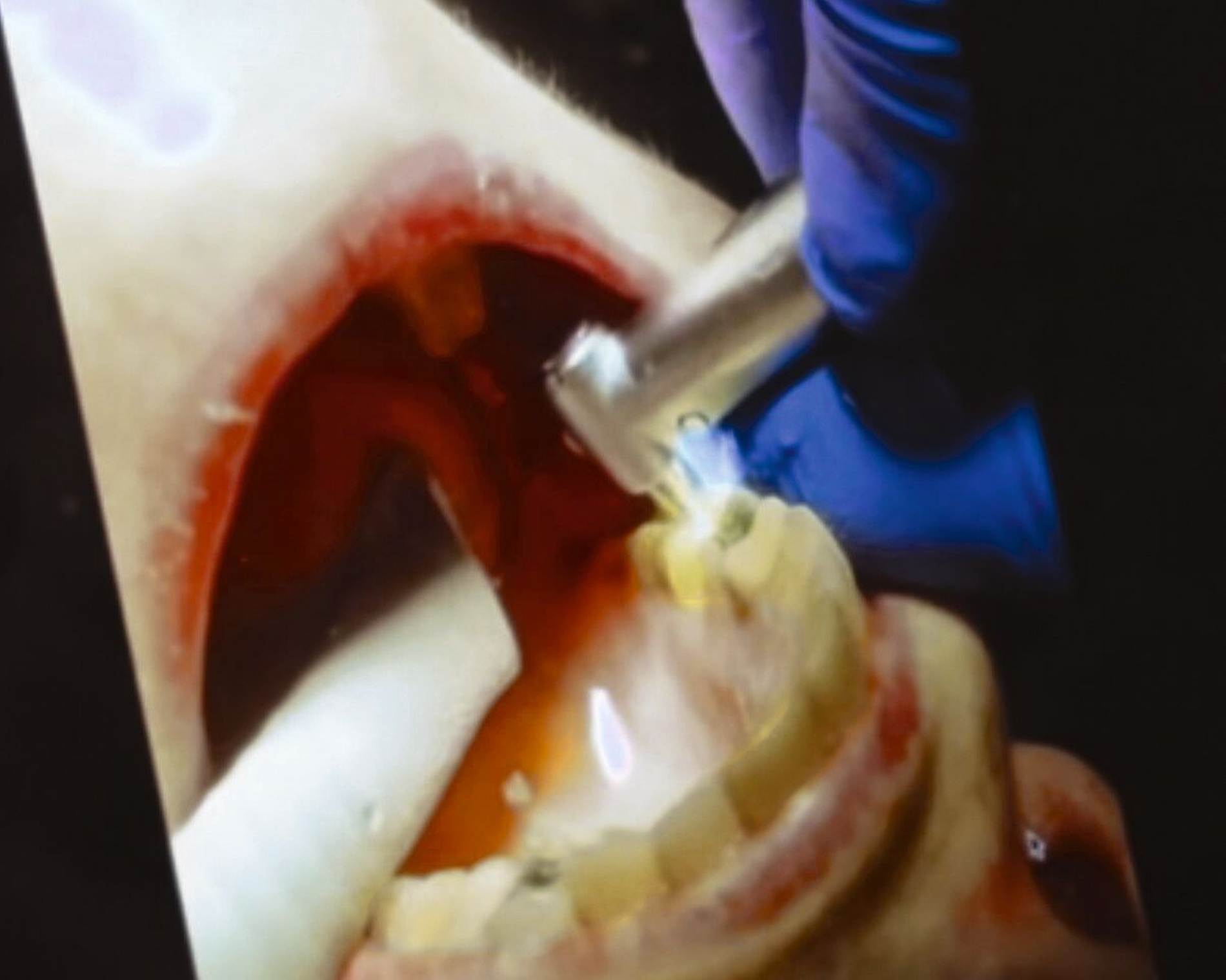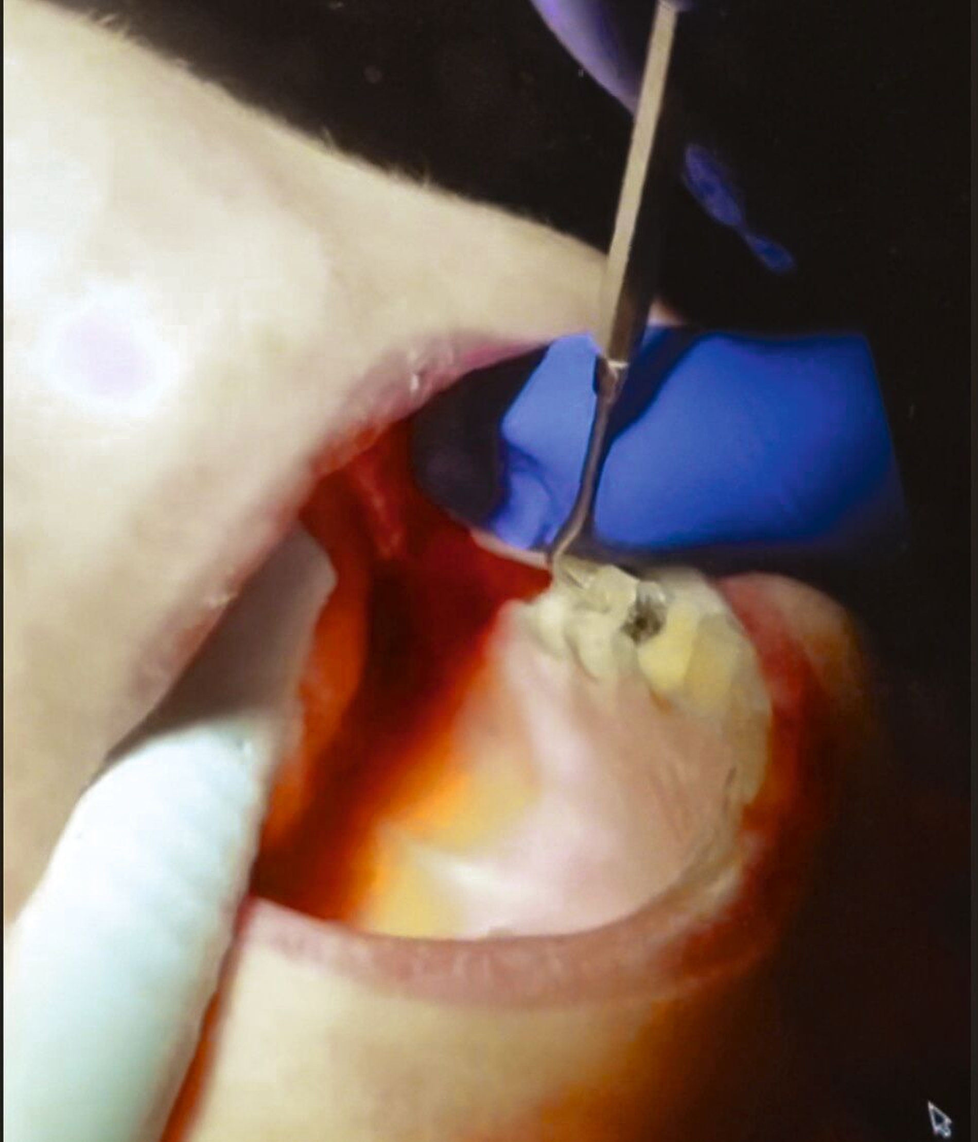Der gesamte Eingriff selbst wurde live unter telezahnmedizinischer Supervision durchgeführt. Nach der Lokalanästhesie präparierte der Koch den Zahn unter kontinuierlicher Videoanleitung. Durch die enge interdisziplinäre Zusammenarbeit und den gezielten Einsatz telezahnmedizinischer Unterstützung konnte die Präparation erfolgreich abgeschlossen werden (Abbildungen 3 und 4). Die Patientin berichtete unmittelbar nach dem Eingriff über eine deutliche Schmerzlinderung. Da die klinische Situation keine sofortige Wurzelkanalaufbereitung und -füllung erforderte, wurde der Zahn zunächst mit einem Schaumstoffpellet und Cavit provisorisch verschlossen.