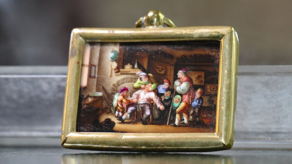 Das Dentalmuseum macht natürlich auch in Öl, Hunderte, Tausende und mehr großformatige Gemälde und Kunststiche, durch die Zeit – daneben aber eben auch größte Handwerkskunst im kleinsten Format. Mit ihrer eigenen Geschichte: Die Kunstform der Miniaturmalerei – außergewöhnlich kleine Bildgröße, meisterhafte Feinarbeit – hat ihren Ursprung in aufwendig illustrierten (illuminierten) Handschriften, vor allem religiösen Texten, des Mittelalters, später entwickelte sie sich zu einer eigenständigen Gattung (besonders beliebt in der Porträtkunst des 16. bis 19. Jahrhunderts).