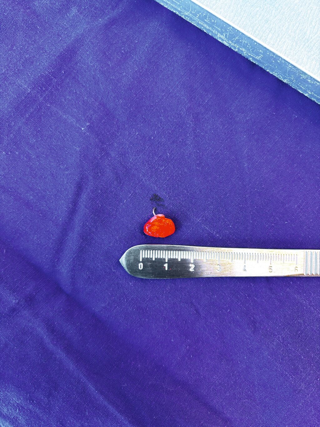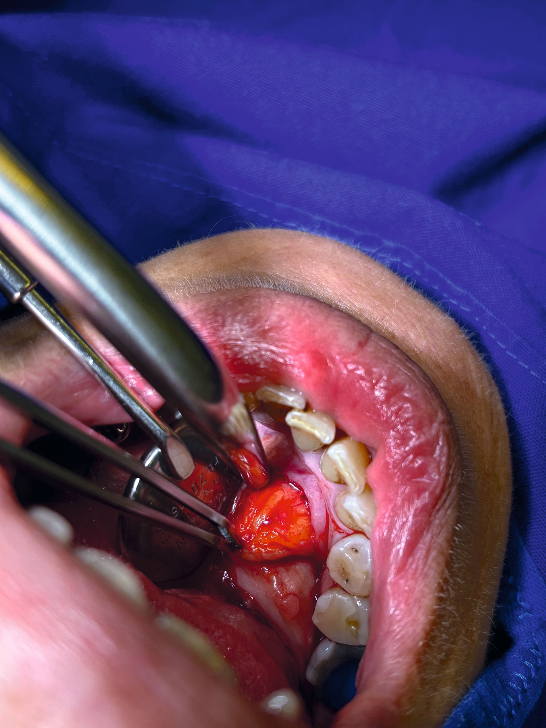 Die Schnittführung erfolgte in mesio-lateraler Richtung über das punctum maximum des Tumors. Wir entfernten den Fetttumor mittels stumpfer Präparation mit der Schleimhautpräparierschere (Abbildung 2). Der Tumor zeigte sich mit einer Größe von circa 13 mm x 10 mm (Abbildung 3). Die Wunde ließ sich problemlos adaptieren und mit einer resorbierbaren Naht (4-0) versorgen. Die postoperative Situation nach einer Woche war vollkommen reizlos (Abbildung 4). Die Patientin gab keinerlei Schmerzen oder Beschwerden an.