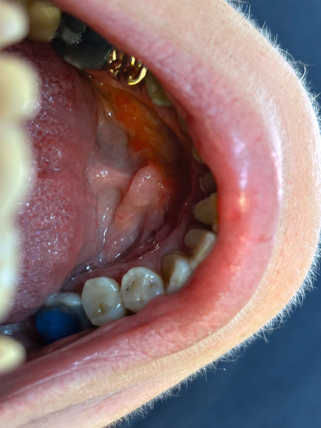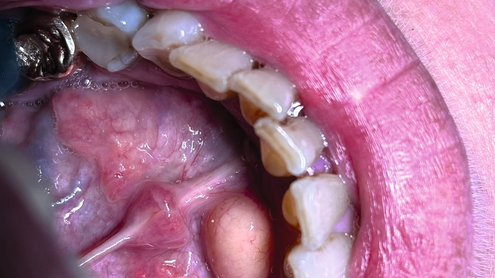 Eine 59-jährige Patientin stellte sich mit einer seit etwa einem Jahr progredient zunehmenden, schmerzlosen Schwellung im Bereich des anterioren Mundbodens in unserer mund-, kiefer- und gesichtschirurgischen Praxis vor. Sie war vom behandelnden Zahnarzt zur weiteren Abklärung und Therapie überwiesen worden. Allgemeinanamnestisch ergaben sich keine relevanten Vorerkrankungen.