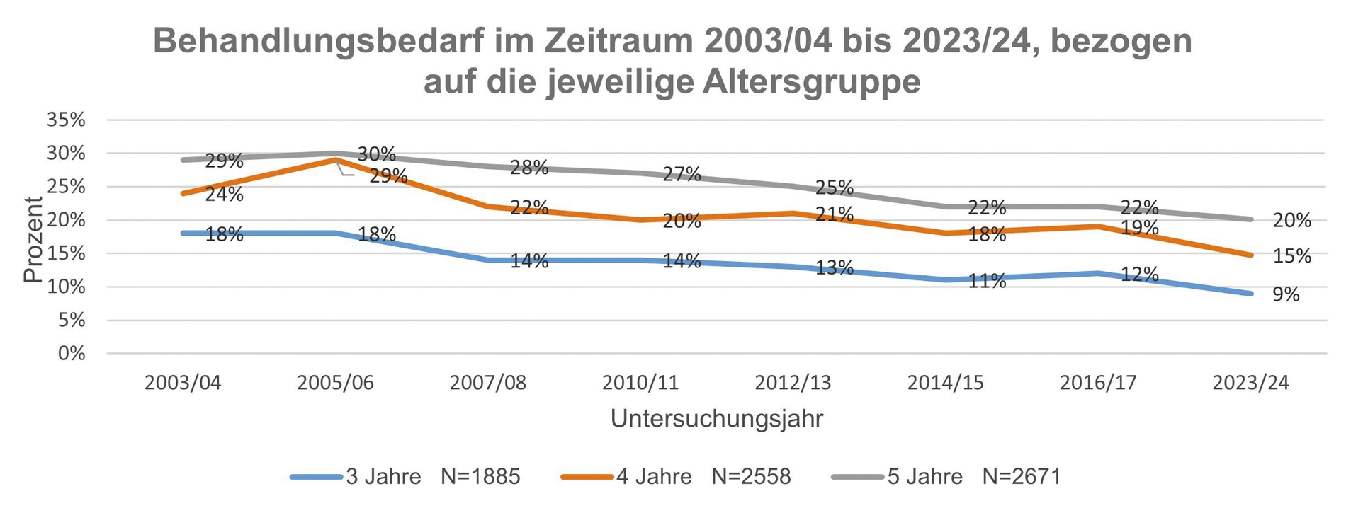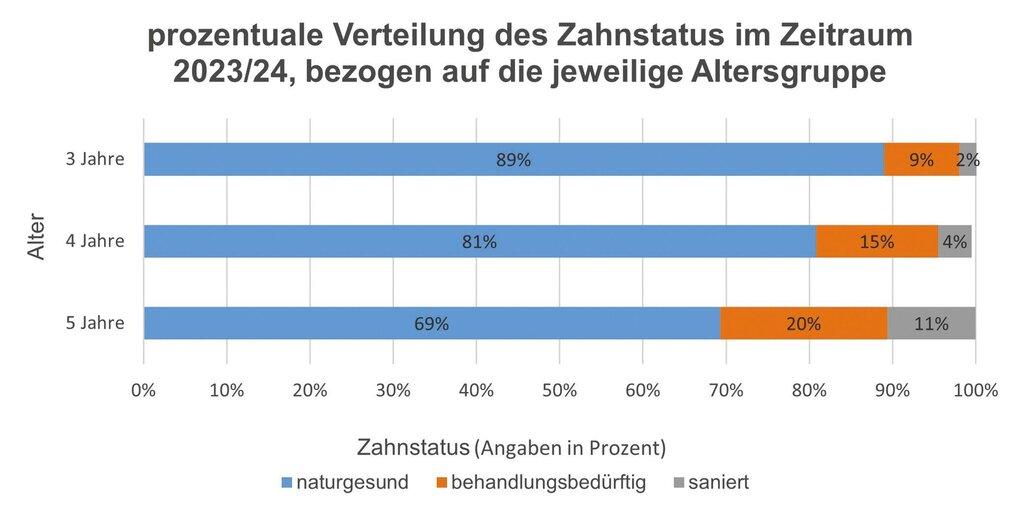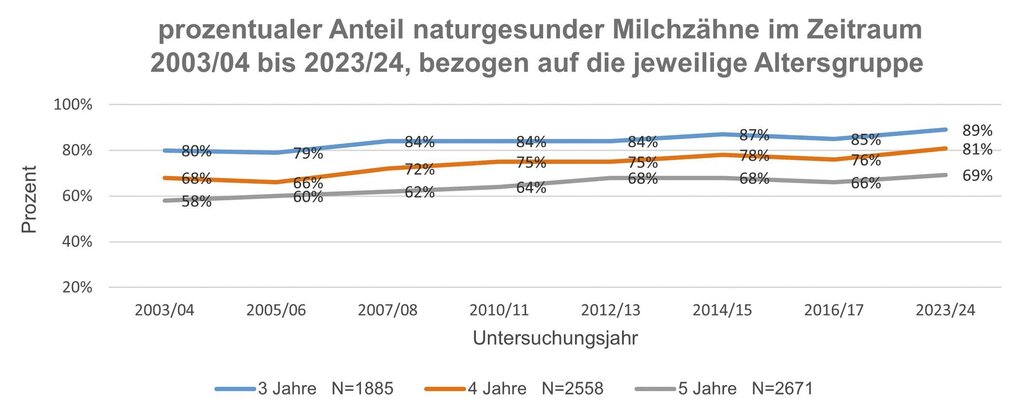 Im Untersuchungsjahr 2023/2024 liegt der Anteil der Dreijährigen mit kariesfreien Milchzähnen bei 89 Prozent – und steigert sich damit im Vergleich zur letzten Querschnittsuntersuchung 2016/2017 um 4 Prozent. Mit zunehmendem Alter sinkt der Anteil naturgesunder Milchzähne: In der Altersgruppe der Fünfjährigen liegt er nur noch bei 69 Prozent.
