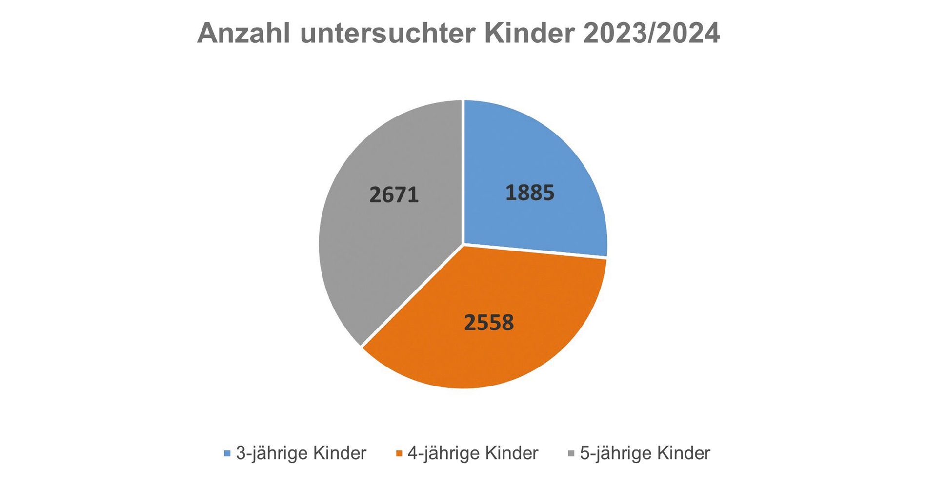Seit 2003 erheben die Zahnärztlichen Dienste der hessischen Gesundheitsämter regelmäßig Daten zur Mundgesundheit von Kita-Kindern dieser Altersgruppen und werten sie aus. Die Untersuchungskohorte bestand im Zeitraum 2023/2024 aus insgesamt 7.114 Kindern, davon waren 1.885 drei Jahre alt. Die Anzahl der untersuchten Vier- und Fünfjährigen war somit deutlich höher (Abbildung 1). Im Vergleich zur letzten Querschnittsuntersuchung 2016/2017 mit 6.900 Kindern stieg die Gesamtzahl der untersuchten Kinder leicht an.