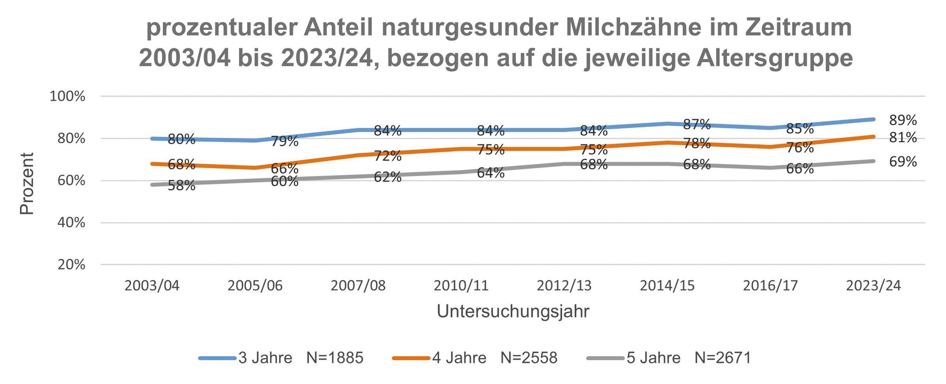 Seit Beginn der Untersuchungen 2003/2004 zeigt sich im zeitlichen Verlauf der Untersuchungsergebnisse ein genereller Anstieg kariesfreier Milchzähne in allen drei untersuchten Altersgruppen (Abbildung 3). Nach einem leichten Rückgang in 2016/2017 sind aktuell die bisher besten Werte der vergangenen 20 Jahre zu verzeichnen.