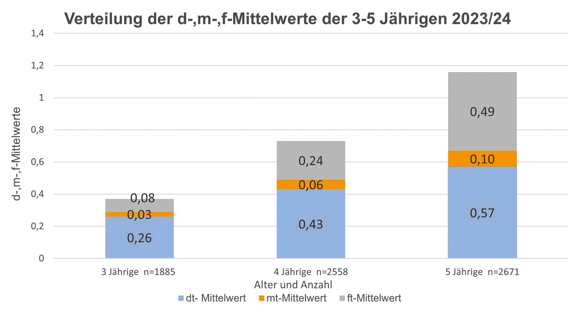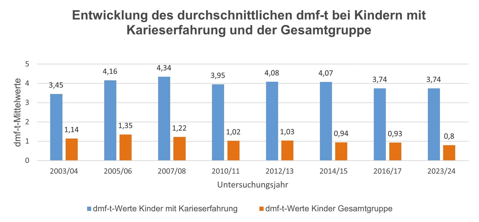 Im Verlauf der vergangenen Untersuchungsjahre zeigt sich eine deutliche Polarisierung bezüglich des Kariesbefalls in den Kohorten. Aktuell weisen jeweils 11 Prozent der untersuchten Kinder aller drei Altersgruppen ein erhöhtes Kariesrisiko auf. Der dmf-t-Mittelwert für Kinder mit bereits bestehender Karieserfahrung liegt um das etwa Fünffache höher als im Vergleich zur Gesamtgruppe der Untersuchten.