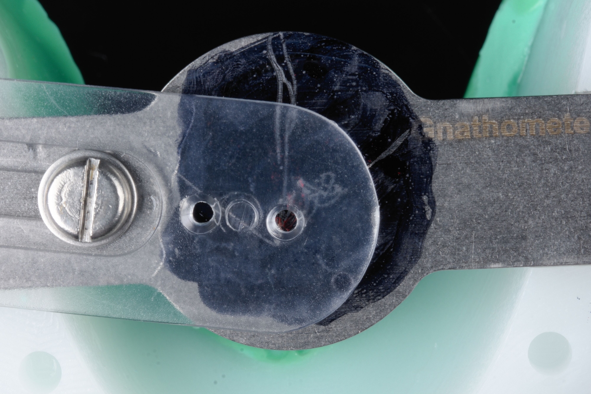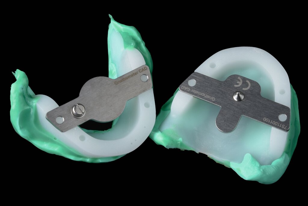 Nach Färbung der Schreibplatte mit einem Permanentmarker und Eingliederung der 3D-Bite-Plates erfolgte eine klassische Stützstiftregistrierung: Nach initialer maximaler Protrusion folgten die maximale Retrusion und schließlich die maximale Rechts- und Linkslaterotrusion. Wichtig war dabei, dass sich die 3D-Bite-Plates zu keinem Zeitpunkt berührten. Nach Abschluss des Registrats erfolgte die Kontrolle (und gegebenenfalls die Reproduktion des Registrats). Im Anschluss wurde die ermittelte Position (Pfeilspitze bis einen Millimeter dahinter) mittels Plexiglasrondell und Feststellschraube des Gnathometer-CAD fixiert (Abbildung 11). Wenn gewünscht, kann zusätzlich eine Komfortprobe nach zwei, fünf und zehn Minuten erfolgen.