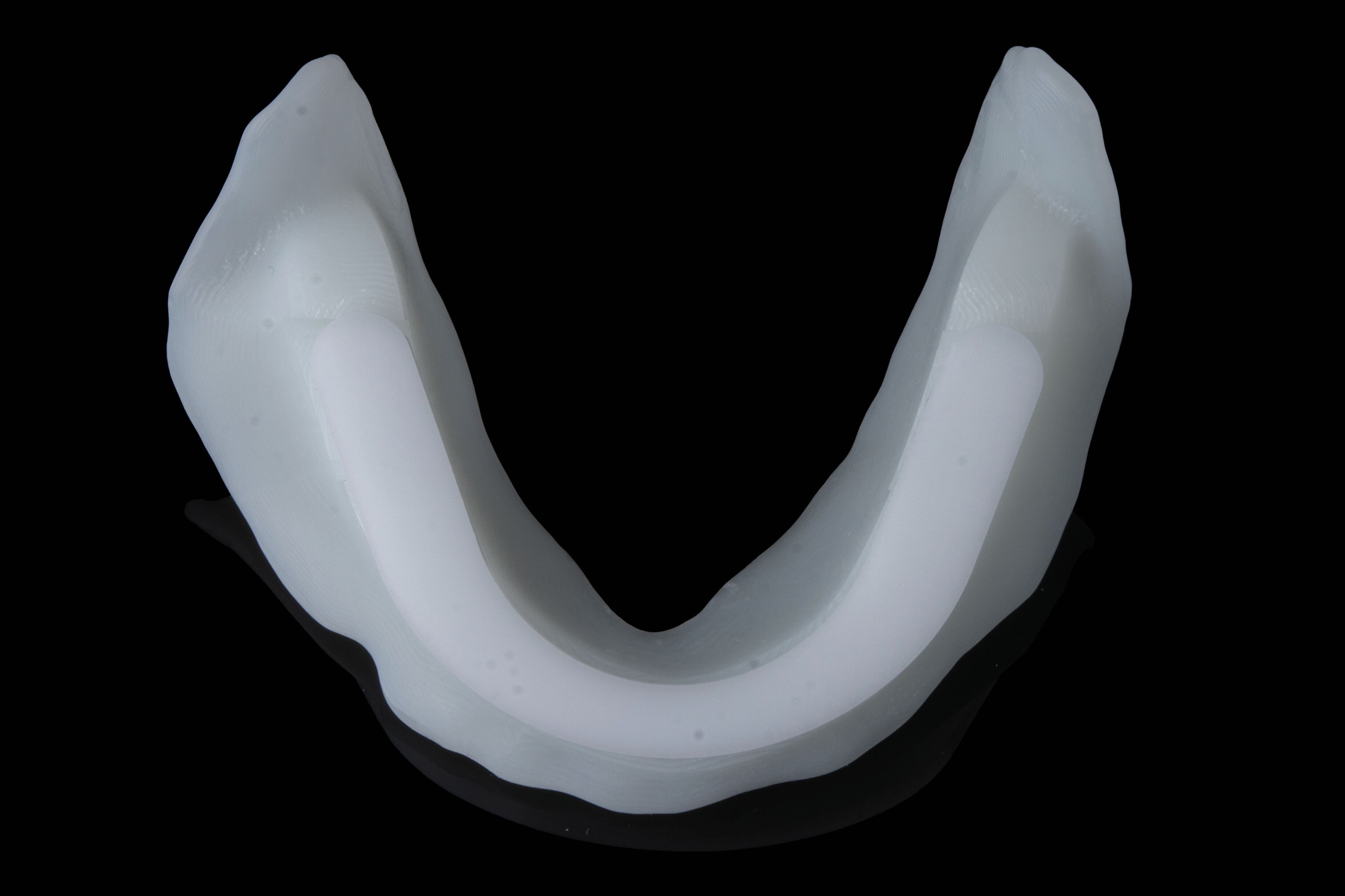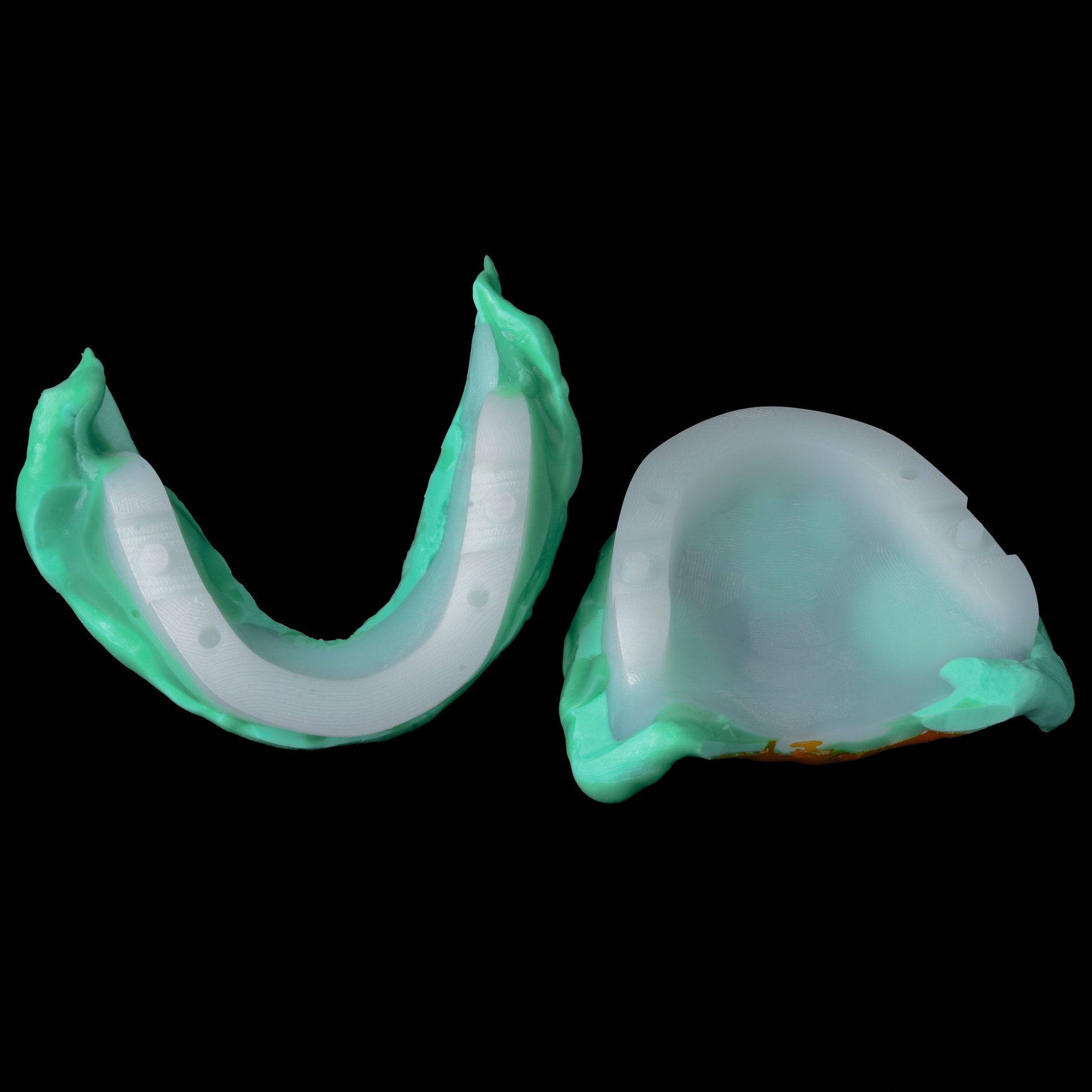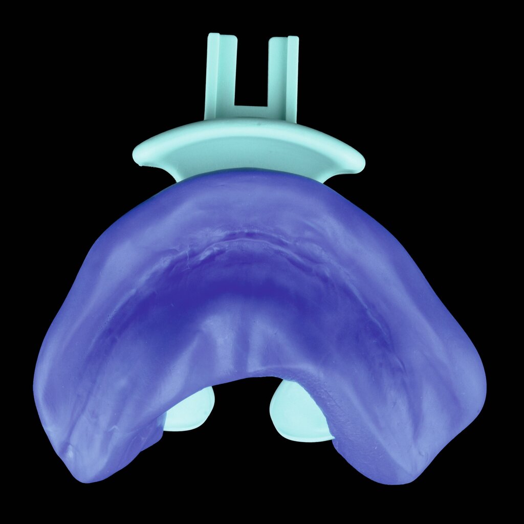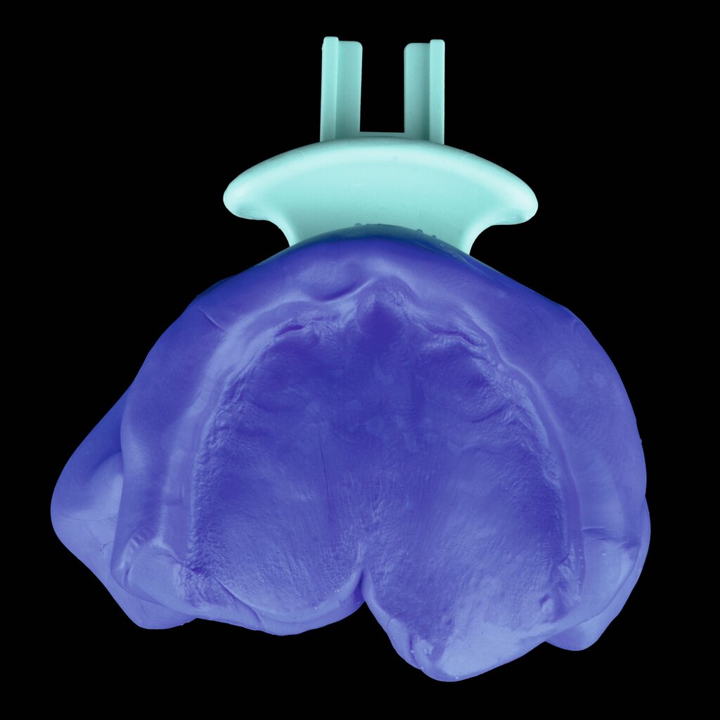 Es folgten die Montage und die Anprobe des Centric Trays am Patienten (Abbildung 3a). Im Anschluss wurde das Centric Tray mit einem Silikon (Virtual Putty Fast Set, Ivoclar Vivadent) für den Unterkiefer befüllt. Dieser sollte so weit gefasst werden, dass eine reproduzierbare Zuordnung auf den Scans der Situationsabformungen möglich war. Nun wurde der obere Anteil des Centric Trays befüllt und auf dem Unterkiefer repositioniert. Vor der Aushärtung des Silikons schloss der Patient den Mund, bis der zuvor ermittelte Abstand erreicht war (Abbildung 3b). Damit die CAD-Software die entnommene Vorbissnahme den digitalen Situationsmodellen zweifelsfrei zuordnen konnte, mussten ausreichend große Flächen des Unterkieferkamms abgeformt worden sein (Abbildung 4).