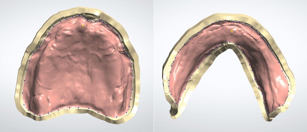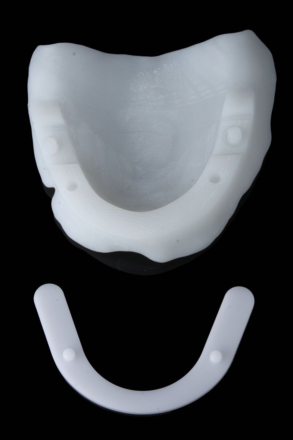 Neben der subtraktiven Herstellung durch eine Fräsmaschine war eine additive Fertigung durch 3D-Druck ebenfalls denkbar, ein Export im gängigen Format *stl erleichtert den Absprung in alternative Fertigungsstrecken. Potenzielle Fehlerquellen oder Gestaltungsfragen konnten mit der Anprobe vor der definitiven Fertigstellung gefunden beziehungsweise ausgetestet und nachgebessert werden. Exemplarisch seien hier Inkongruenzen zwischen Tegument und Prothesenbasis (hohlliegende Areale, fehlender Saugeffekt) sowie Mängel in der Okklusion oder Kieferrelation, Gestaltung des Bukkalkorridors, die dorsale Extension der Prothesenbasis sowie die ästhetischen Aspekte der Frontzähne genannt.